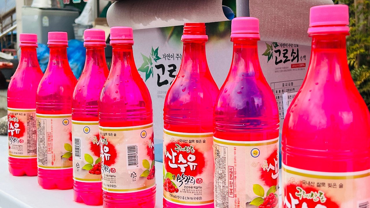산수유의 붉은 열매를 본뜬 막걸리입니다. 색이 독특합니다. 그 내용물의 색은 어떠할까요? 그런 생각을 갖고 있었는데, 일행분 중 한 분이 얼렁 가게에 뛰어가서 검은 봉다리 가득 이 막걸리를 구입해서 당당하게 걸어오셔습니다. 각자 두병씩 주셨습니다. 집에 와서 마셨는데 이 책이 핑크 와인색이었습니다. 그 색보다는 막걸리의 주원료인 물이 지리산 줄기에서 내려오는 게르마늄 바위틈으로 흘러 내려온 물로 만들었다는 것입니다. 생각에는 한라산의 암반수 보다 더 맛난 물로 담근 막걸리가 한라산 막걸리보다는 몇 수 위라는 생각을 했습니다.