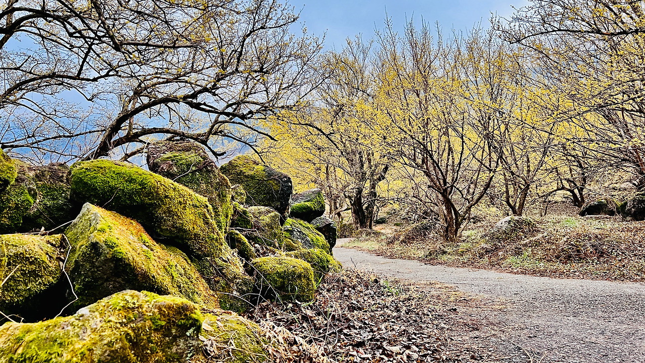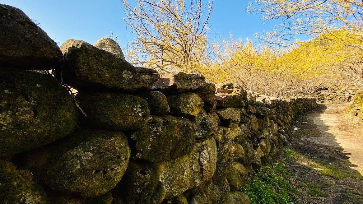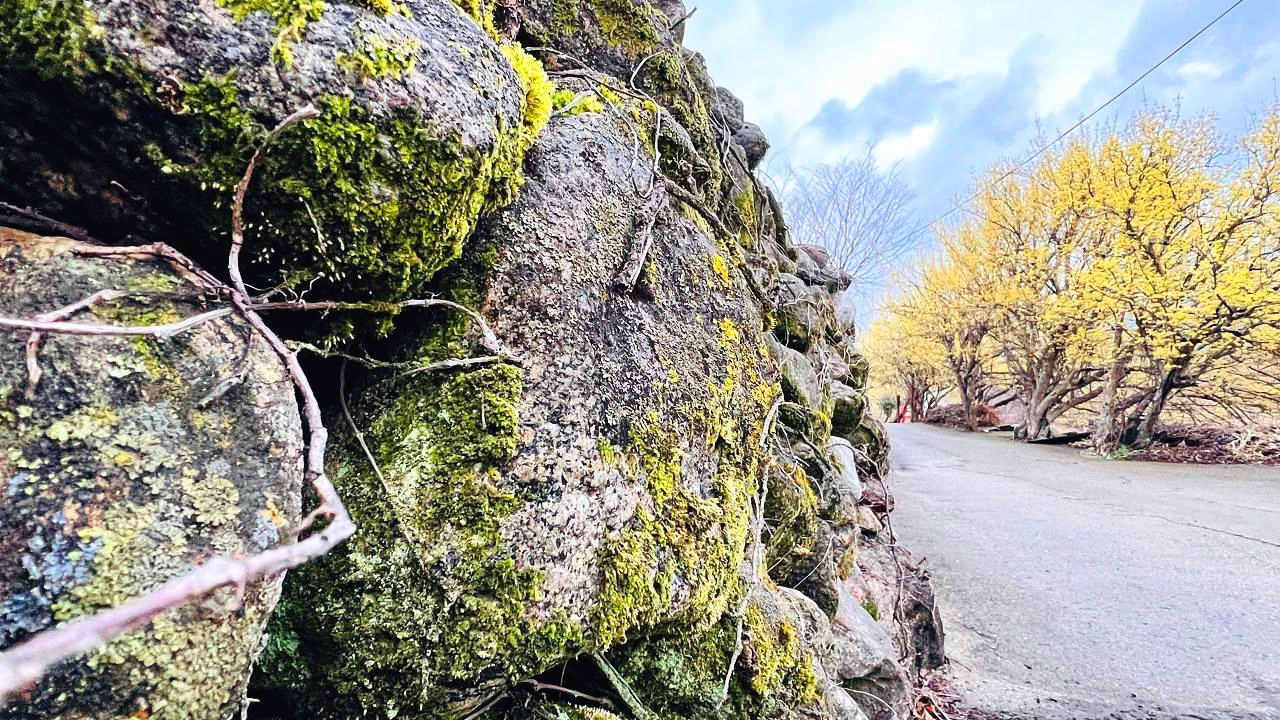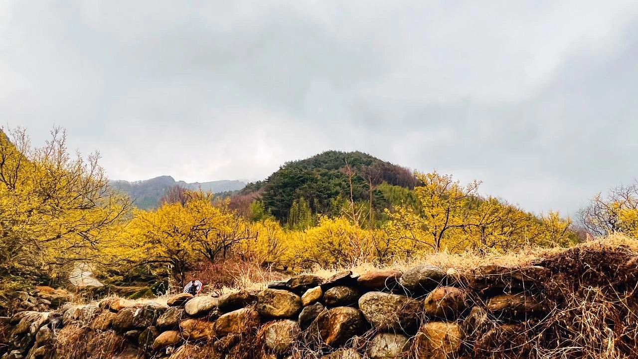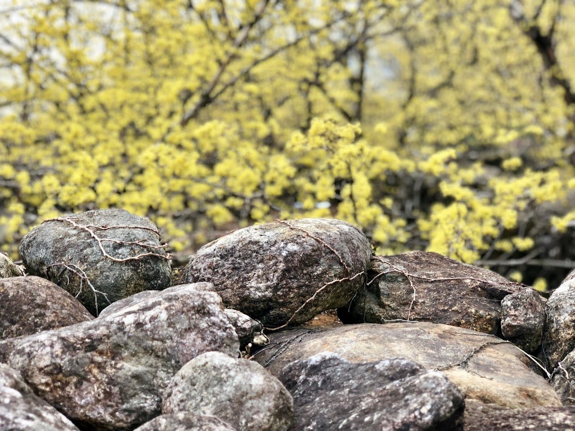 상위마을의 가장 큰 특징은 사람이 많이 없다는 것과 이 아름다운 큰 돌담길들이 많이 있습니다. 콘크리트가 다소 방해될 수 있지만 이끼가 낀 파릇한 바위 사이로 들어오는 노오랑 산수유는 마음을 편안케 합니다.