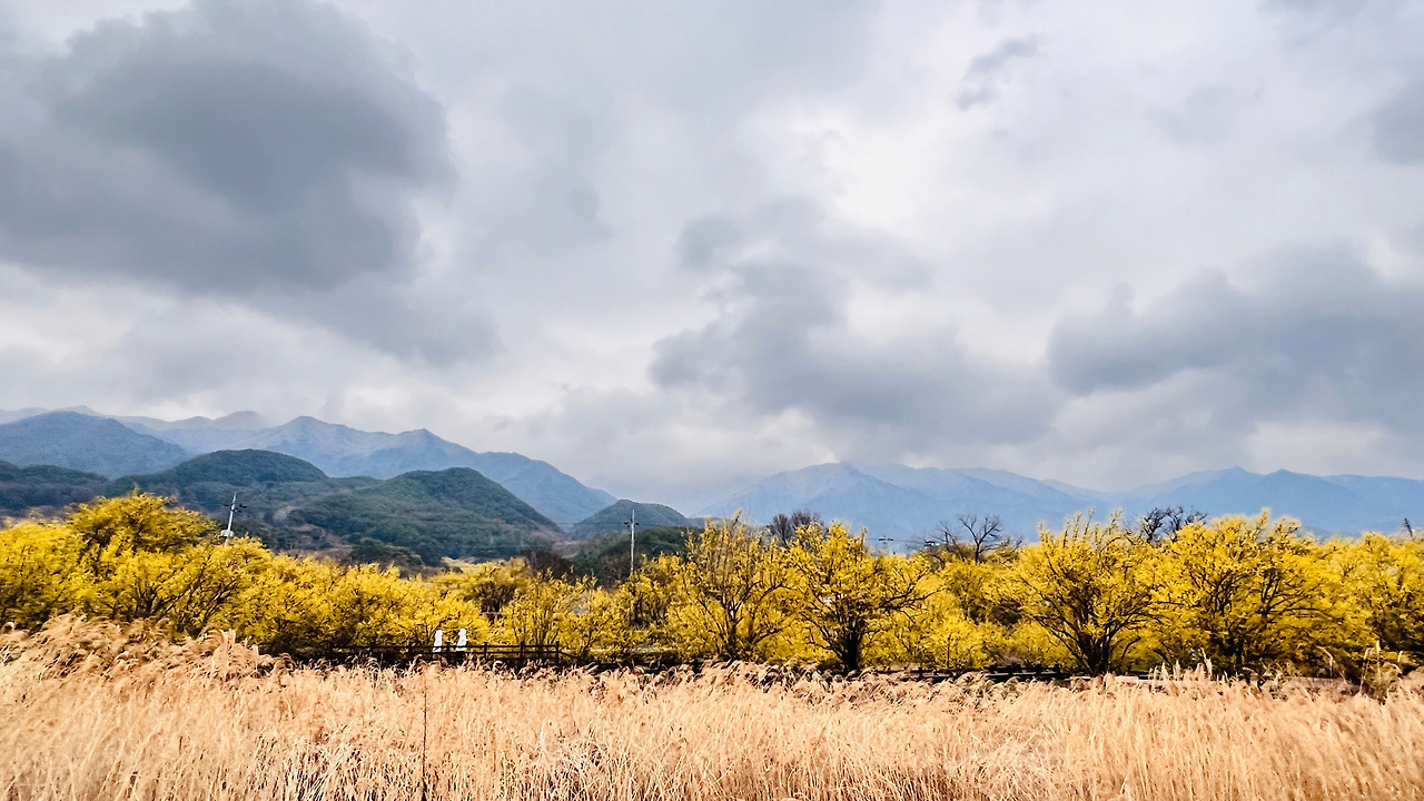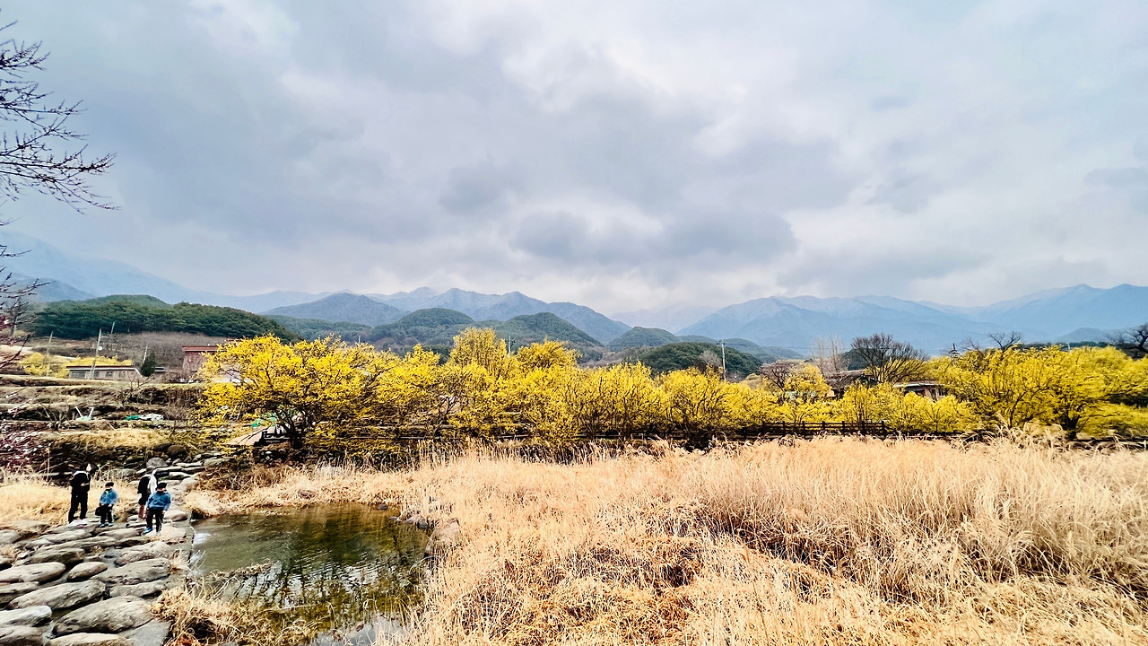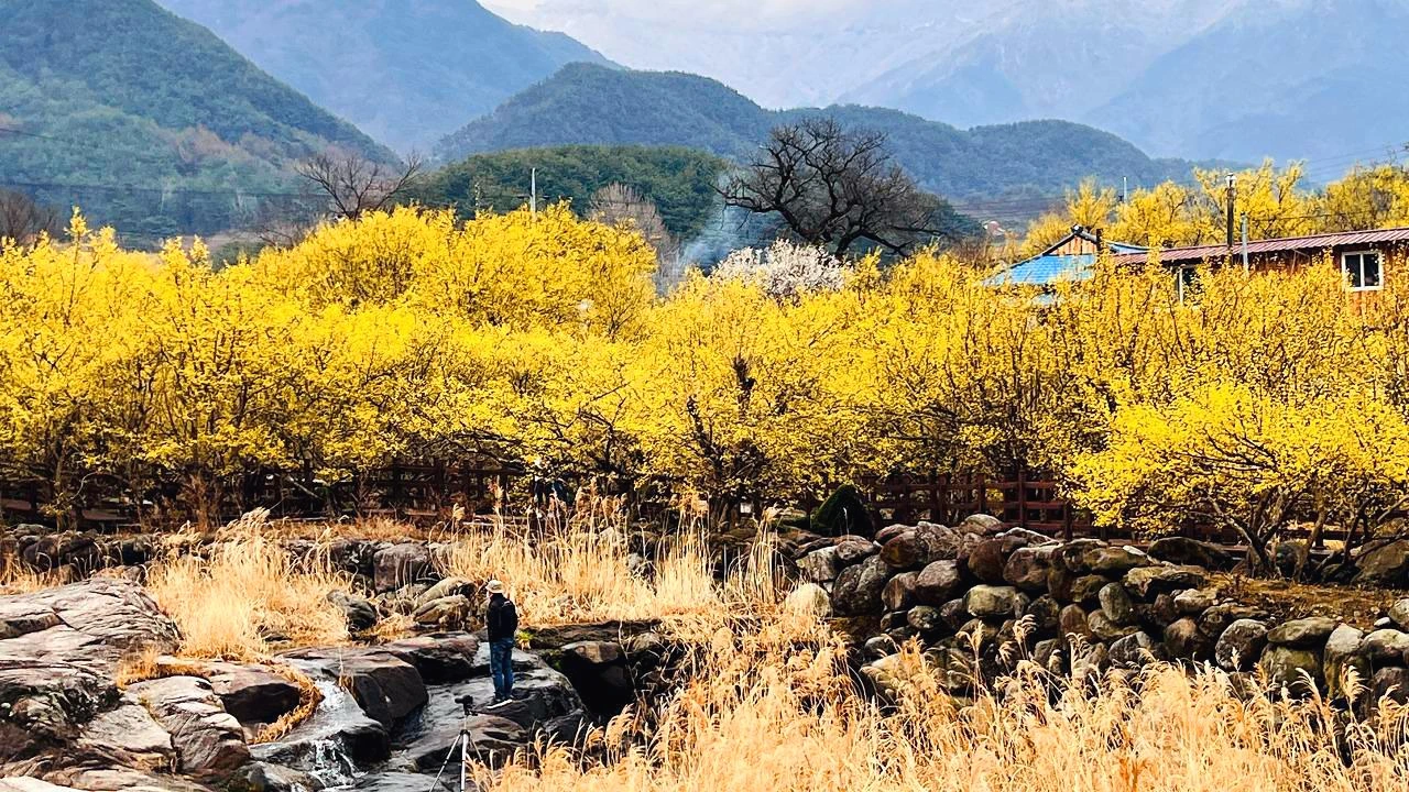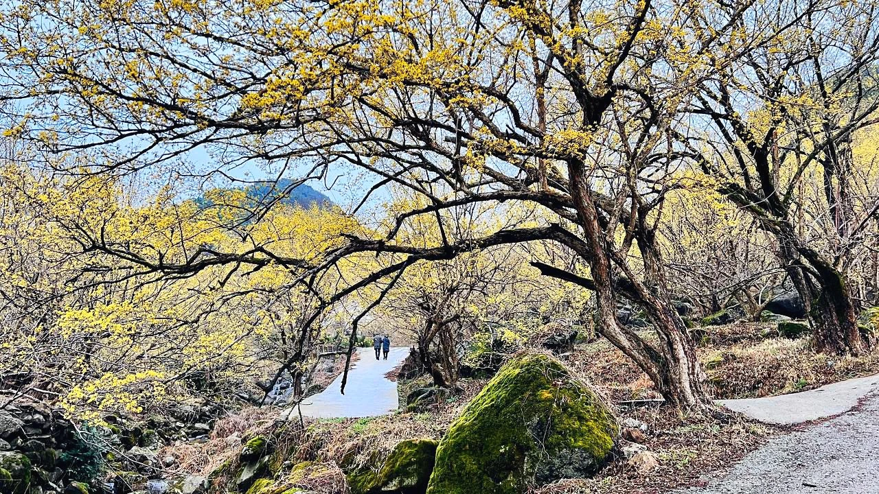 전남 구례의 산수유는 우리나라 산수유 생산량의 70%를 차지한다 합니다. 산수유마을의 이야기에 의하면 천 년 전에 중국 산둥지방의 처녀가 구례에 시집오면서 가져온 산수유가 퍼져나가면서 산수유 마을이 되었다고 전해집니다. 산동면의 산동마을과 산둥지방의 산둥은 어딘가에도 닮은 감이 오는 이유겠지요. 최근에 반곡마을 대음교의 위쪽과 아래쪽에 나무 데크를 만들어 오고 가는 사람들이 편하게 산수유길을 걸을 수 있도록 조성되어 있고 유아나 노약자에게도 걷기가 좋습니다.