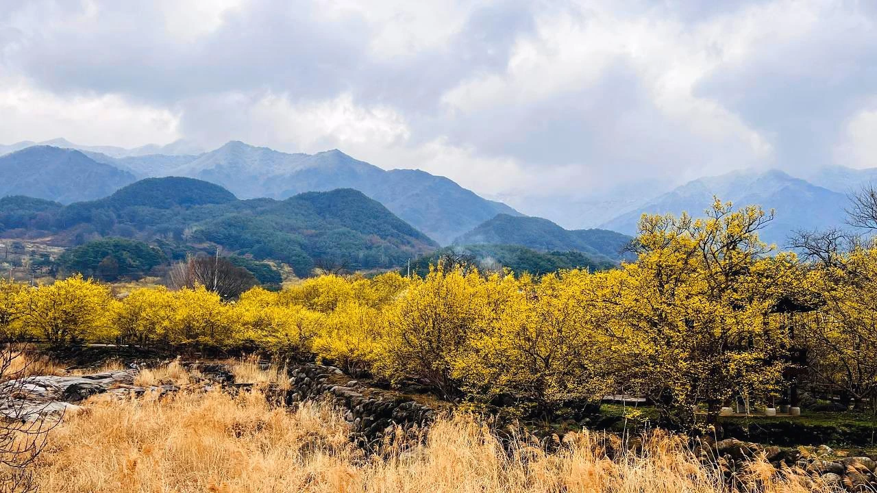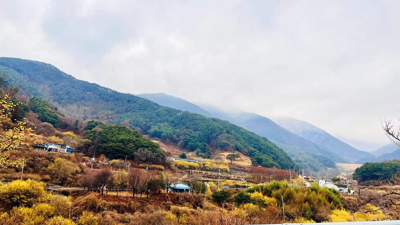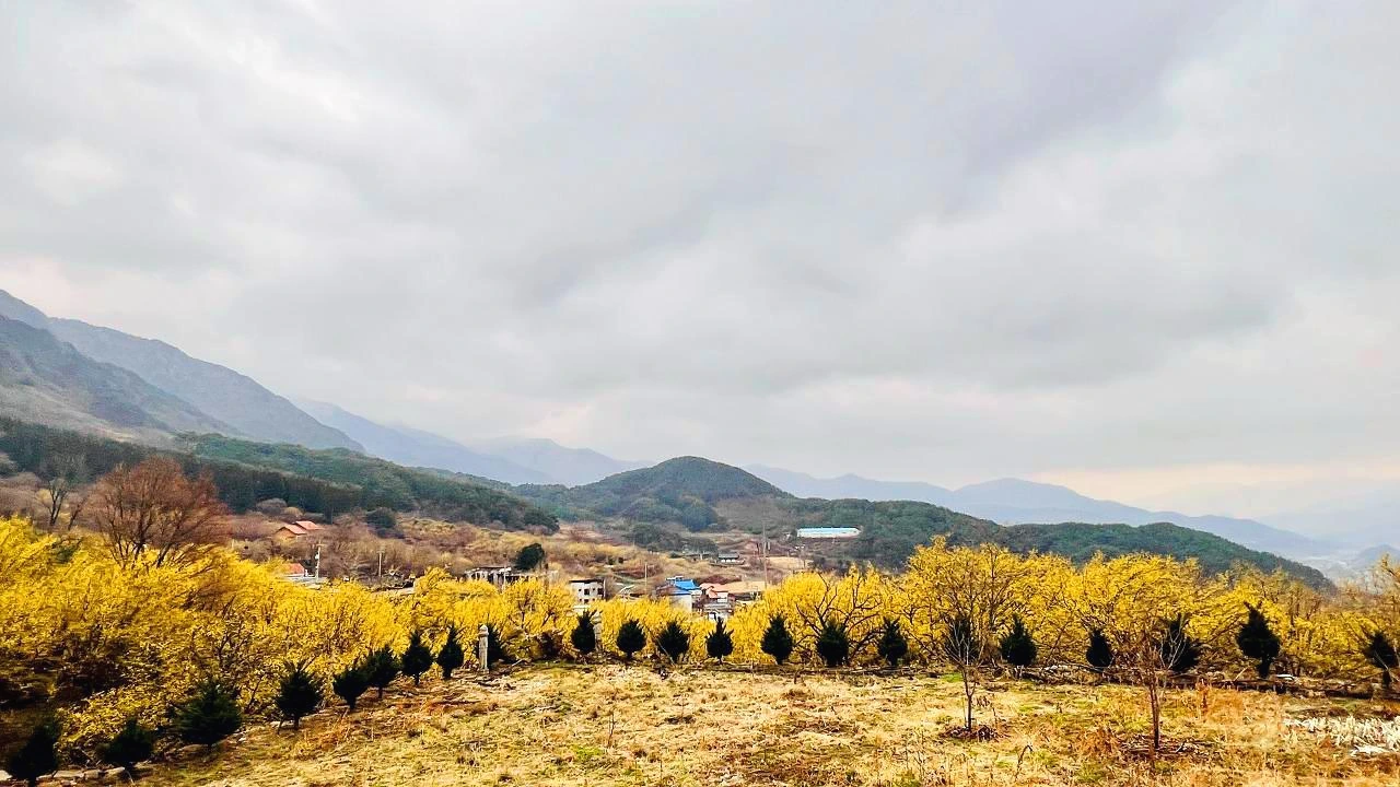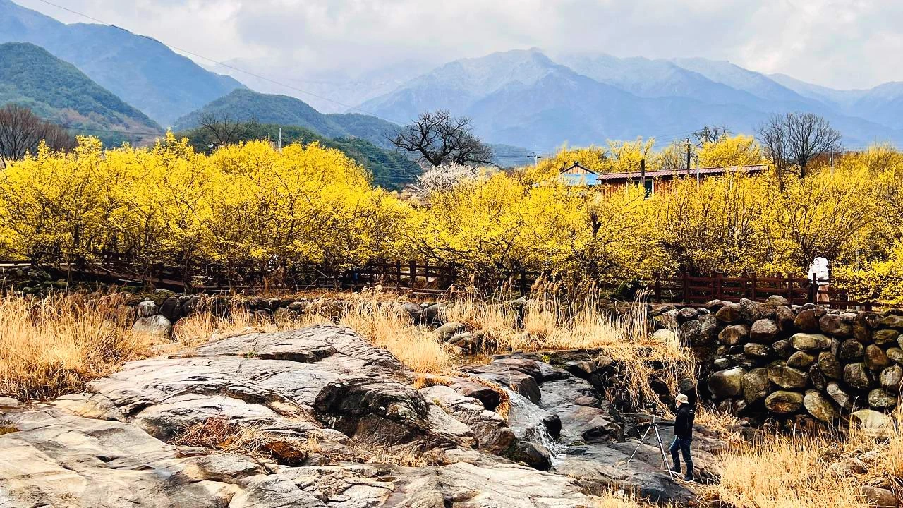 돌담길을 따라 올라가서 산유정으로 가는 길을 가다 보면 언덕 위로 오르는 작은 길이 보입니다. 그쪽에서 마을 아래로 내다 보입니다. 우리가 간 전날과 당일 날 기온이 내려가서 지리산 자락에는 눈이 왔습니다. 눈으로 덮힌 하얀 산과 함께 노랑색이 절묘하게 어울려서 한 폭의 수채화를 연상케 하는 풍경이 펼쳐졌습니다. 일행들이 무리하여 산수유마을을 가지 않아도 좋다고 했는데, 내가 운전을 했기에 부담을 주지 않으려고 했던 것 같습니다. 여하튼 제가 일행분들을 모시고 산수정 아래 동네에 주차를 했습니다. 그 시간에는 이미 5시가 넘어서 통제는 안 하고 있고 이쪽으로 차량을 진입할 수 있었습니다. 항상 산수유 피는 계절에는 일방통행이면서 차량이 다소 밀리는 구간이 많이 있습니다. 해가 지는 시간이 6시가 넘어서니깐 1시간 이내에 둘러보아야 하는 부담이 있습니다. 윗마을은 산아래라 어둠이 빨리 오고 하위 마을로 내려가면 아직 해가 지지 않은 채 다소 밝아 보였습니다. 그때가 오후 6:20분 정도 되었으니 시간을 잘 조절하고 속보로 걸어서 다니시면 하위 마을도 구경이 가능한 거지요.