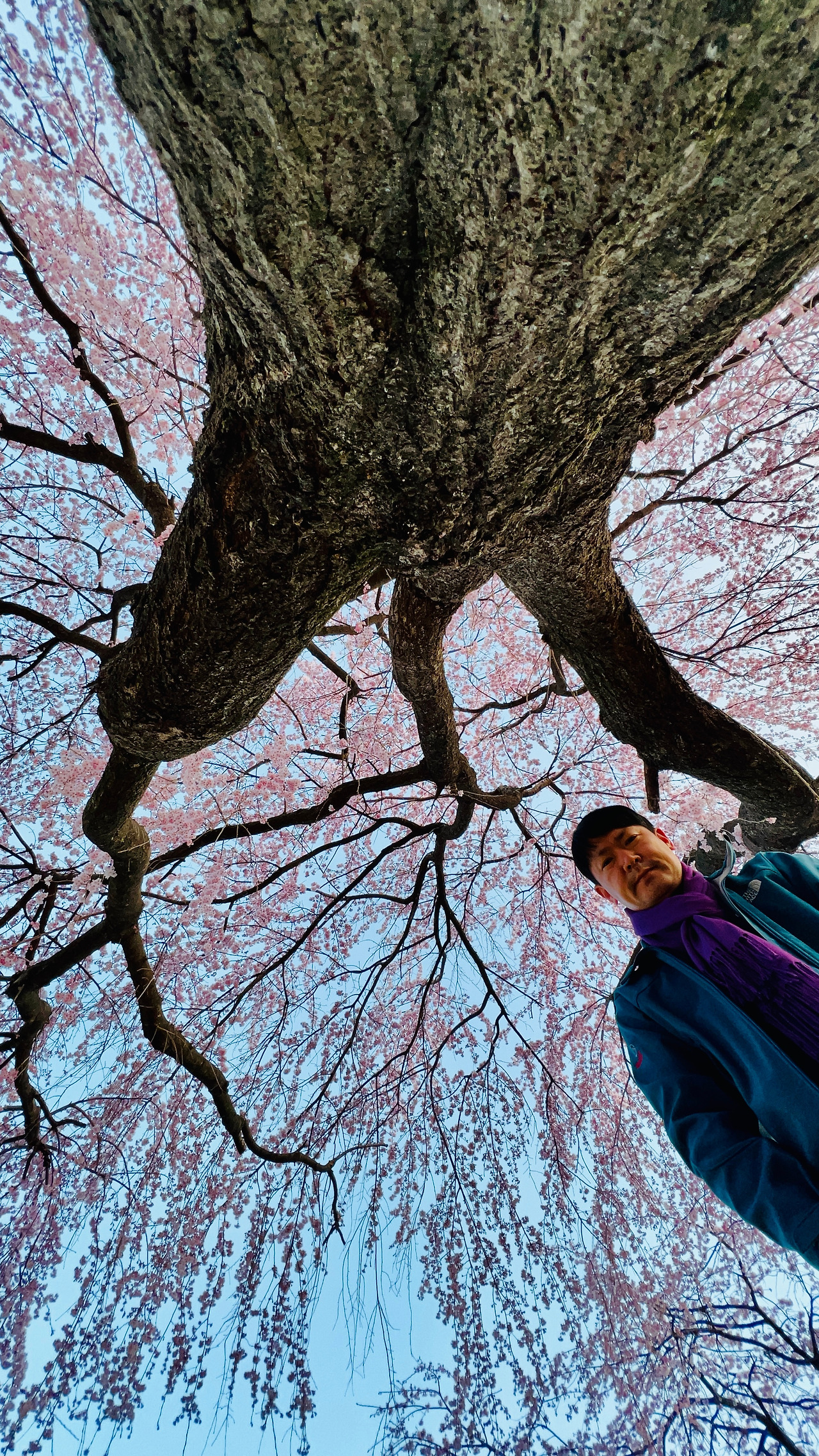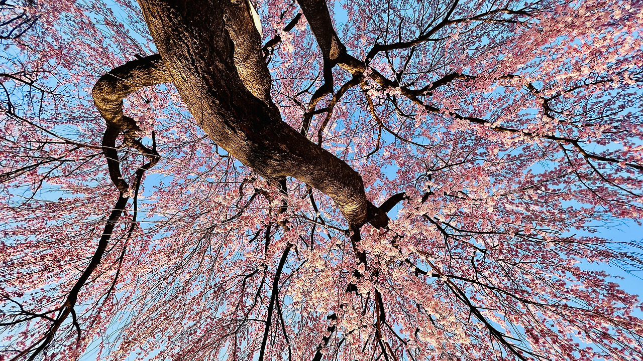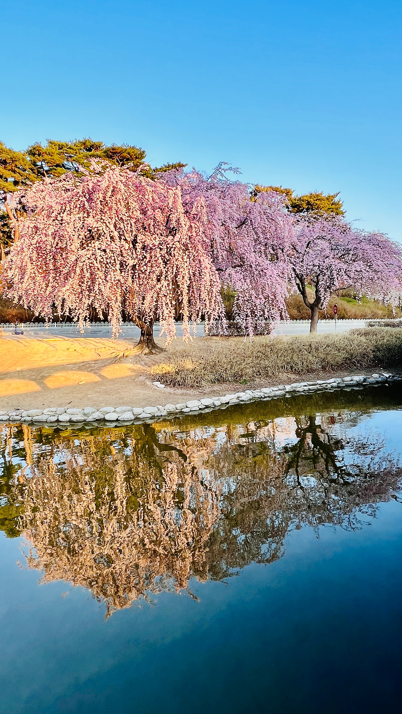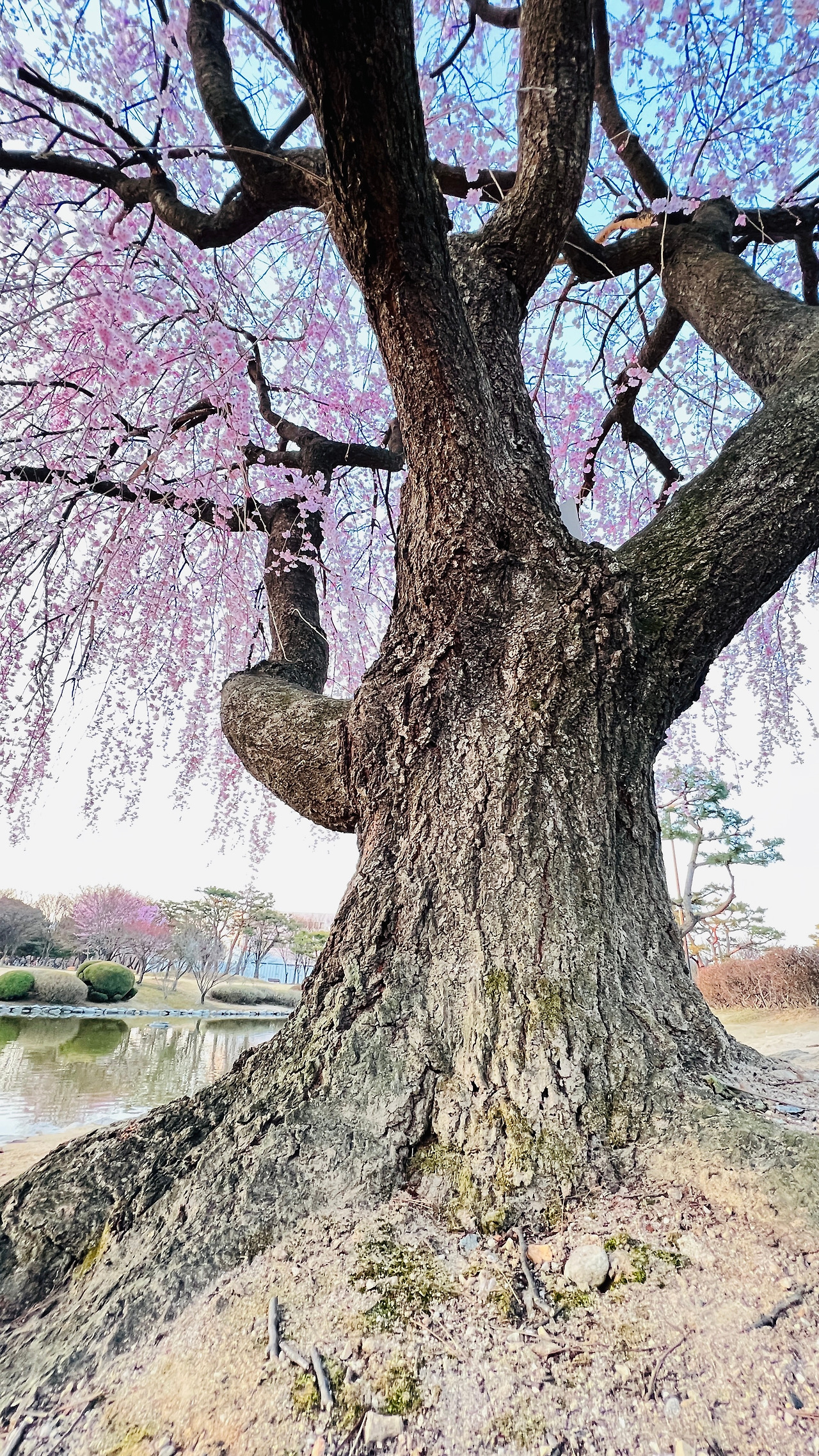 능수 벚꽃, 수양벚꽃은 수양버들처럼 늘어져 있다. 고고하게 많이 흔들리지 않는 일반 벚꽃에 비하면 능수벚꽃은 한들한들 가녀린 몸짓으로 미세한 바람에도 몸부림을 친다. 그 자태를 한참을 바라보고 있노라면 그들을 설득하기가 쉽지 않다. 연못 옆에 서 있는 두 나무는 가장 볕이 좋은 곳이며 연령이 오래되어 보인다. 그 겨울들의 추위에도 여름들의 태풍에도 당당하게 살아온 세월을 연분홍 꽃으로 보여준다.