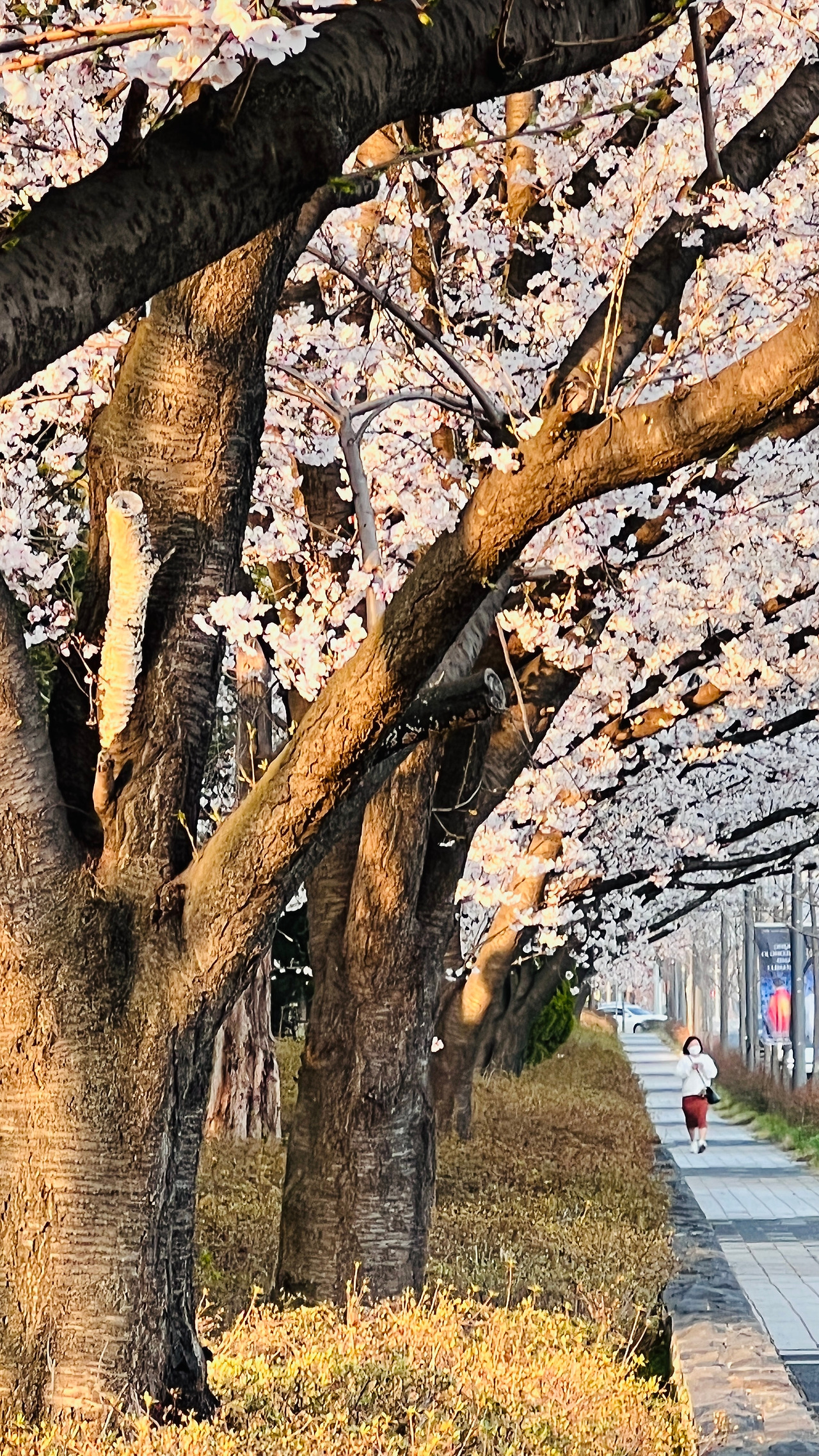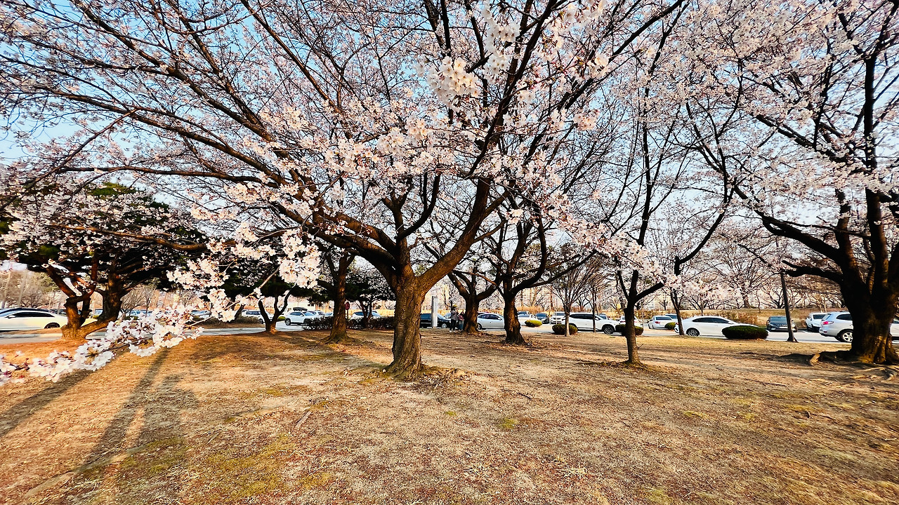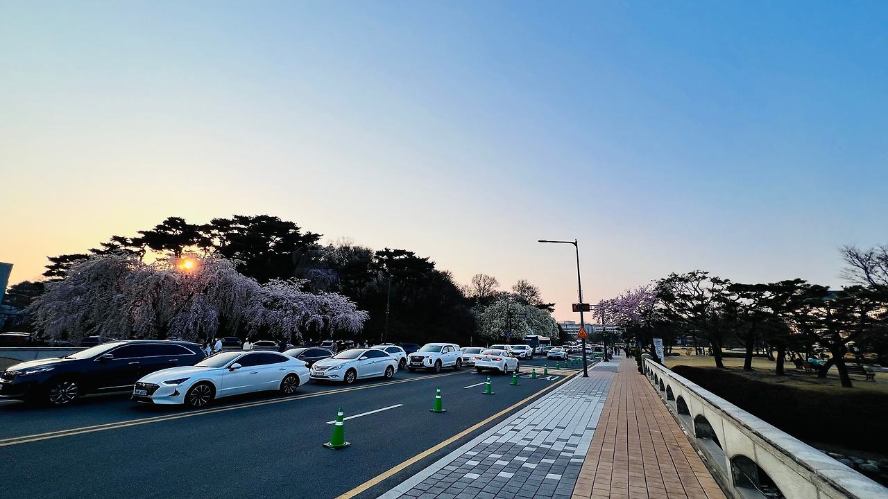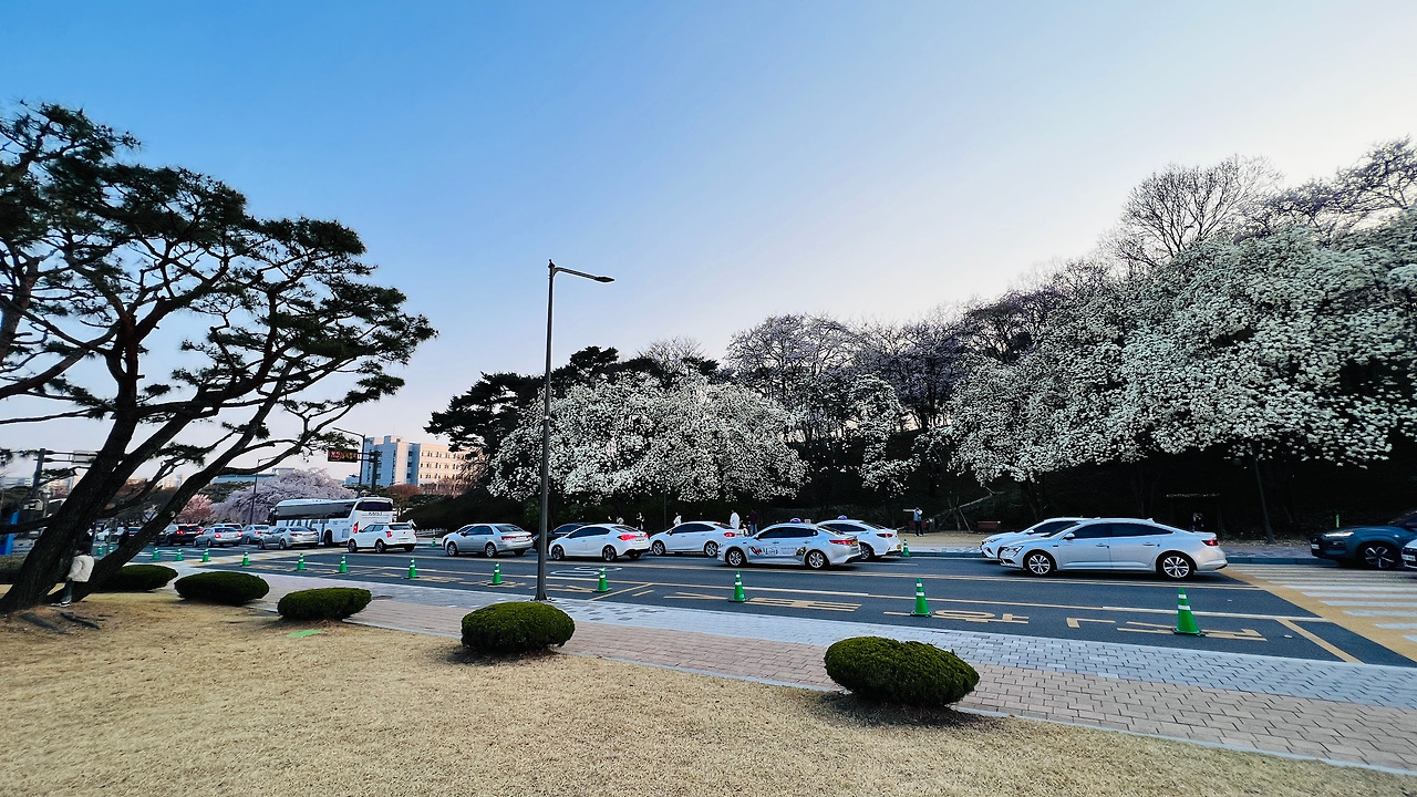 아침에 보았던 그 연분홍빛의 수양벚꽃이 이제는 하이얀 색의 일반 벚꽃들의 모습으로 되어 있다. 없던 차량도 빈틈없이 빽빽하게 줄지어 세워져 있다. 인기를 독차지한다. 자세히 보면 여기 나무 아래에서 차례로 사진을 찍기 위해서 줄을 서 있다.