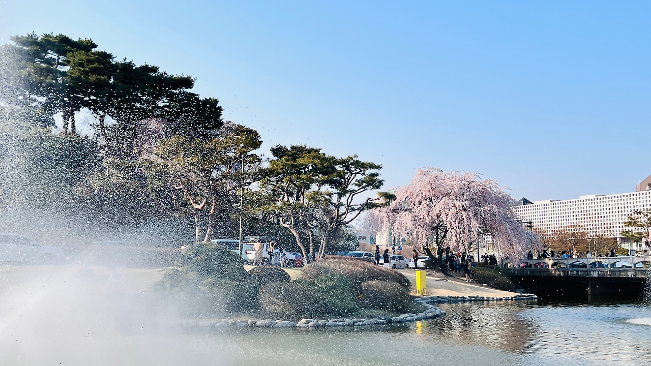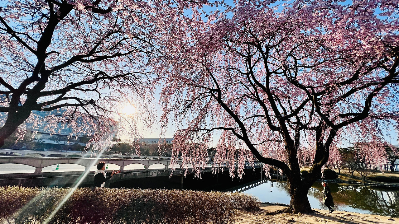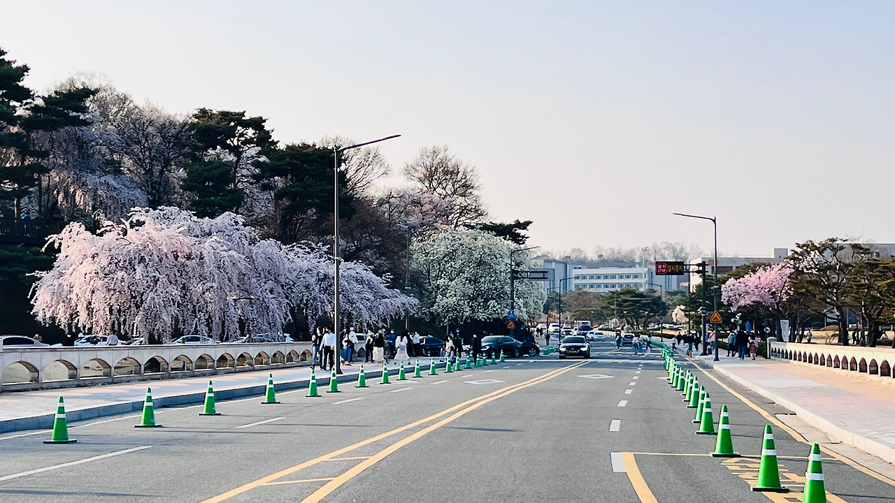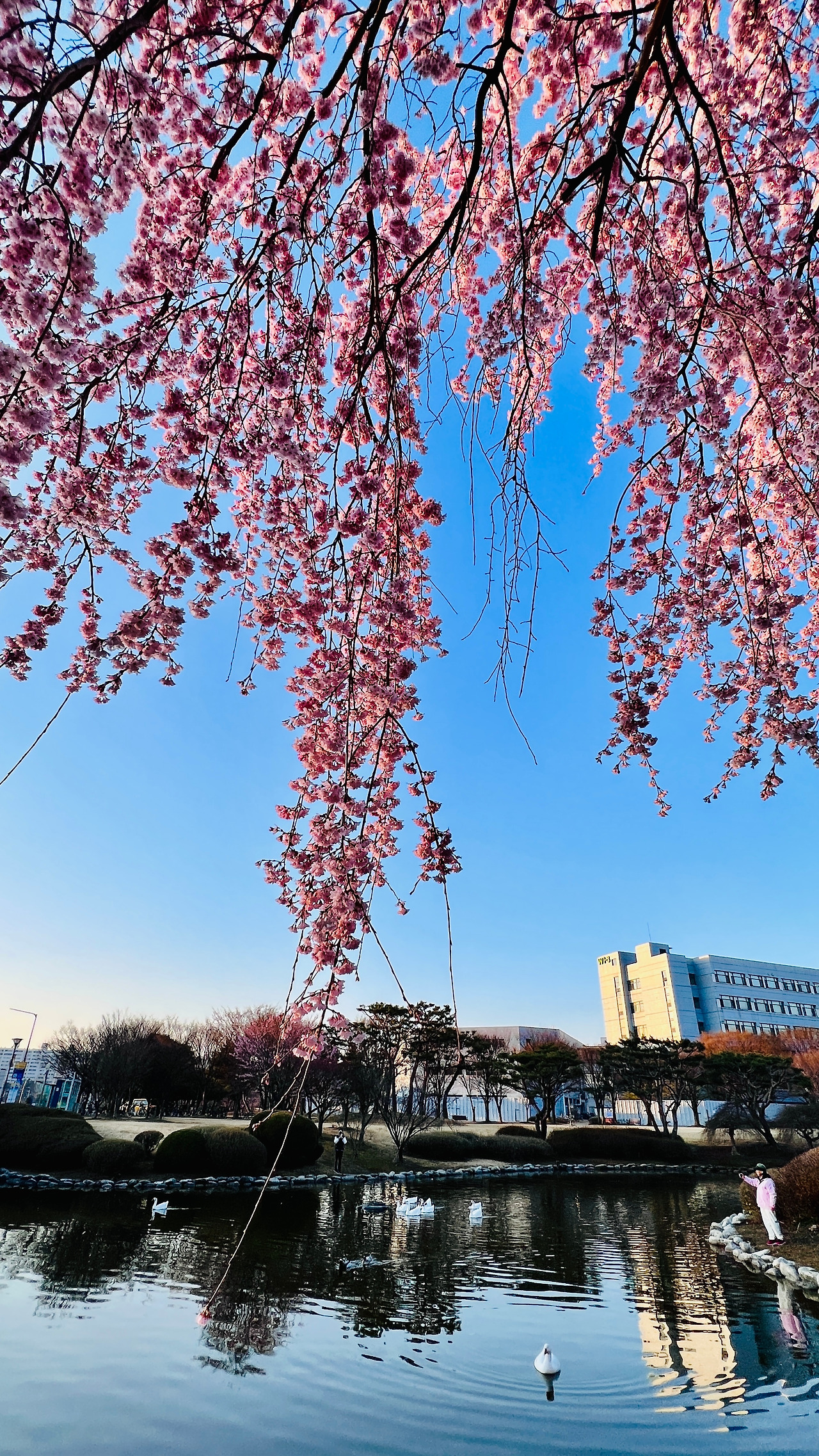 정문에서 오리연못을 건너는 다리이다. 왼쪽에 있는 나무가 능수벚꽃이다. 일과가 끝나는 시간이라 여기 학생이 아닌 일반 젊은 분들이 많이 보인다.