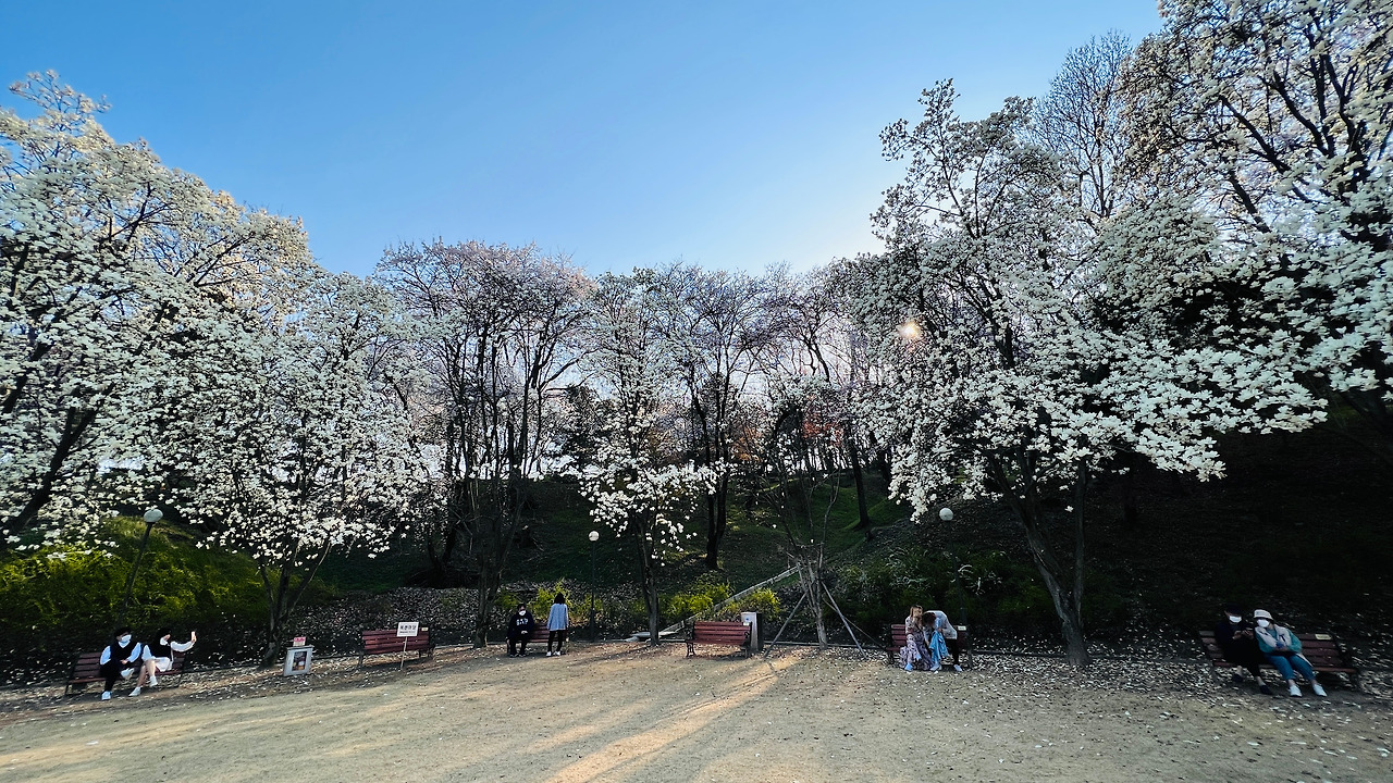 일반적인 사람들은 그 나무 앞에 서서 꽃과 함께 사진을 찍으려 애쓴다. 건너편 멀리에서 찍으면 더 아름다운 넓은 시야를 확보할 수 있다. 그리고 얼굴에 빛이 들어가야 스폿라이트를 받아 얼굴이 살아난다. 나무 그늘진 아래로 아래로 모두 들어가서 어둡게 찍는다. 꽃들도 햇빛을 받아야 더욱 이쁘다. 그늘진 곳의 꽃나무들은 늦게 펴서 빨리 진다.