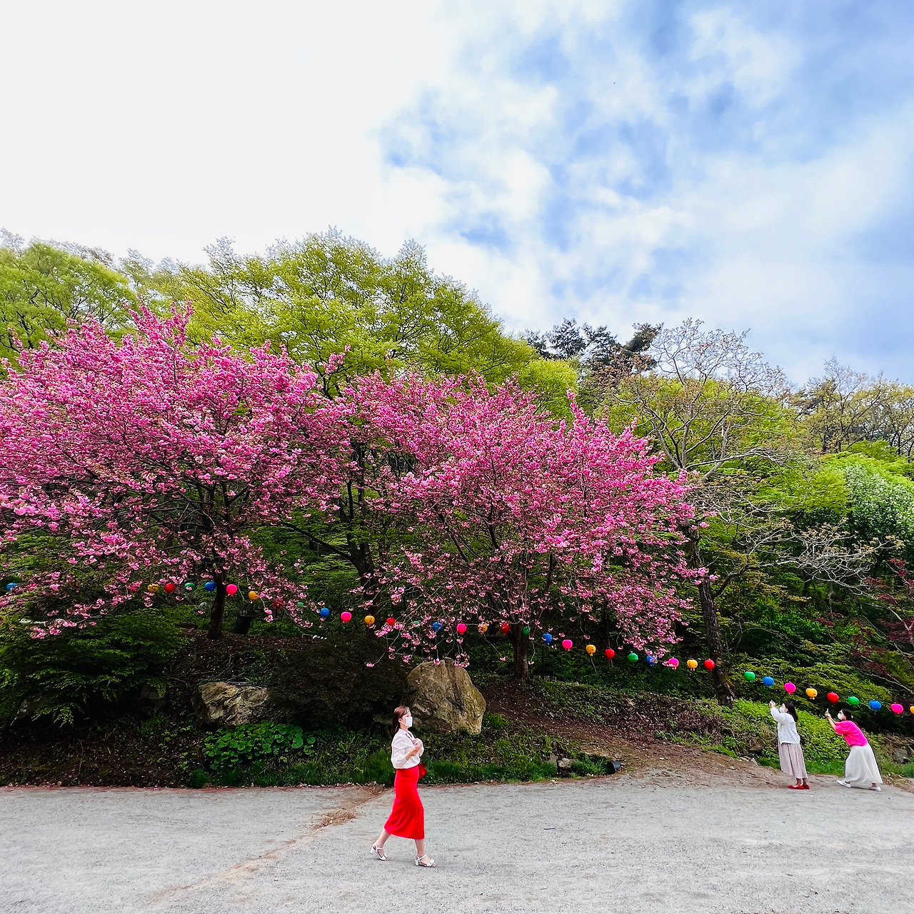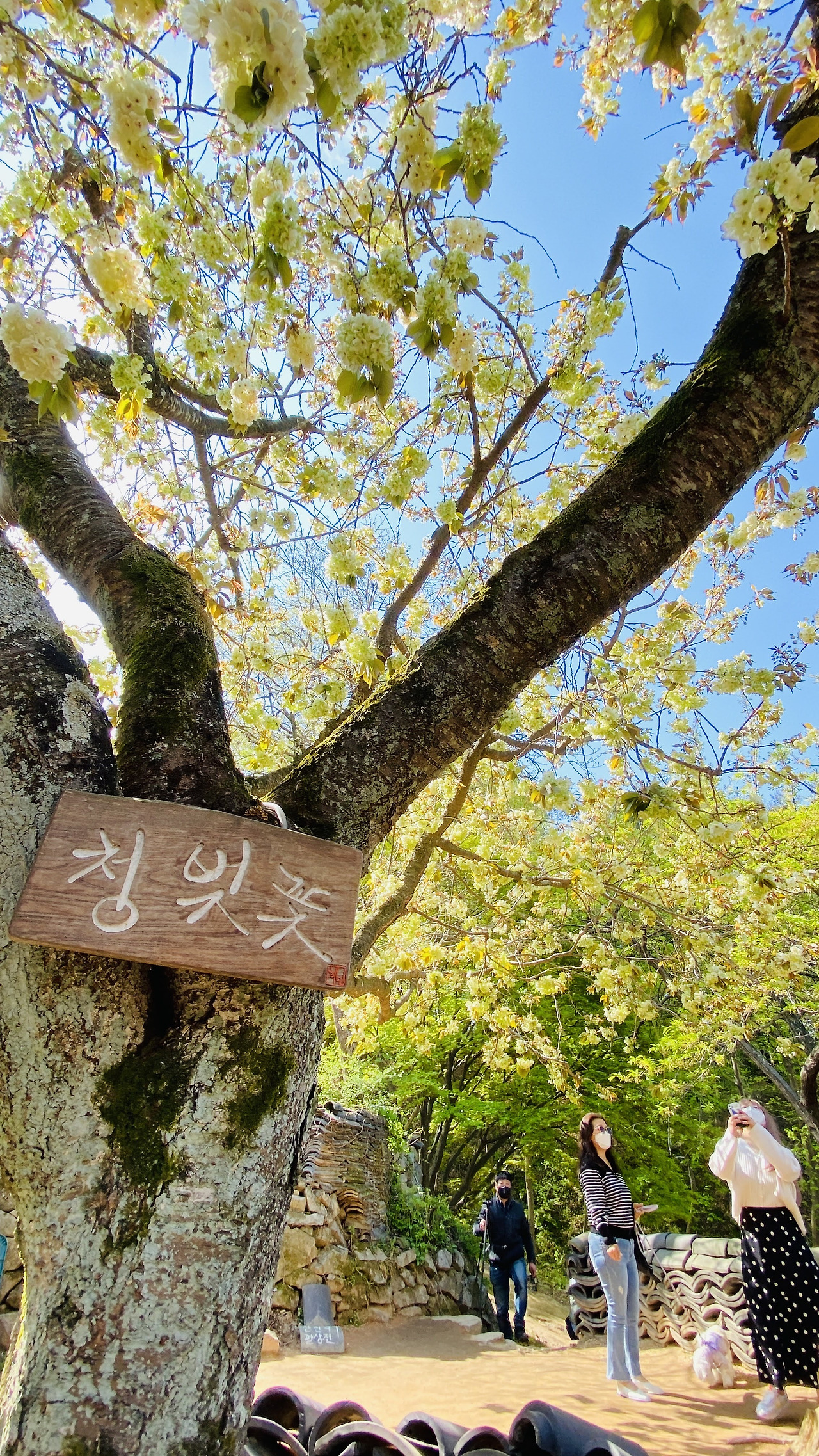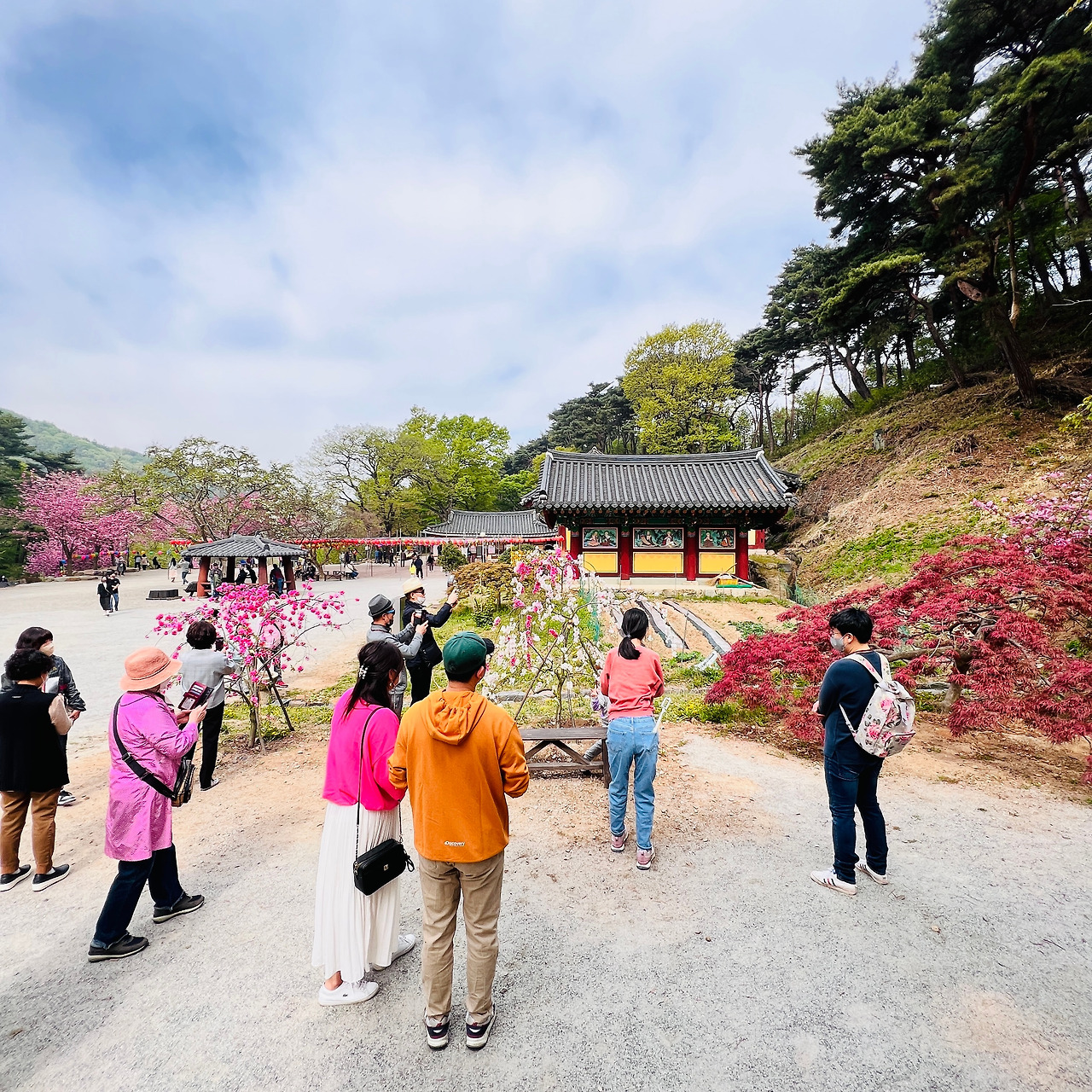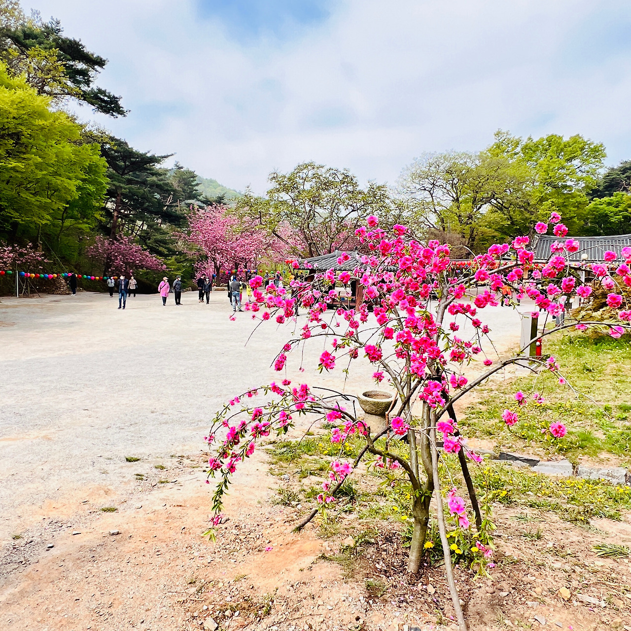 문수사에서 내려가는 곳이다. 두 갈래도 나뉘는데 오른편이 아까 올라올 때 일주문으로 가는 쪽이다. 연못 쪽에 한그루 나무에 유독 사람들이 줄을 서 있다. 그 나무의 꽃이 땅에 닿을 듯하여 옆에 꽃과 나란히 서서 찍을 수 있는 핫스팟이기 때문이다. 아침에 일찍 올 때는 많은 줄들이 있었고 대부분 젊은 연인들이었었다. 내려오는 길은 줄 없이 찍을 수 있었다. 가족 몇 명이 찍오 있을 뿐이었다.