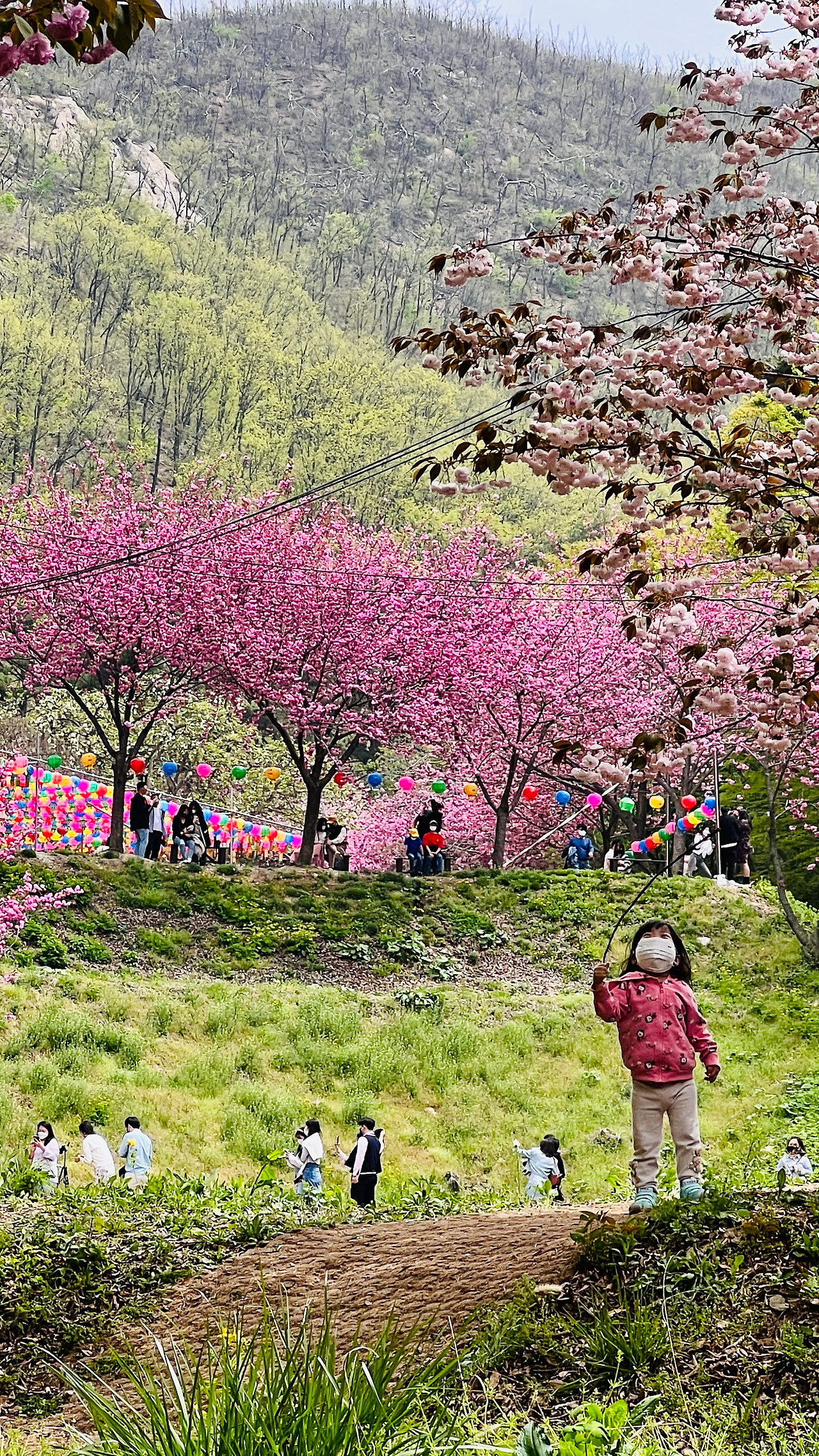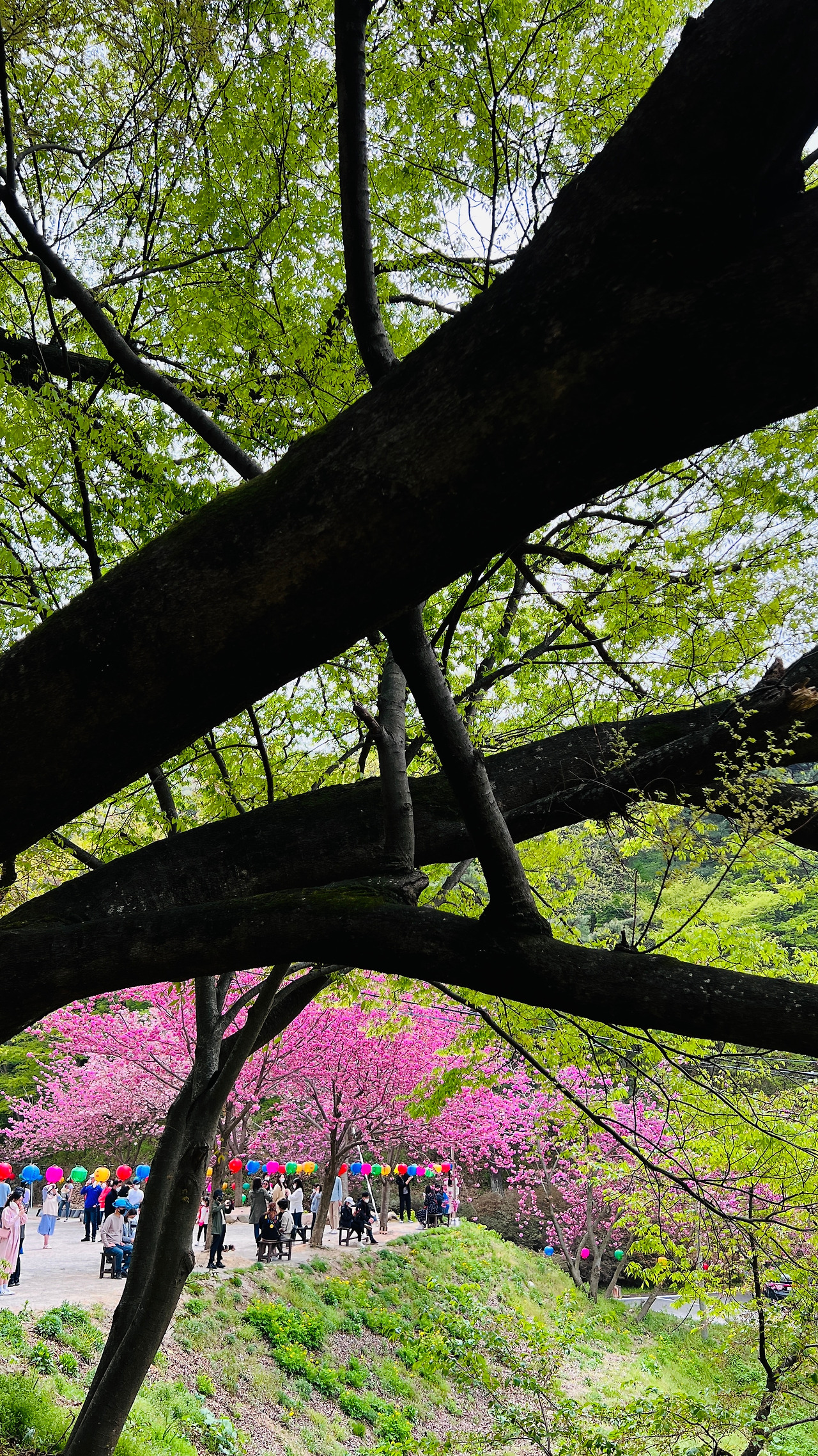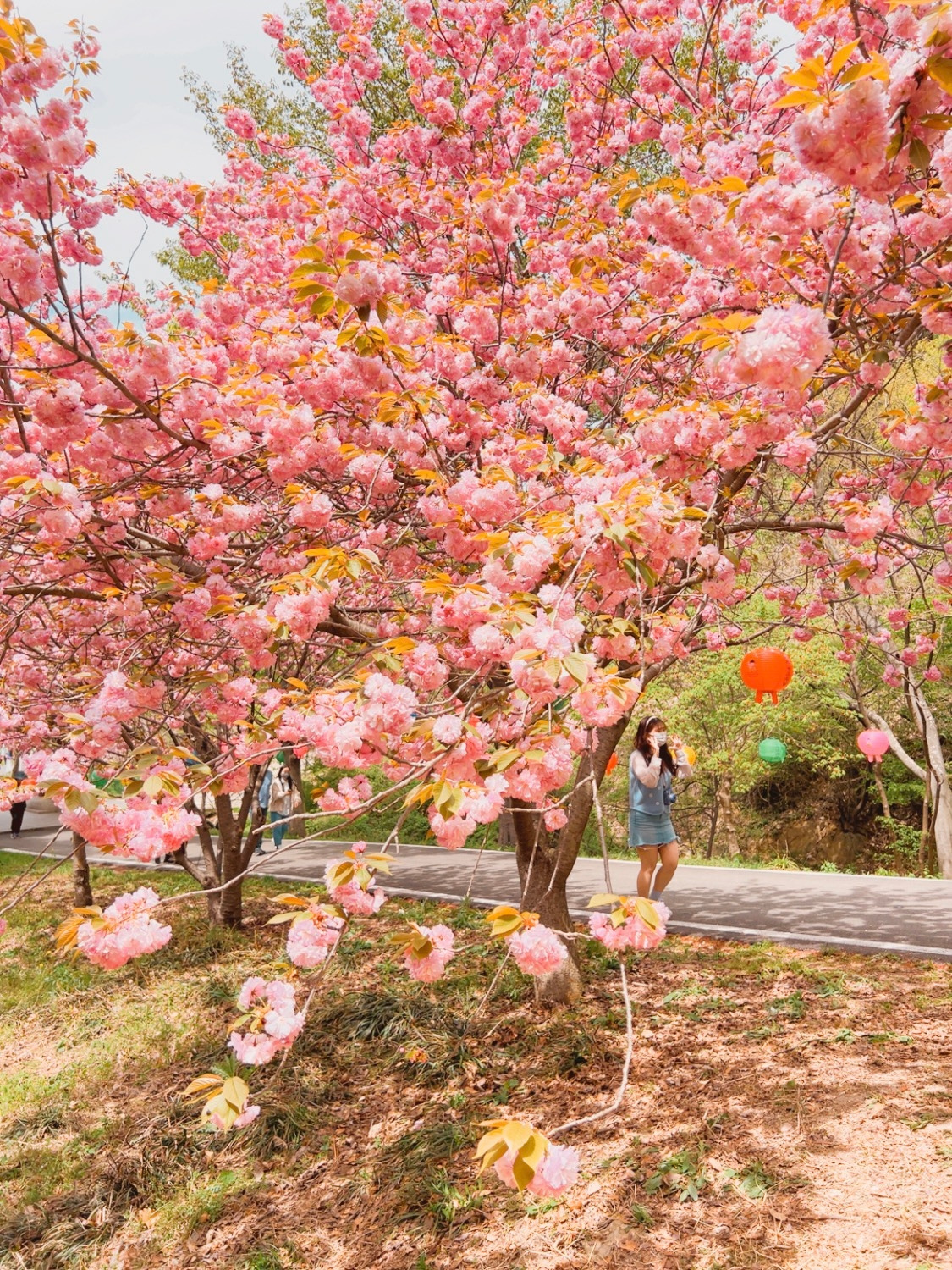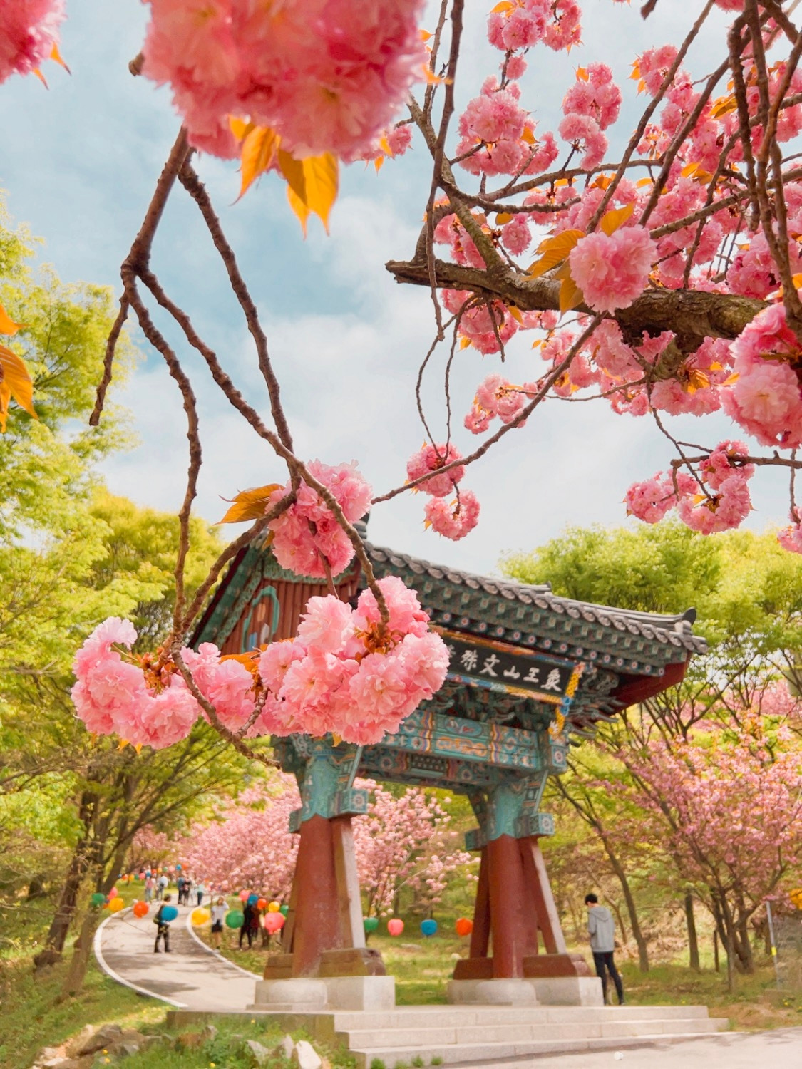 문수사에서 내려가는 곳이다. 두 갈래도 나뉘는데 오른편이 아까 올라올 때 일주문으로 가는 쪽이다. 연못 쪽에 한그루 나무에 유독 사람들이 줄을 서 있다. 그 나무의 꽃이 땅에 닿을 듯하여 옆에 꽃과 나란히 서서 찍을 수 있는 핫스팟이기 때문이다. 아침에 일찍 올 때는 많은 줄들이 있었고 대부분 젊은 연인들이었었다. 내려오는 길은 줄 없이 찍을 수 있었다. 가족 몇 명이 찍오 있을 뿐이었다.