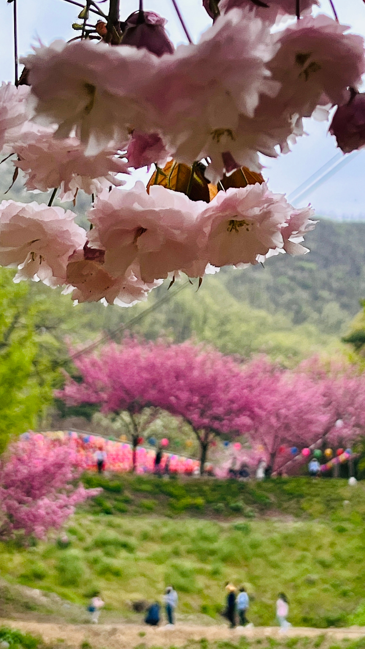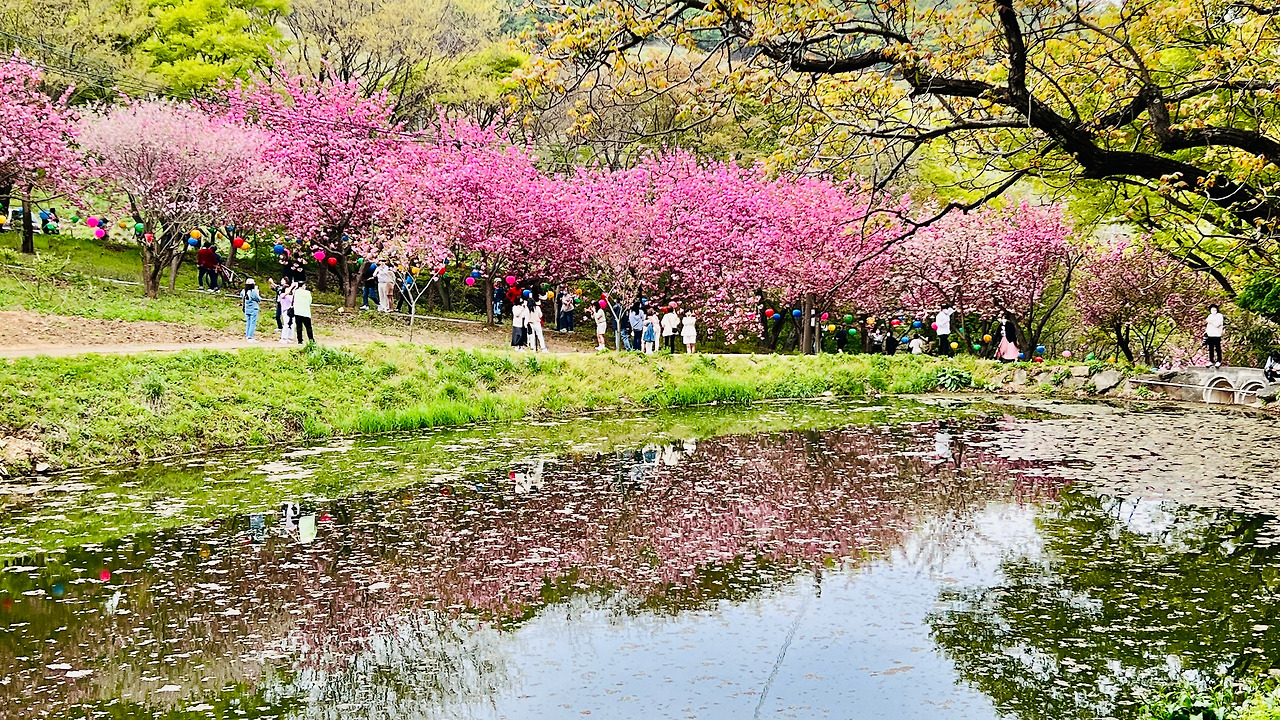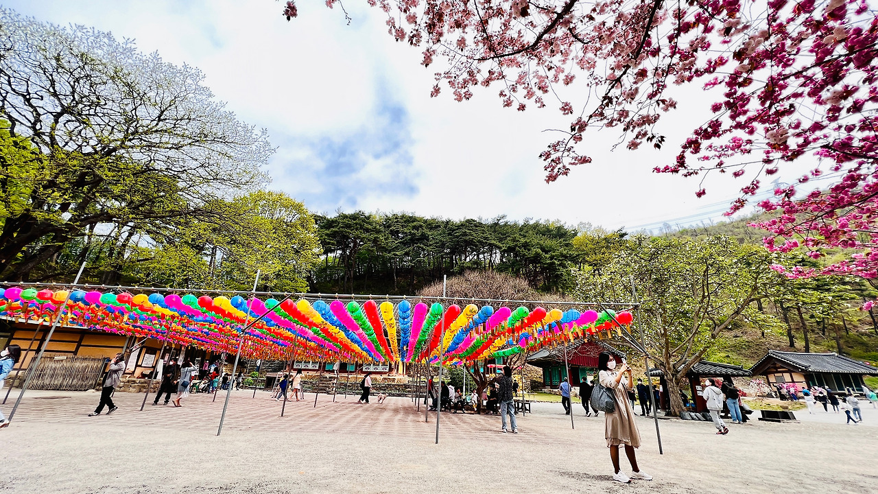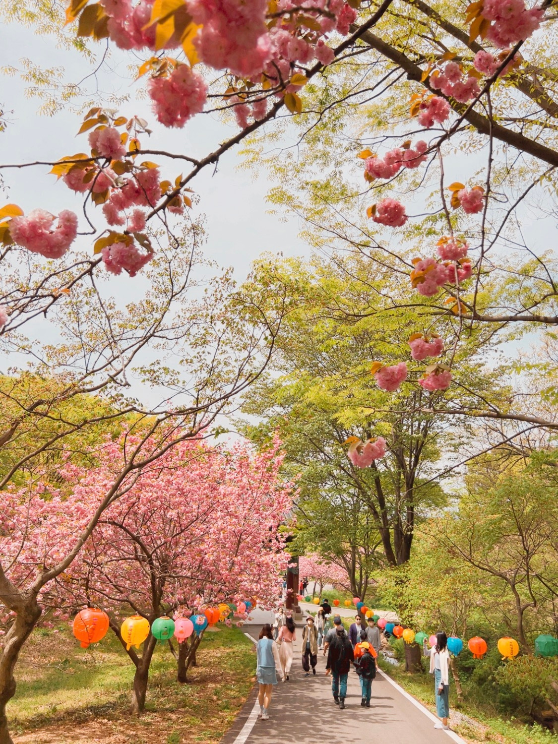 문수사에서 내려가는 곳이다. 두 갈래도 나뉘는데 오른편이 아까 올라올 때 일주문으로 가는 쪽이다. 연못 쪽에 한그루 나무에 유독 사람들이 줄을 서 있다. 그 나무의 꽃이 땅에 닿을 듯하여 옆에 꽃과 나란히 서서 찍을 수 있는 핫스팟이기 때문이다. 아침에 일찍 올 때는 많은 줄들이 있었고 대부분 젊은 연인들이었었다. 내려오는 길은 줄 없이 찍을 수 있었다. 가족 몇 명이 찍오 있을 뿐이었다.