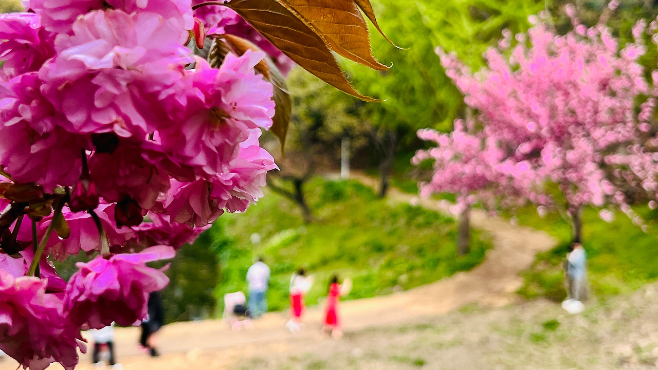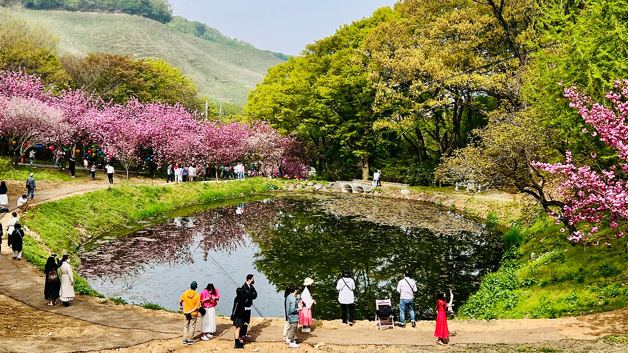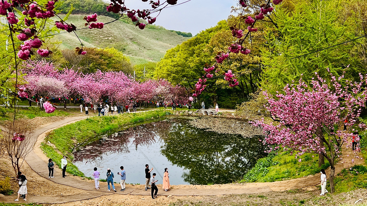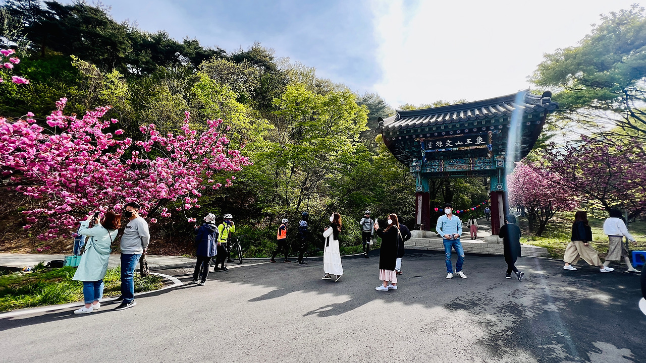길목은 두 갈래로 나눈다. 하나는 일주문 앞에서 오른쪽으로 올라간다. 오른쪽으로 오르는 길은 따로 심은 듯하다. 일주문으로 들어서 있는 겹벚꽃들보다는 연령이 오래된 듯하지 않지만 훨씬 생기 있는 모습을 보인다. 문수사에서 아래로 보면 연못이 하나 있는데 오른편에 유독 홀로 있는 벚나무에서 줄을 서서 찍는다. 나도 이쁘게 입고 와서 한번 찍고 싶다. 일행이라도 있으면 한 장 찍어주며 나도 찍을 수 있으련만 하는 생각을 해본다.