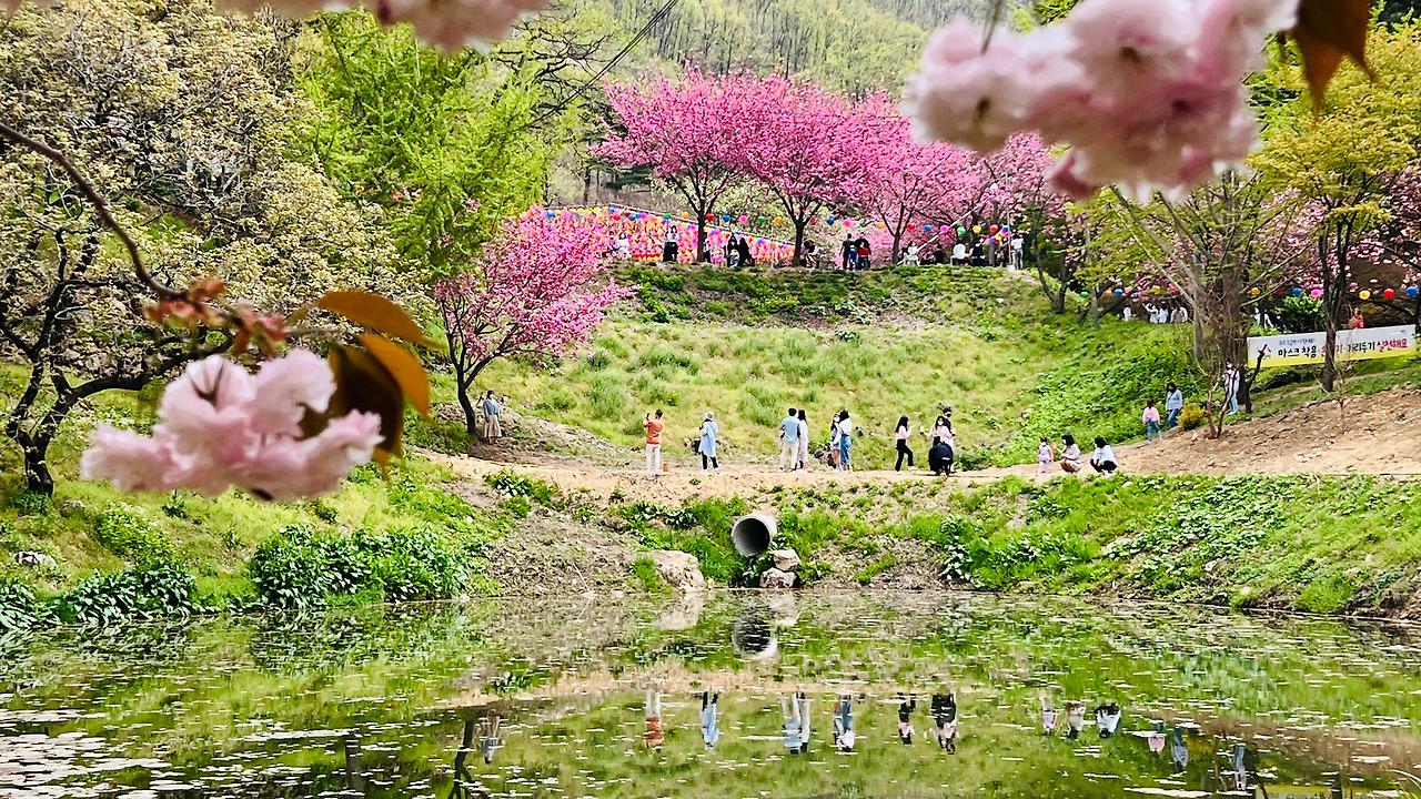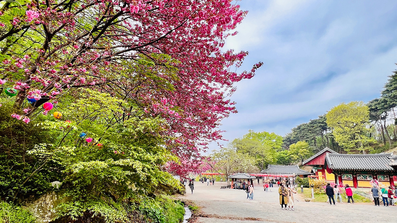 문수사는 우리나라 겹벚꽃의 3대 명소 중에 한 곳이다. 개심사가 그 옆에 자리를 잡고 있지만 문수사의 겹벚꽃 길이 연인과 가족의 길이라면 개심사의 겹벚꽃은 홀로 여행 가는 길이라고 할까? 서산 농장을 가로질러 저수지를 끼고 있다.