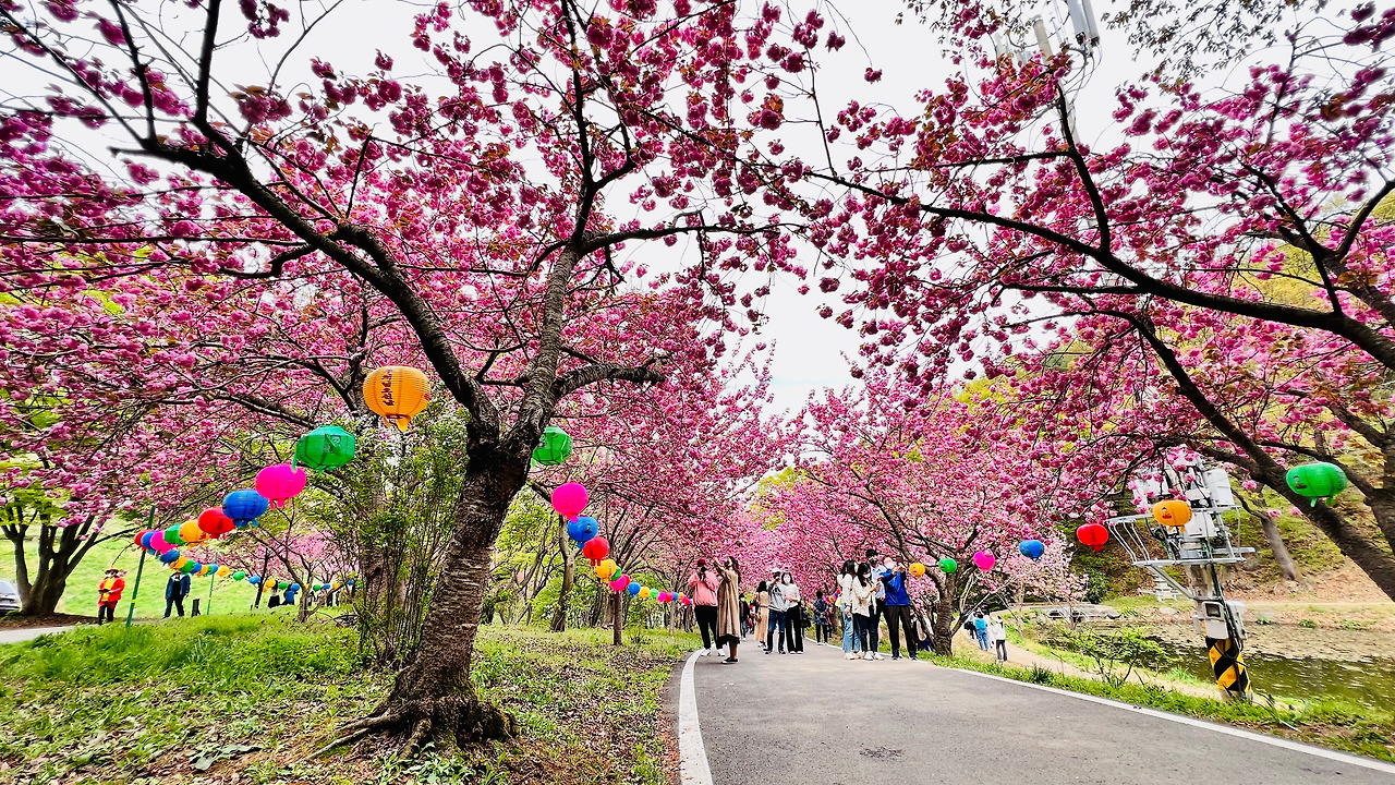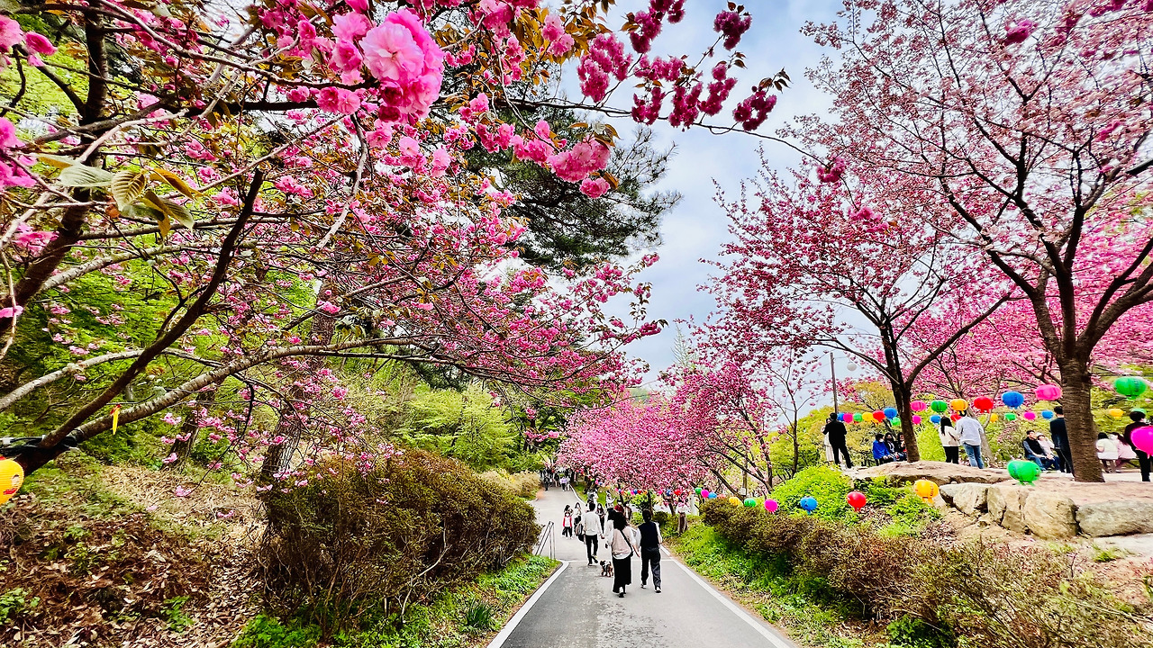 문수사의 겹벚꽃이 좋은 이유는 길 양편으로 겹벚꽃이 흐드레하게 펴 있기 때문이다. 얼마든지 꽃 터널을 구경할 수가 있기 때문이다. 천안의 각원사는 오른편에 크게 펴 있는 반면 길 양가에 있는 벚꽃들과 많은 시간을 보낼 수가 있다.