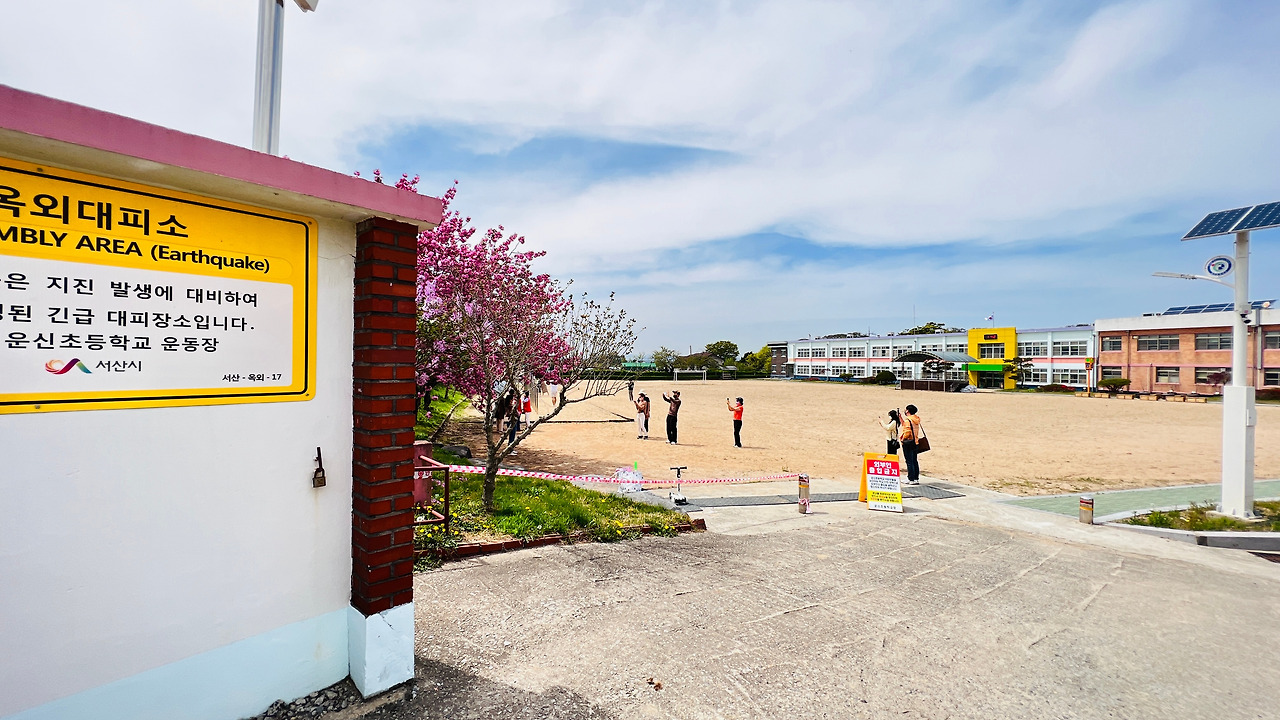 서산 운신초등학교는 한때 1000명이 넘는 재학생이 있었는데 이제는 50여 명도 되지 않는다. 개심사 들어가는 입구에 있는 학교이다. 여기에 왕벚꽃도 또한 인기가 많다. 교문밖에 있는 가게 아저씨에 의하면 차에서 내리는 사람들이 아이들이 아니고 모두 어른이라고 하면서 아이들이 없다고 한탄을 하신다. 피곤한 몸을 이끌고 맥콜 음료수 한 캔과 라테를 사들고 맥콜은 그 자리에서 마시고 라테는 들고 나왔다.