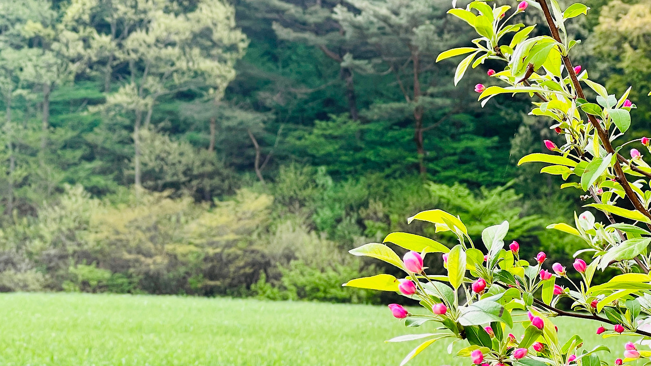 청보리밭을 뒤로하고 돌사과 나무꽃이 탐스럽다.