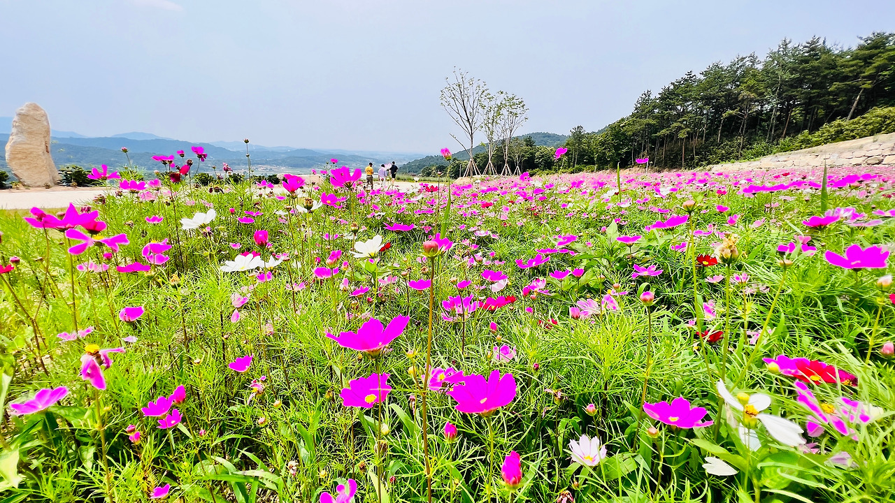 핸드폰을 코스모스밭에 두고 타이머로 사진을 찍으면 핸드폰 시점으로 부터 사진을 찍을 수 있다. 핸드폰이 나를 찍어주는 시점이다.