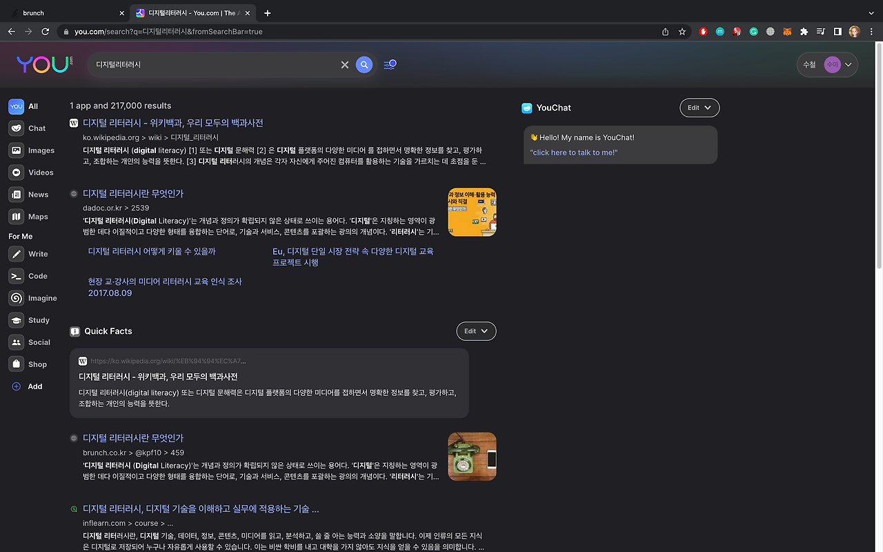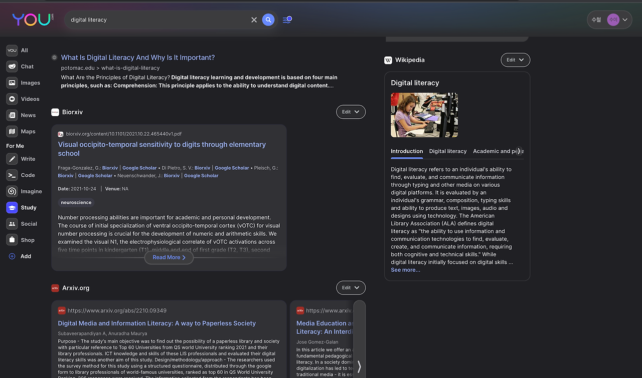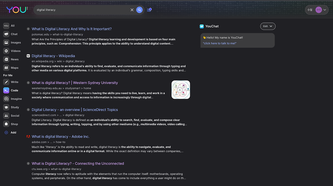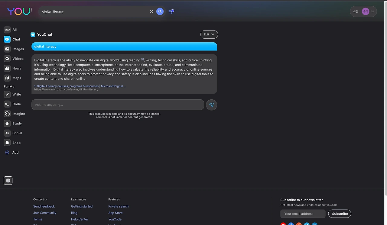 다른 검색엔진도 월등하지만 무엇보다도 실시간으로 채팅으로 얻을 수 있는 방대한 정보를 군더더기 없이 얻을 수 있는 점이 최대의 장점으로 보인다. 다만 chatGPT는 유해정보를 필터링하는 수준이 상당한 데 비해서 you.com은 그런 결과가 나타날 수 있는 점이 아쉽다.