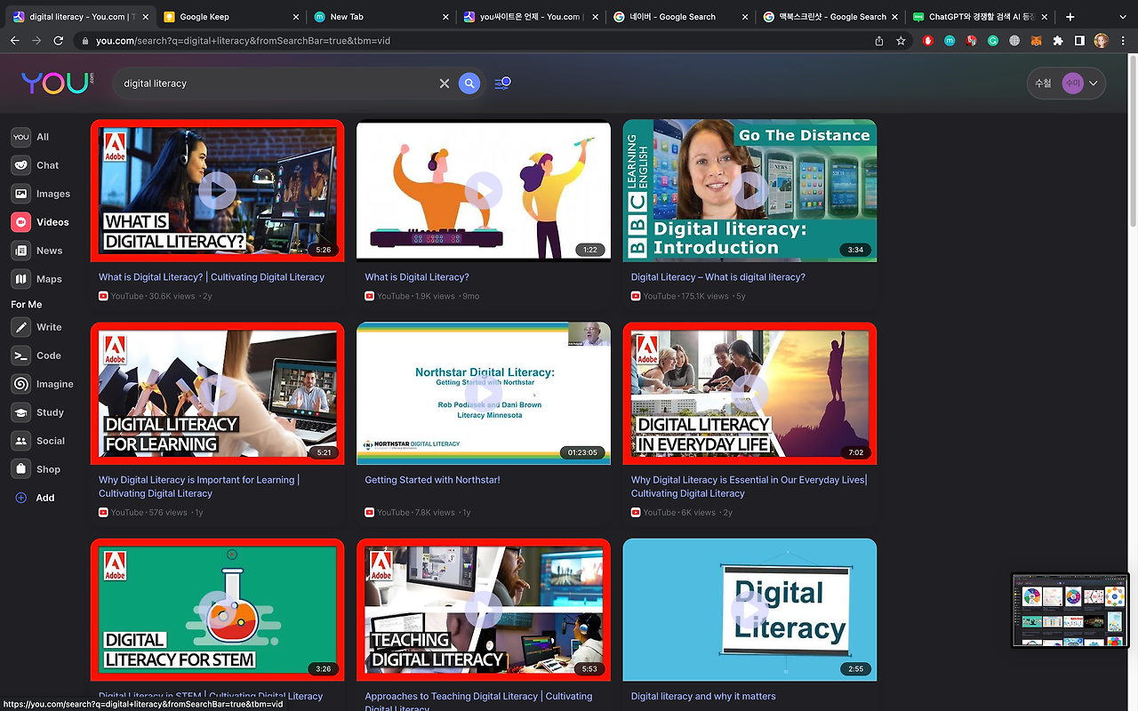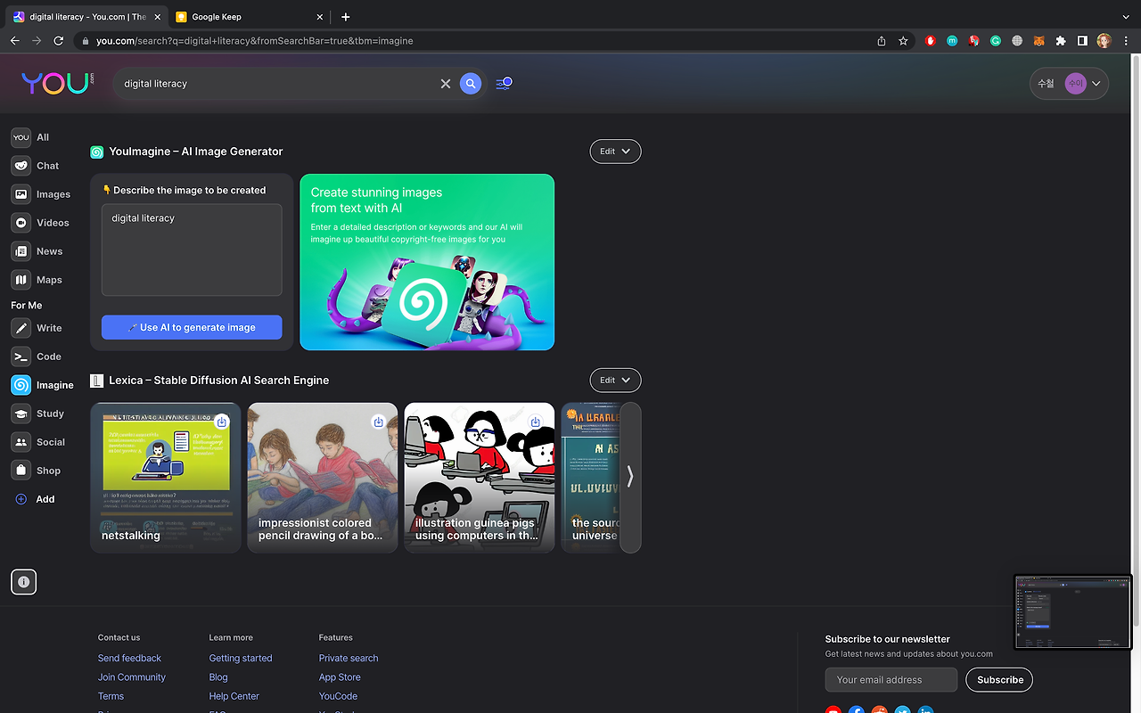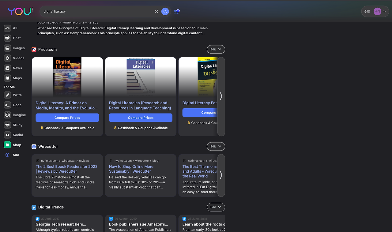 다른 검색엔진도 월등하지만 무엇보다도 실시간으로 채팅으로 얻을 수 있는 방대한 정보를 군더더기 없이 얻을 수 있는 점이 최대의 장점으로 보인다. 다만 chatGPT는 유해정보를 필터링하는 수준이 상당한 데 비해서 you.com은 그런 결과가 나타날 수 있는 점이 아쉽다.