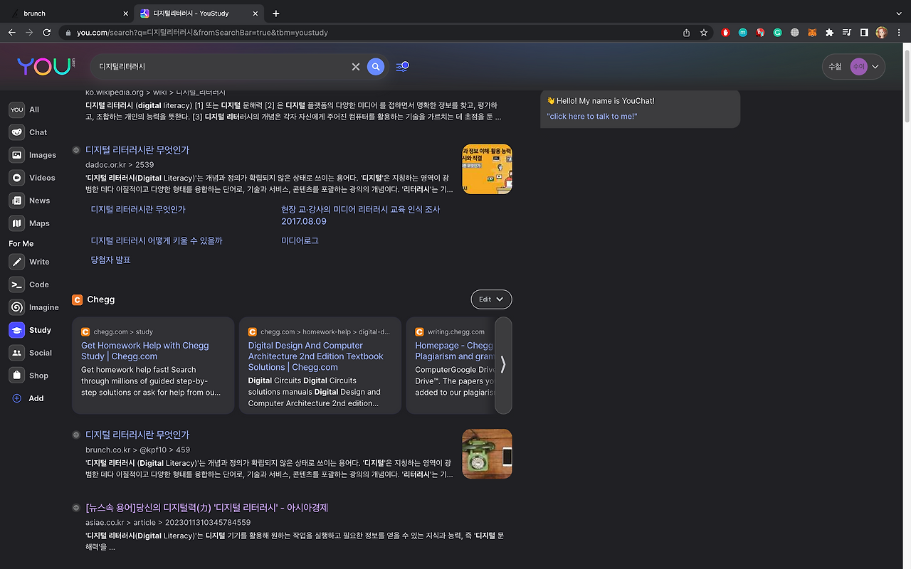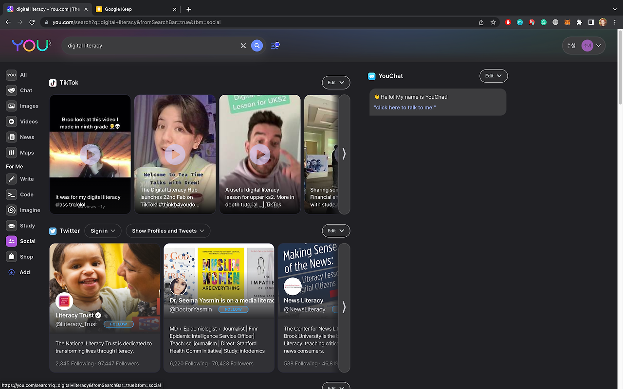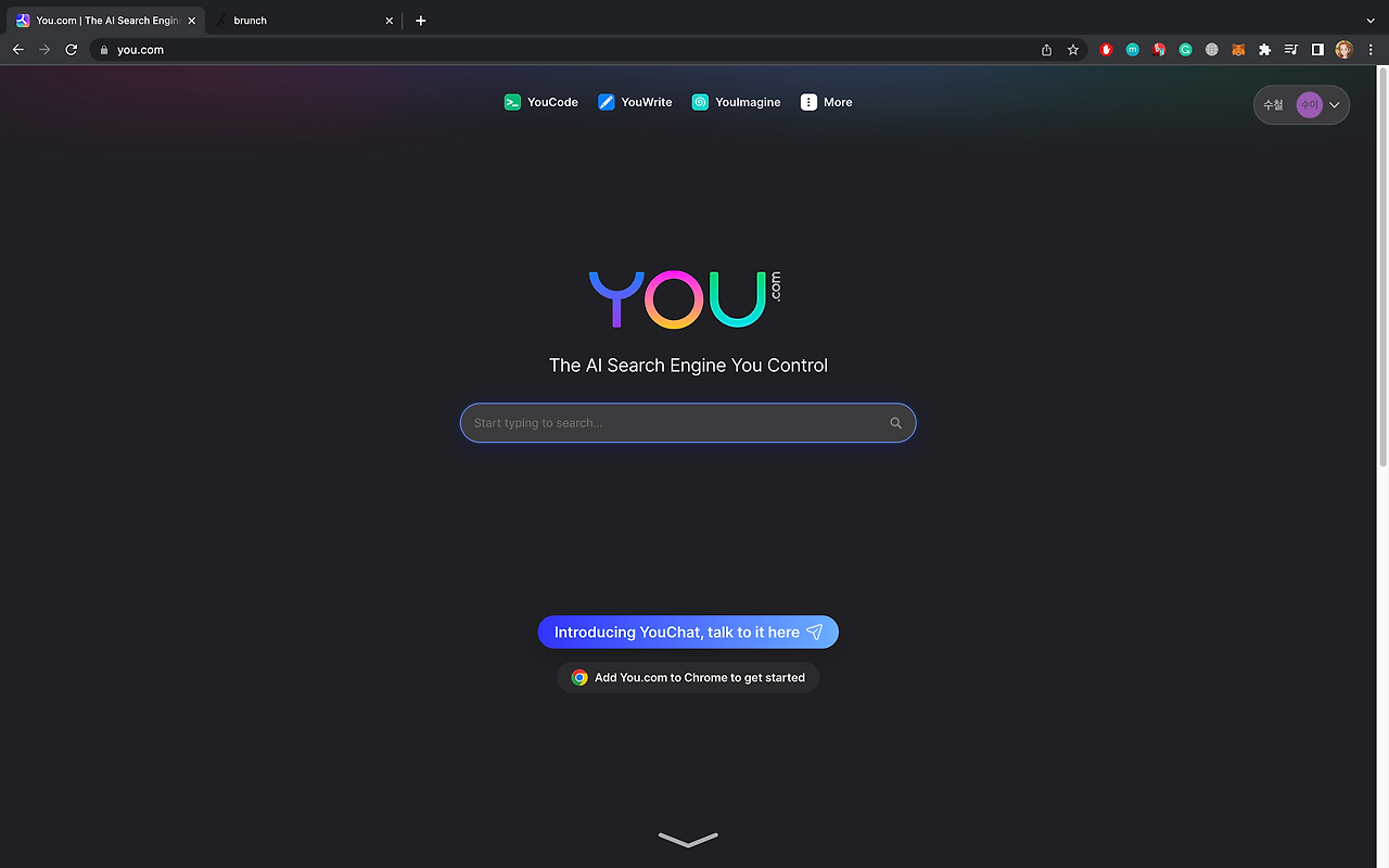 최근에 ChatGPT의 막강한 경쟁자 YouChat이 나타났다. YouChat은 You.com에 있는 챗봇이다. 광고 없이 검색하고 AI기반의 검색엔진이다. 설립자는 CRM의 고객관리 솔루션이 saleforce 직원의 Brian McCan과 Rechard Socher가 2020년에 설립한 회사이다. 이름의 유래는 구글유튜브의(Goolge Youtube)+ChatGPT(chat)에서 나온 것으로 따로 youchat으로 검색하면 다른 곳으로 가게 되며, https://you.com에 들어가서 검색을 하여 찾을 수 있다.