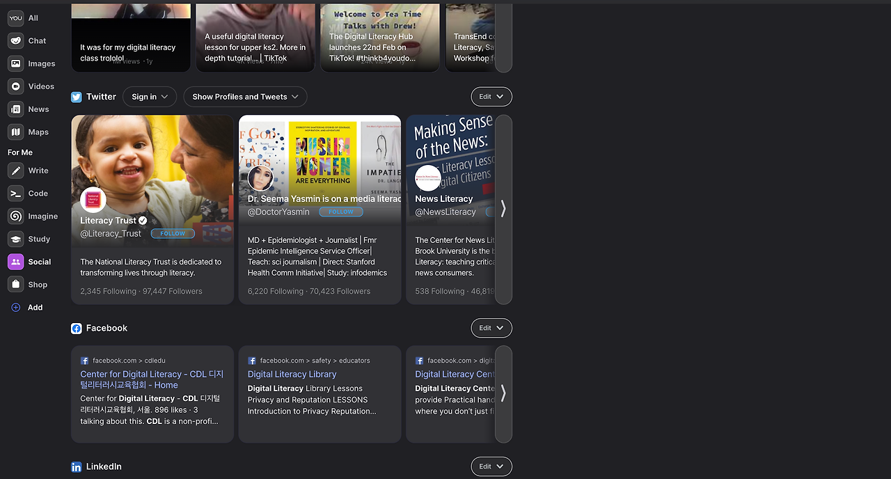 소셜의 검색결과는 트윗과 페이스북, 링크드인과 같은 주요 SNS의 화면을 일목요연하게 보여준다.