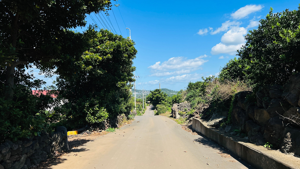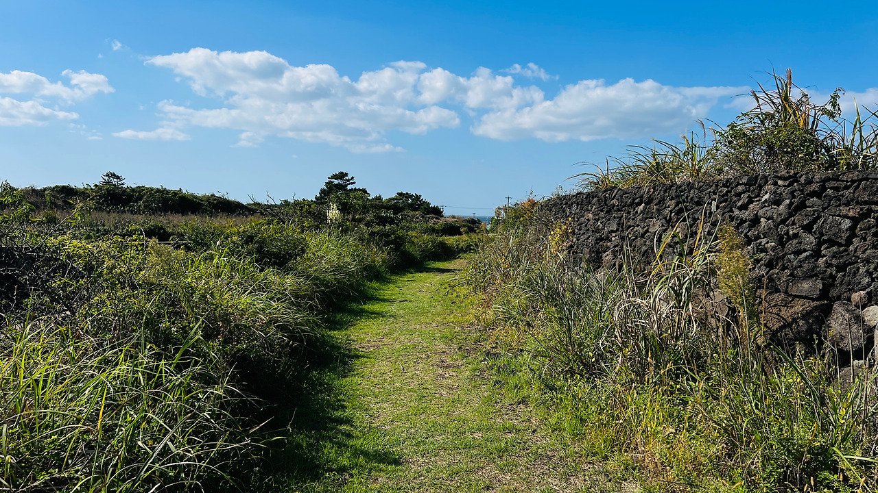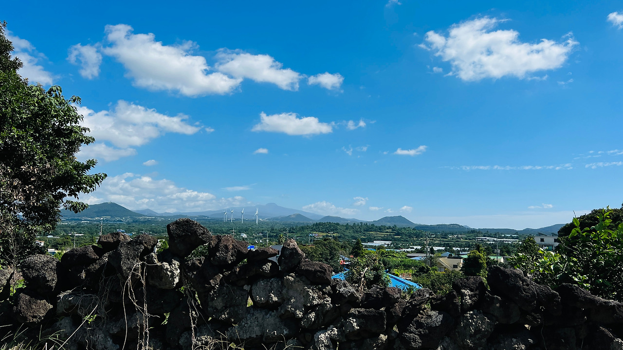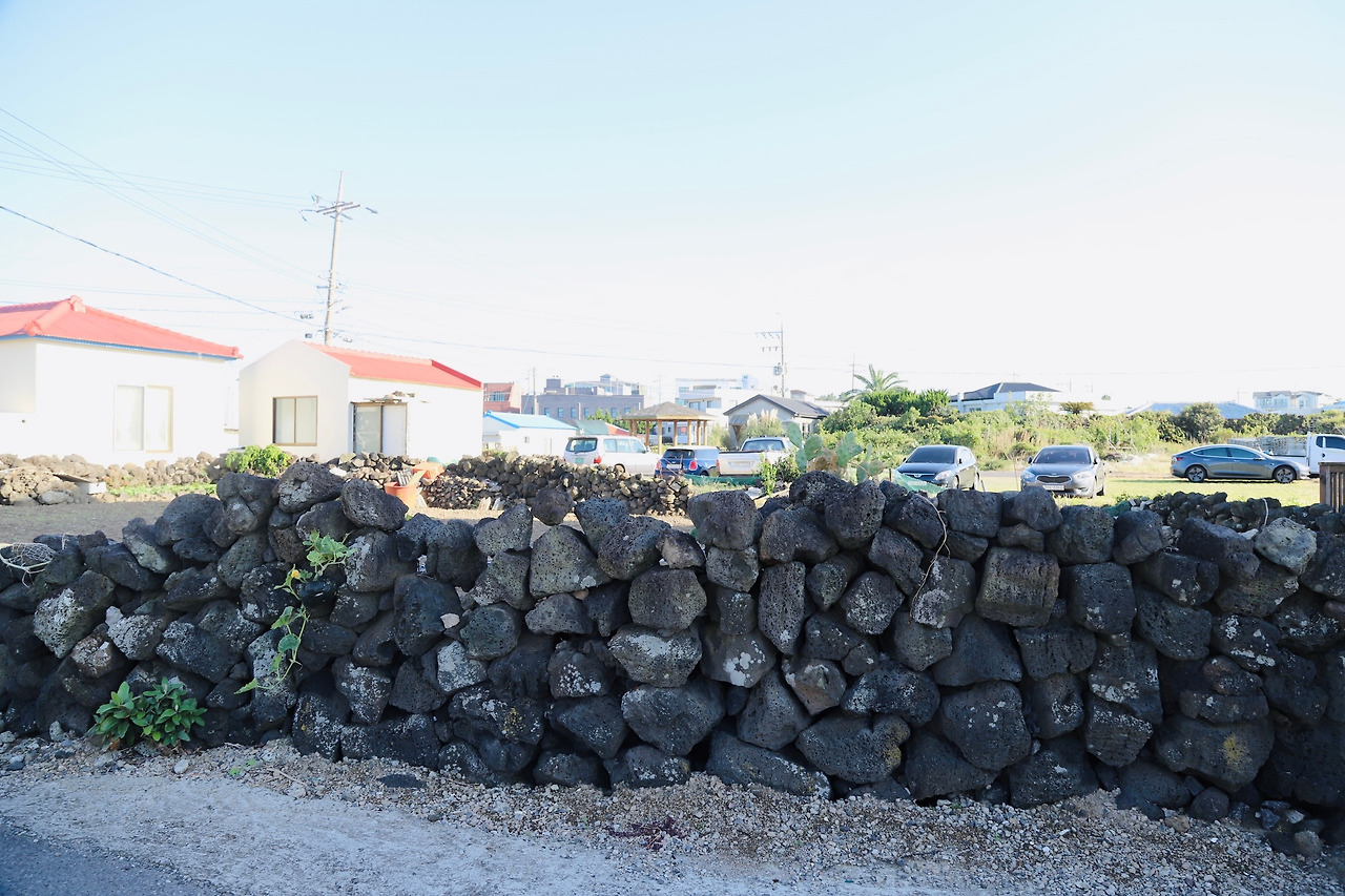 오른쪽으로 한라산이 보인다. 오름들과 함께 풍차도 보이고 관광객들이 전혀 여기를 온 적이 없는 듯한 마을의 제주 골목길을 걷는다. 아직 스레트지붕에 페인트를 칠한 지붕이 담장 너머로 보인다. 제주의 돌들은 무심하게 많은 시간과 세월을 그렇게 보냈으리라.