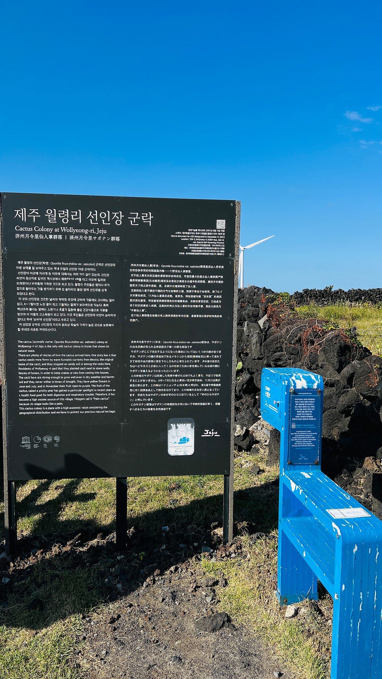월령선인장 자생지 앞에 풍력발전기가 나란히 바람개비를 돌린다. 그 바닷길 카페에 몸을 의지하고 백년초 열매 주스를 주문한다. 그다지 원액이 많이 함유되어있지 않은 듯하다. 월령리의 선인장은 한국에서도 유일하게 자생하는 곳이다. 처음에는 쥐와 뱀들이 돌담으로 들어 오는 것을 막으려 선인장을 심었다고 한다.