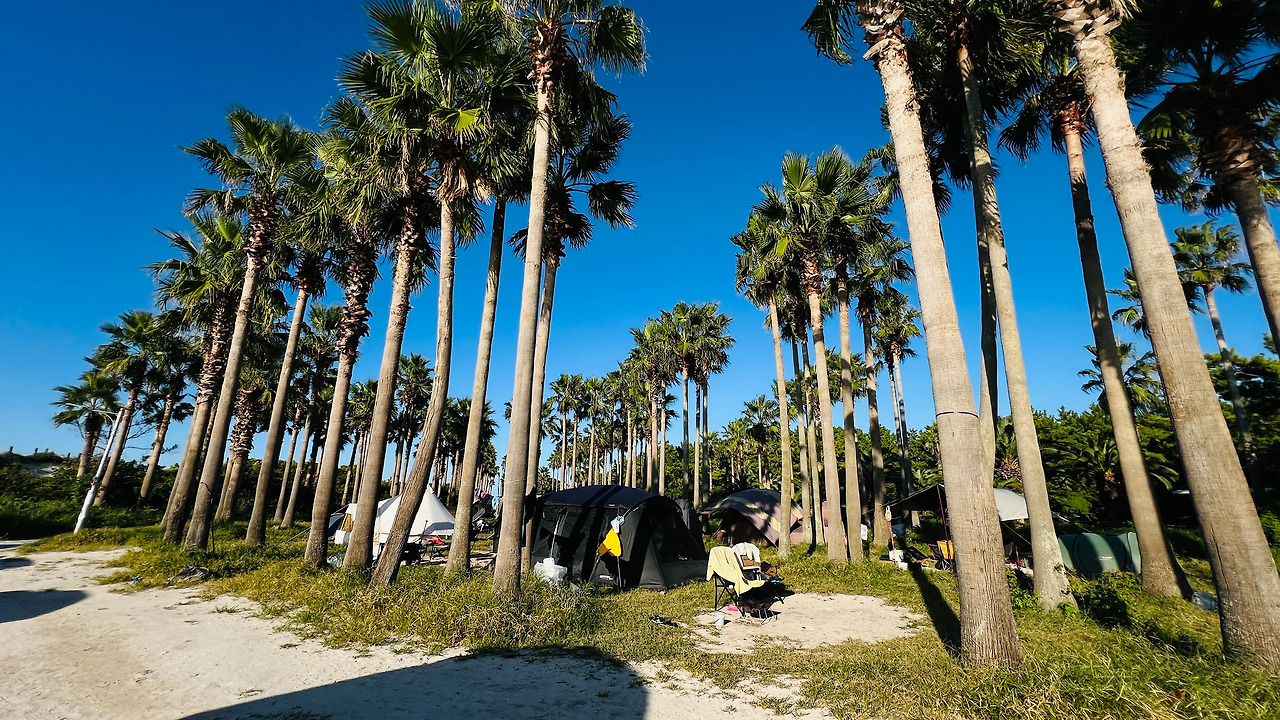 캠핑족들이 야자수 아래에서 캠핑을 한다. 여름이나 겨울에 차에 캠핑 장비를 싣고 와서 캠핑을 해보는 것도 좋을 듯하다.