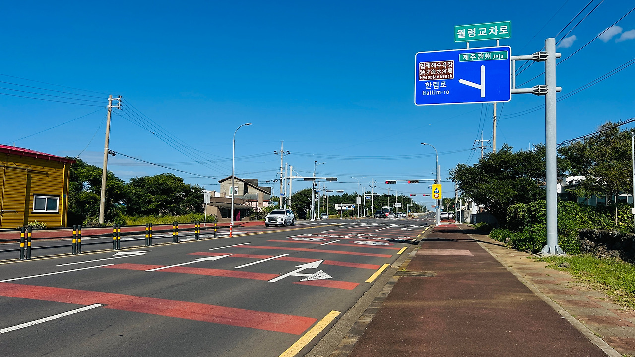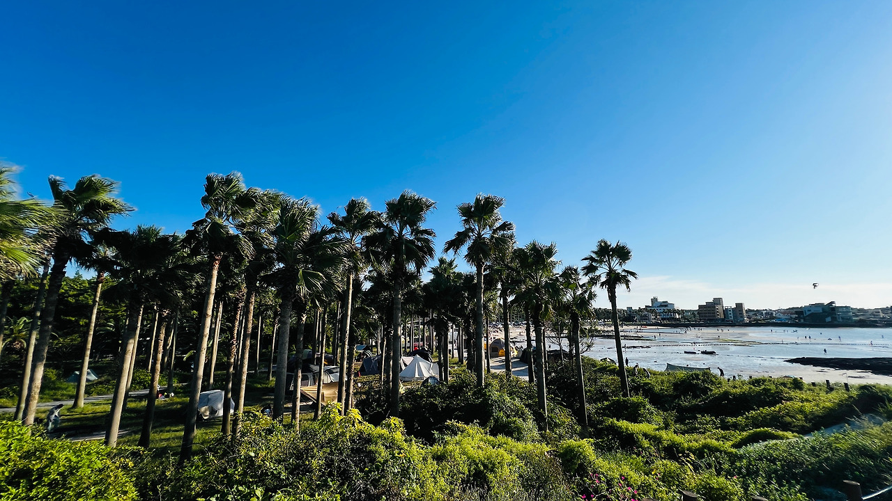 금능포구가 나오고 저기 협재해수욕장과 비양도가 보인다. 함덕해수욕장과 함께 어린이들을 데리고 해수욕하기에 적절하고 음식점과 주차 공간 여유가 되는 곳이다. 야자수 아래에 캠핑장은 꼭 한번 오고 싶은 생각이 들었다.