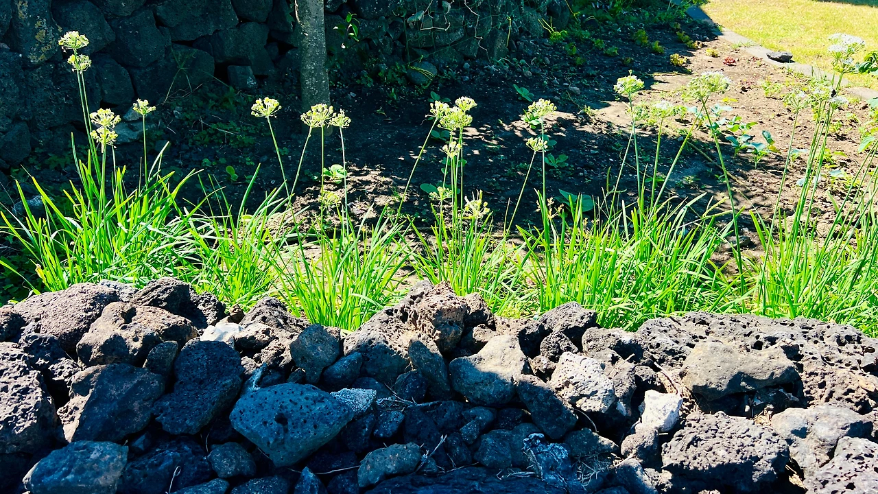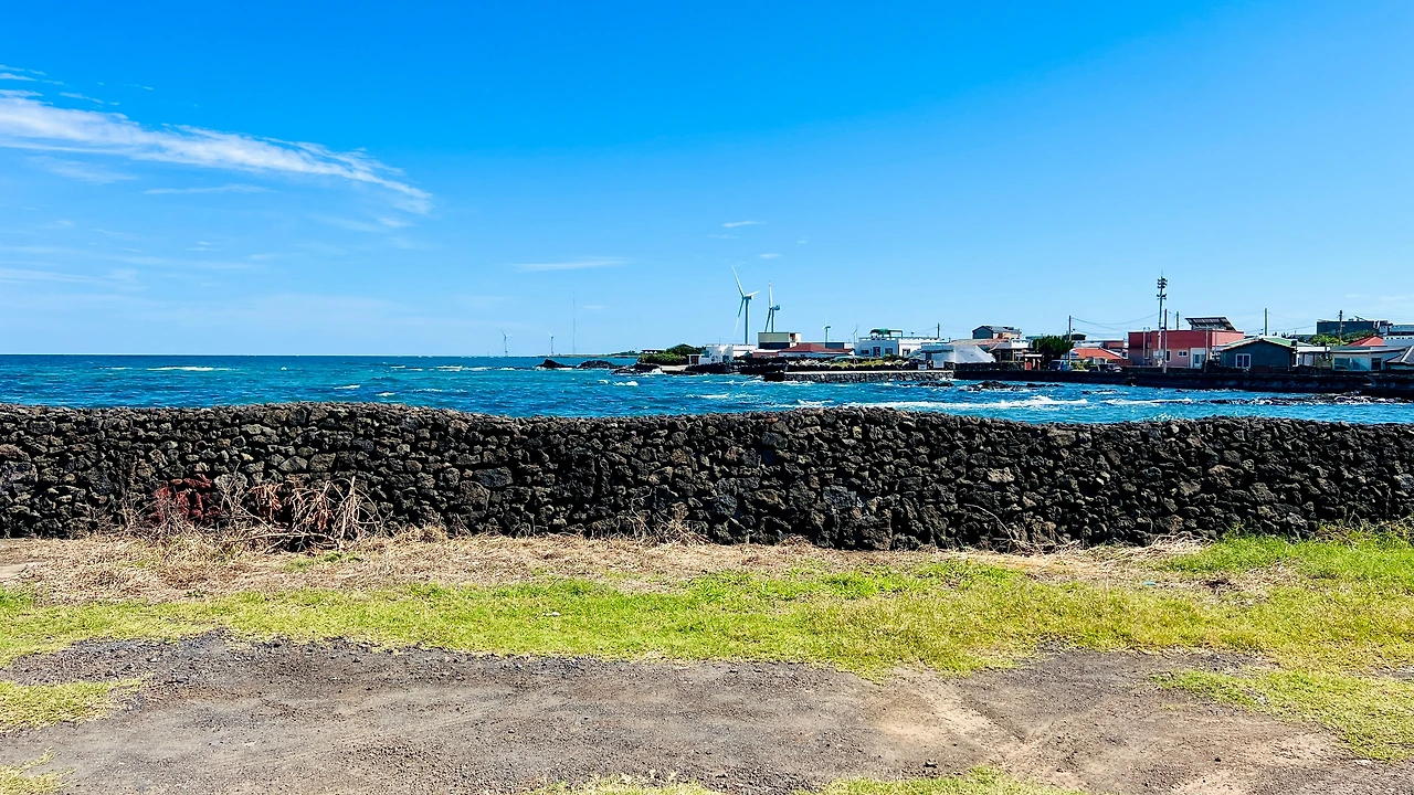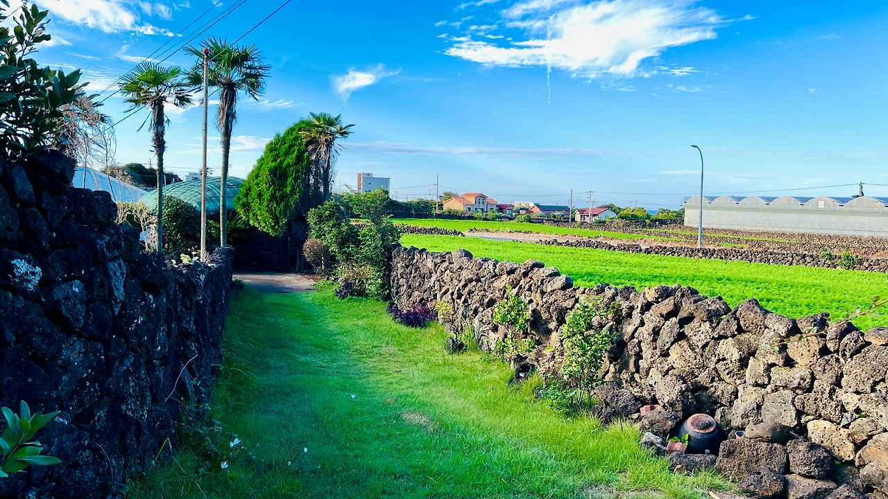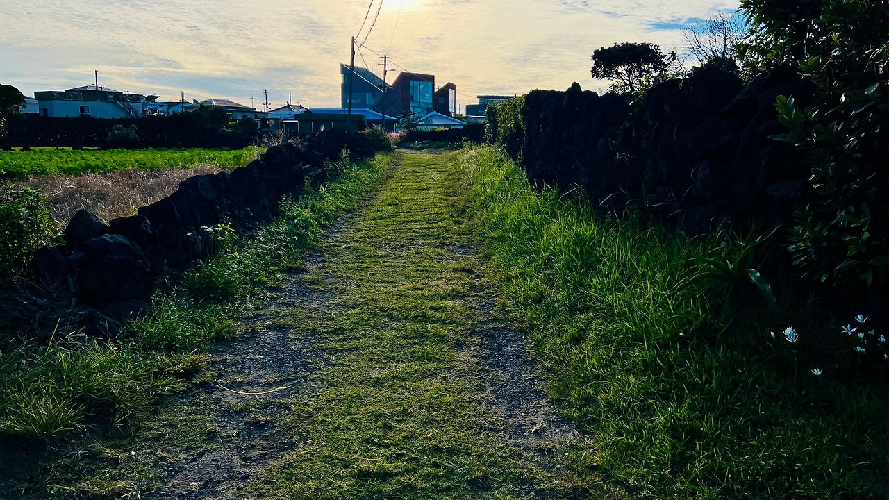 이쪽 올레길을 걸어오면서 이 동네는 조용하기도 하고 사람들이 바쁘지도 않고 바람도 세지 않다. 그리고 토양이 물 빠짐이 좋고, 곱고 보드라운 흙과 모래흙이 많이 있어서 양질의 토양성분이 비옥한 땅을 만들고 다양한 작물을 경작할 수 있게 만들고 있다. 특히 눈에 띄는 것은 먹음직한 고구마들이었다. 많은 태양 빛을 풍부하게 받으면서 부드러운 흙에 들어 선 고구마알이 얼마나 맛있을까 생각을 해보았다. 동네의 돌담길들을 걷다가 또 놀라운 사실은 이렇게 잔디로 마을의 길들을 가꾸어 놓았다는 것이다. 그냥 돌멩이나 자갈 혹은 콘크리트를 해도 되는데 흙이 쓸려 내려가지 않도록 일부러 잔디를 심은 듯하다.