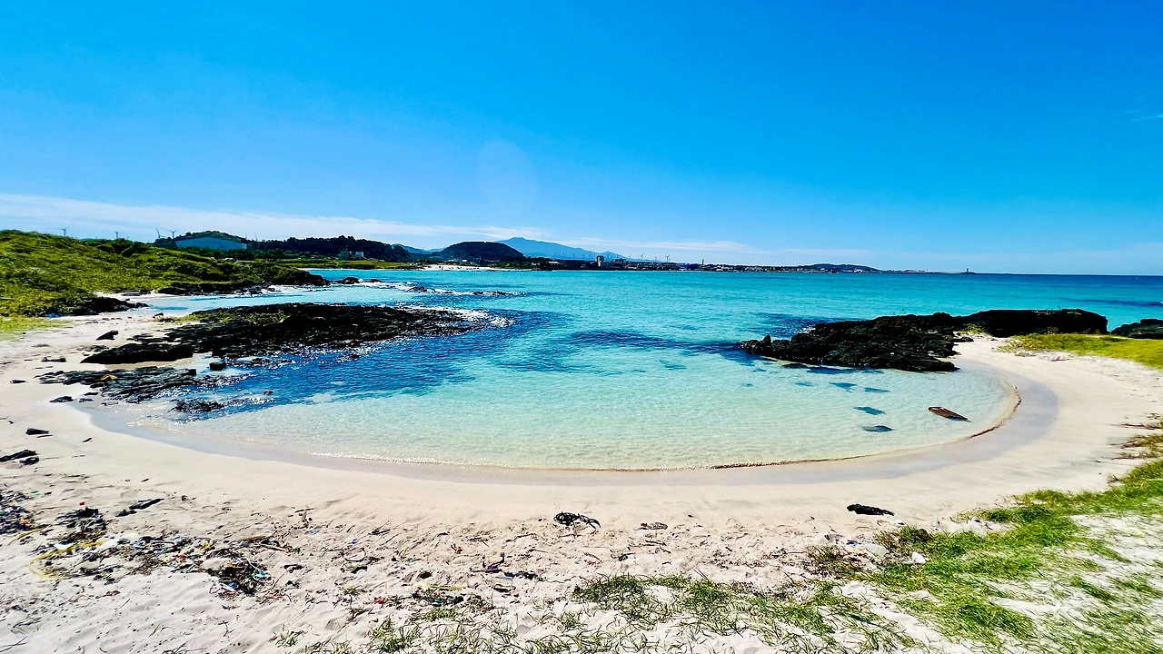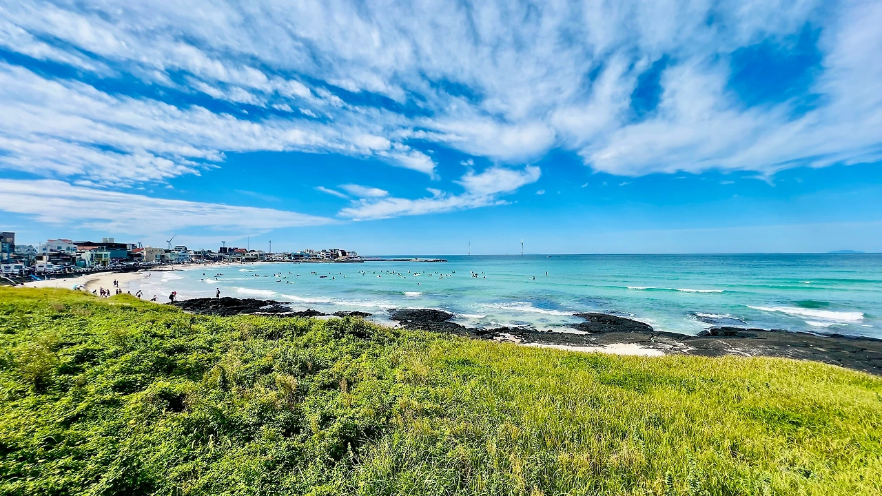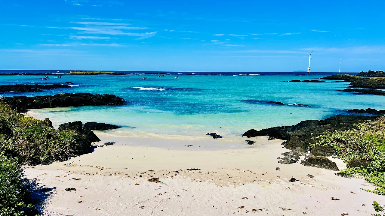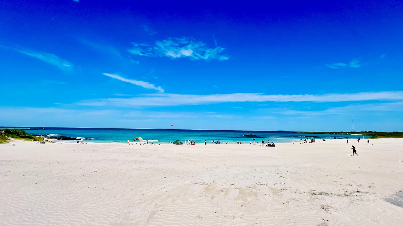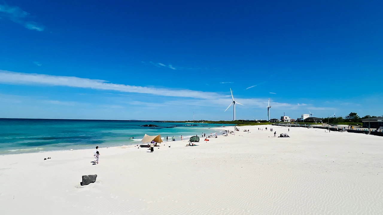 김녕성세기 해수욕장은 겨울에는 고운 모래를 보호하기 위해 모래 위에 덮개로 덮어 둔다. 성세기라는 말은 외세의 침략을 막기 위한 작은 성이라는 말이다. 실제로 올레길을 돌다 보면 해안에 아직 남아 있는 환해장성을 볼 수가 있다. 하얀 모래에 코발트 빛의 이쁜 바다를 구경하고 싶다면 기꺼이 추천한다. 여름이 되면 이렇게 고운 모래에 사람들이 몰려들기 시작한다. 겨울 바다에는 바람도 세고 사람들이 찾지 않지만 여름 바다는 사람들이 해수욕장 폐장을 한 후에도 찾아온다. 여기에 편의점이 있어서 마실 것과 라면으로 점심을 때운다.