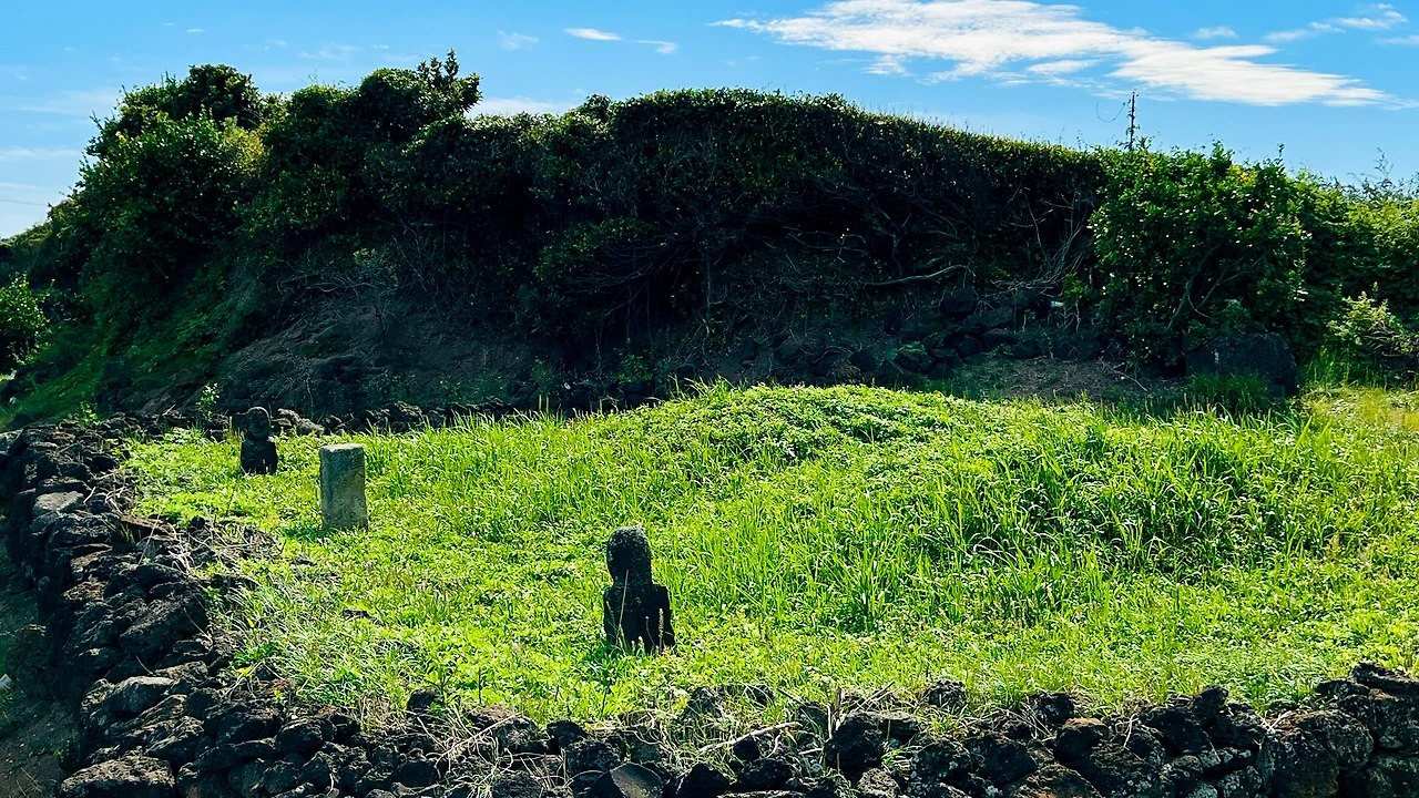 농로를 걷는데 특이한 무덤을 발견했다. 제주의 전형적인 무덤인데 석상이 양쪽에 있는데 석상이 스마일이다. 무덤을 지키는 수호신이 정교하게 다듬진 않았지만 소박하면서 어렵게 한뜸 한뜸 조각한 상이다.