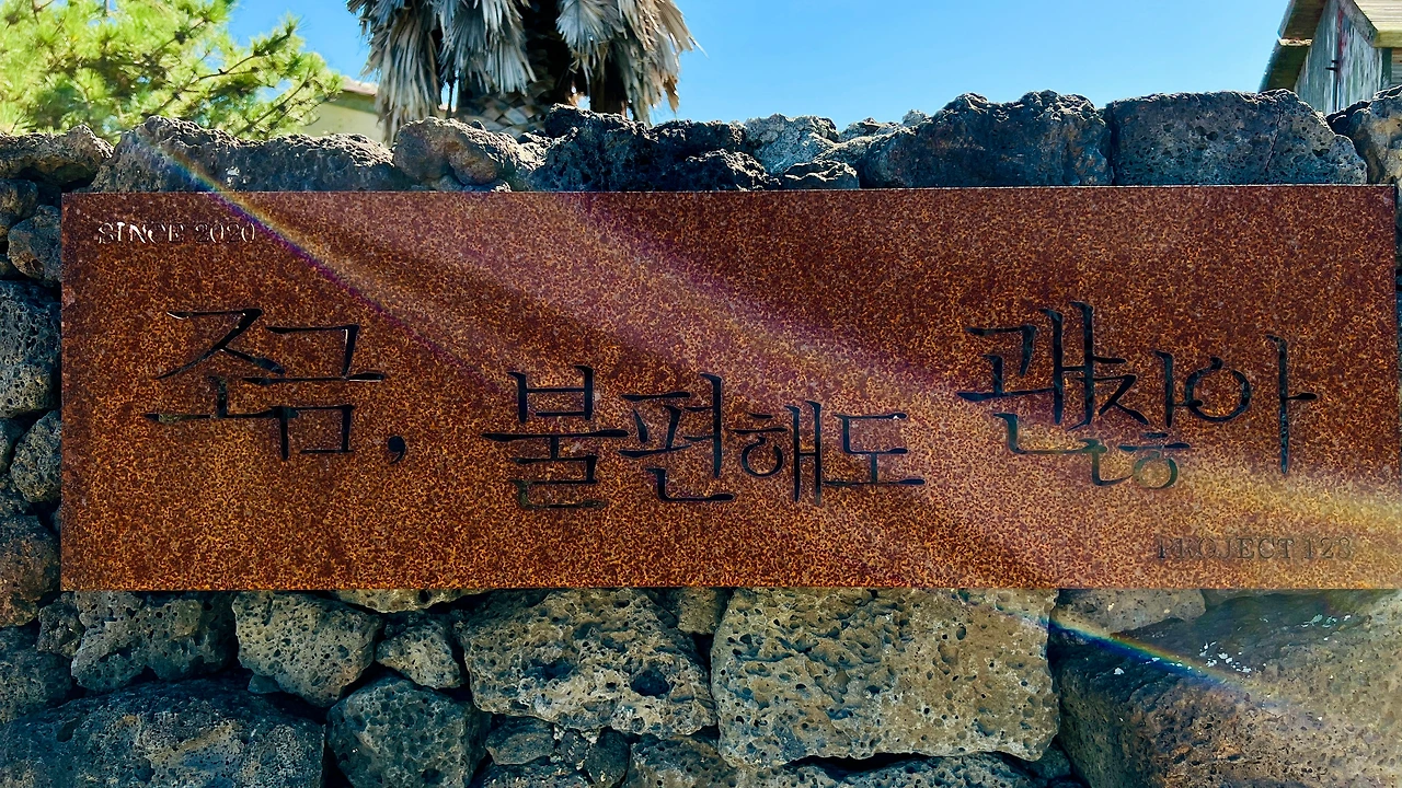 제주도의 집이나 일반 펜션의 담벼락 혹은 상호명에 재미있고 재치 있는 이름의 간판이나 슬로건이 많이 있다. 그중에서 오늘 본 내용 중 "조금 불편해도 괜찮아"이다. 불편하지 않으면 자꾸 편안한 것만 추구하고 편안함에 안주하게 되고 결국 불성실하게 되어가게 된다. 불편함이 스스로를 더 성장하고 가꾸어가게 하는지도 모른다.