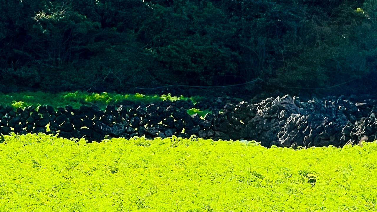 10월 초순이라 밭에 심어둔 당근들이 싹이 나서 파릇파릇했다. 돌담 아래로 심은 당근들이 우리가 먹는 제주산 당근이 된다. 구좌읍의 당근이 전국적으로 유명하다는데 유심히 이 당근 밭을 살펴보면 흙이 그렇게도 보드랍고 고울수가 없다. 토양이 비옥하다는 증거이다. 바위와 자갈로 이루어진 밀감밭 주위의 밭들 보다는 훨씬 농사를 짓기에 좋은 토질을 가진 땅이 많다. 단위 면적당 생산량이 많으면 인심도 좋아지고 사람들은 여유를 가지게 된다. 이 주위의 동네는 집들이 차분하고 안정적이라는 느낌도 든다. 저 많은 바위덩어리를 골라내서 밭을 경작하고 그들의 경계를 만들고 그 담 들이 농작물을 태풍이나 바람으로부터 보호하지만 그 담 사이로 난 구멍 덕분에 담이 무너지지 않고 많은 세월을 견뎌 왔다는 게 믿어지지 않는다. 세월의 풍파를 겪은 사람들은 그들 자신에는 이렇게 구멍이 여기저기 나 있을 테지만 살아갈 수 있는 힘이 있는 이유도 듣고 흘리고 겸허히 받아들이고 내 보내기를 잘하기 때문이다.