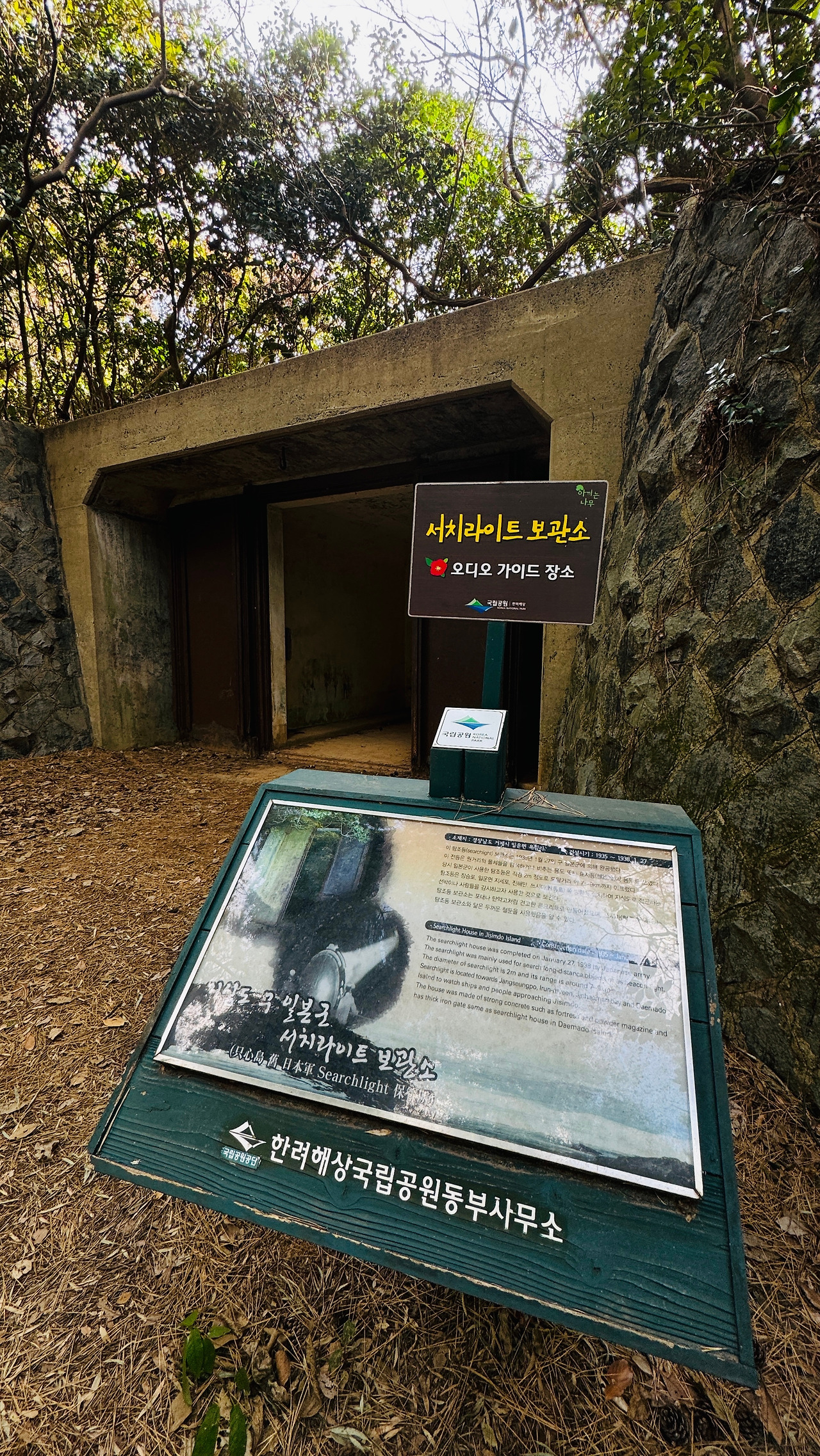 지심도의 위치는 동남단 끝에 위치하여 대마도에서 50km 거리에 위치해 있다. 대마도를 한눈에 볼 수 있으며, 해군기지가 있는 진해만의 길목이고, 거제 최고의 양향 지세포 입구에 자리 잡아 가덕도와 지심도 양쪽에 대공포 기지를 만들어 군대를 주둔했다. 그때 서치라이트를 보관하던 곳이다. 세월의 흔적은 쇠문이 녹으로 검게 물들고 있었지만 2중 콘크리트의 그 단단함은 어제 갓 굳은 콘크리트처럼 단단한 천혜의 요새였다. 이 건물의 특징이 이중벽의 형태이다. 내벽과 외벽이 사람이 지나다닐 수 있는 공간이 있는데 서치라이트가 당시 아주 중요한 역할을 했기에 안전하게 보관하기 위한 것이었다. 이때 사용한 조명이 도달하는 거리는 7km~9km나 되며 서치 라이트를 방향지석으로 끌고 가서 사용되었다 한다.