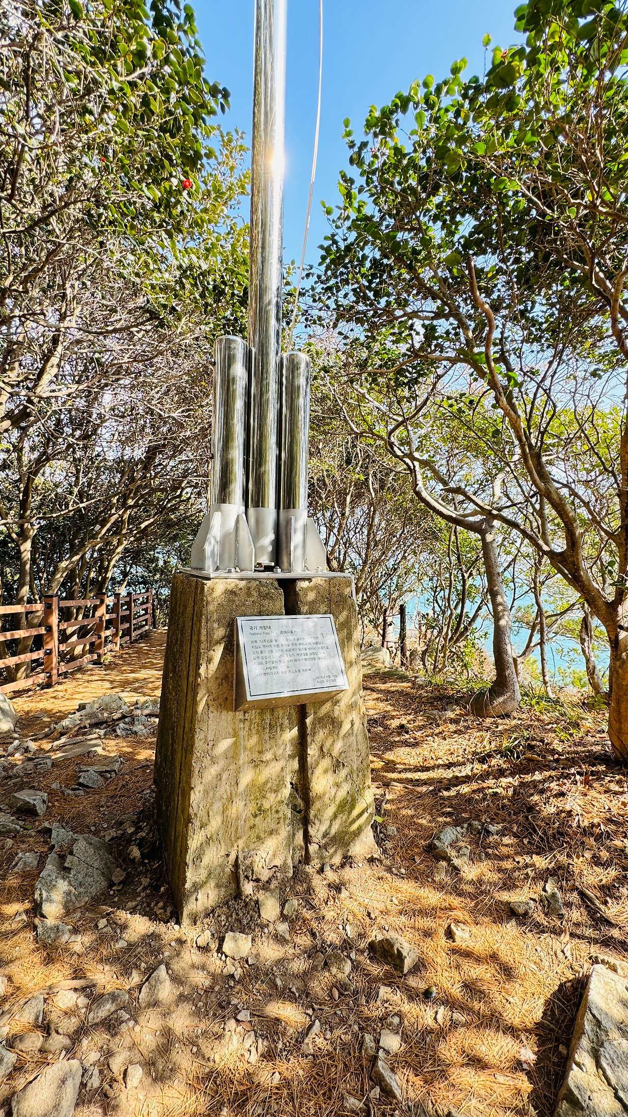 '새끝'으로 내려가는 길목에 대형 태극기가 걸려 있다. 일제 강점기에는 욱일승천기가 걸려있었다. 자세히 보면 국기 게양대 아래의 콘크리스대는 그때 그대로였는데 그 위에 다시 국기 게양대를 만들어 놓았다. 광복 70주년을 맞아 2015년 8월 15일에 주민들이 태극기를 걸었다고 한다.