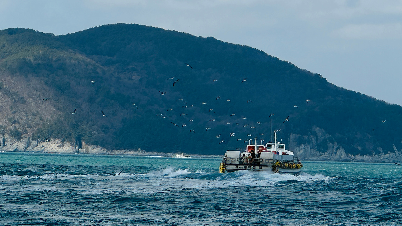출발하는 시간은 대체로 날씨가 맑았으며 기온이 춥지 않은 봄이 완연한 날씨였다. 바다이고 내일 날이 흐린 예보로 바닷바람이 파도와 나의 머릿결을 심하게 가를 뿐이다. 나의 머리카락은 바람이 순전히 쥐약이다. '통째로 날아가버리면 나도 난감하니 조심해야지!.' 안산의 산악회 분 중 가이드하시는 분이 새우깡 가져온 신 분 있으시냐 물으신 이유를 승선을 하고 알았다. 사람들의 습관이 그래서 무서운 거다. 배다 출발하자마자 저기 뭍에서 기다리던 갈매기떼들이 일제히 솟구쳐 날아올라 필사적으로 따라 날아오른다. 하지만 어느 누구도 새우깡은 던져 주지 않는다. 그래도 애걸하듯이 그들의 눈은 2층 위 갑판에 오른 사람들에게 끊임없이 끼룩끼룩거린다.