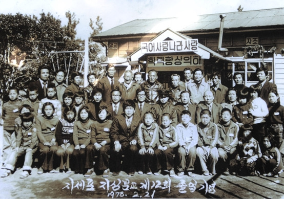 이런 곳에 학교가 있다니 놀라웠다. 지세포 지심분교의 12회 졸업기념사진(1978년)을 인터넷에서 구했다. 입구에 들어가자마자 보이는 건물이 학교의 교사이다. 지금은 오른쪽 건물 이외에는 아무것도 없는 마음 넓은 푸른 운동장옆으로 동백이 울창하고 동백꽃만 그 화려한 시절을 회상해주고 있었다. 지금은 마을 회관으로 사용하고 있다.