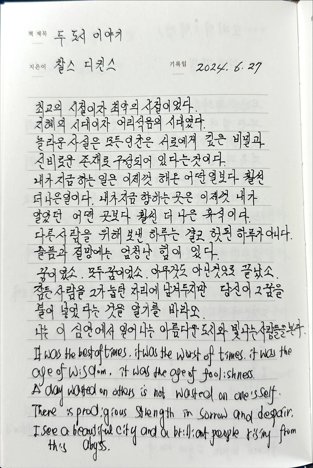 이 책은 우리에게 깊은 감동과 교훈을 주는 작품입니다. "두 도시 이야기"를 통해 우리는 인간의 본질적인 선함과 도덕적 선택의 중요성을 배우게 됩니다. 이는 기술이 아무리 발전해도 변하지 않는 가치입니다. 디킨스의 뛰어난 문학적 감각과 서사 능력은 이 책을 시대를 초월한 명작으로 만들어 주었으며, 우리는 이 작품을 통해 오늘날에도 여전히 중요한 교훈을 얻을 수 있습니다.