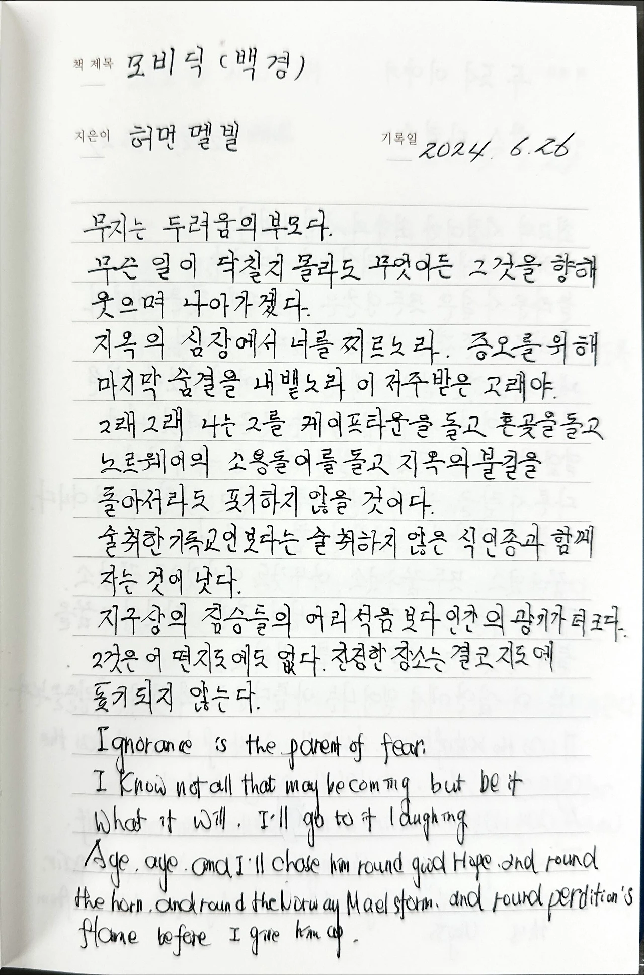 "모비딕"은 허먼 멜빌의 대표작으로, 거대한 흰 고래 모비딕을 쫓는 에이허브 선장의 집착과 집념을 그린 소설입니다. 이 작품은 단순한 고래 사냥 이야기를 넘어서 인간의 욕망과 자연에 대한 도전, 그리고 그로 인한 파국을 깊이 있게 탐구합니다. 책을 읽으면서 에이허브의 집념과 그것이 초래한 비극적인 결말을 통해 인간의 욕망이 얼마나 무서운 결과를 초래할 수 있는지를 깨닫게 되었습니다.