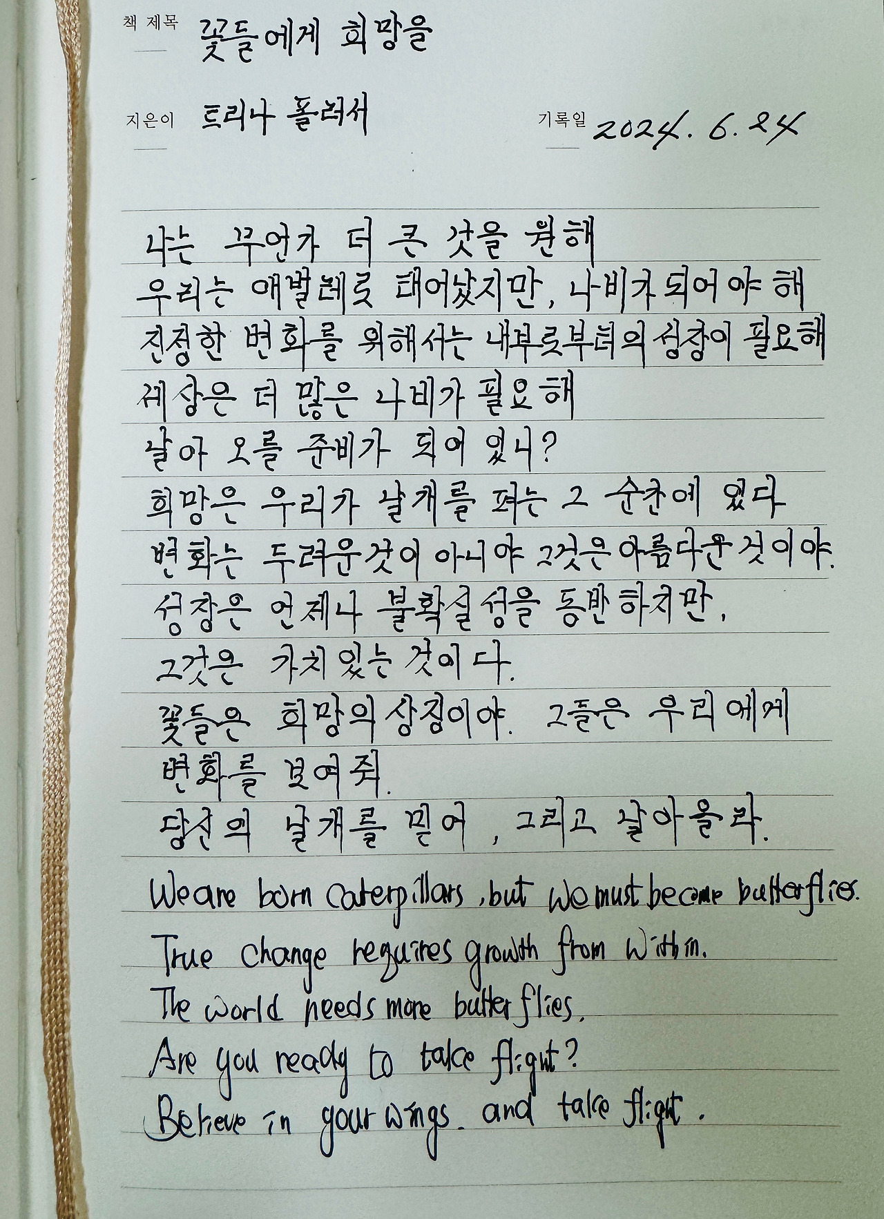 "꽃들에게 희망을"은 트리나 폴러스가 쓴 감동적인 동화로, 나비로 변신하기 위한 애벌레의 여정을 통해 삶의 진정한 의미와 희망을 일깨워주는 이야기입니다. 이 책은 성장, 변화, 그리고 꿈을 이루기 위한 노력의 중요성을 강조하며, 우리에게 많은 교훈을 전해줍니다. 현대 사회에서 인간성을 잃지 않고 살아가는 방법에 대해 이 책을 통해 생각해 봅니다.