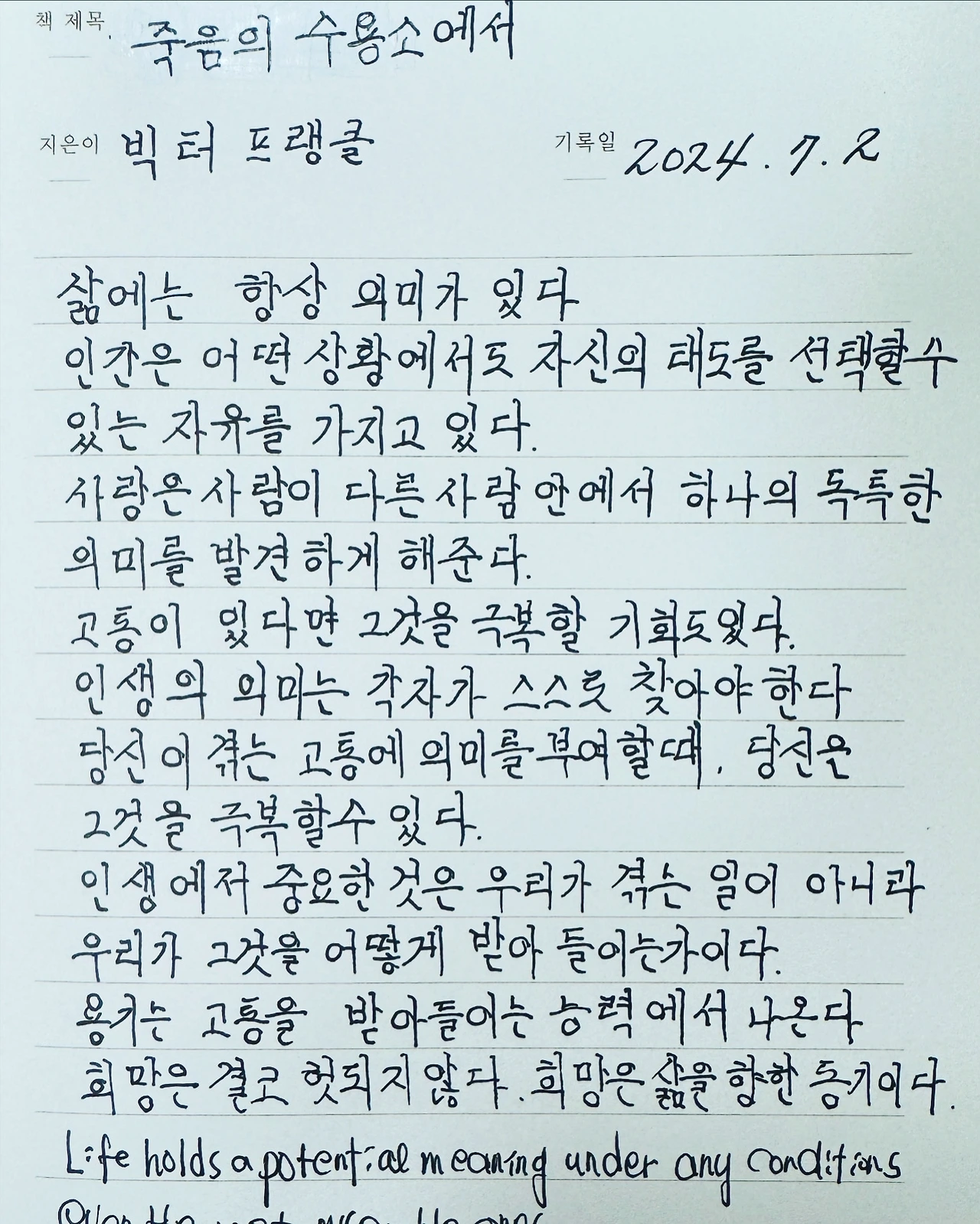 프랭클은 수용소의 끔찍한 환경에서도 삶의 의미를 찾아야 한다고 주장합니다. 그는 수용소에서 모든 것을 잃은 상황에서도 희망을 잃지 않고 인간의 존엄성을 지킬 수 있었다고 말합니다. 이와 같은 주장은 우리가 일상에서 직면하는 어려움과 고난 속에서도 자신만의 의미를 찾아야 한다는 교훈을 줍니다. 예를 들어, 학생들이 학업 스트레스나 개인적인 문제로 힘들어할 때, 그 안에서 작은 목표나 꿈을 찾는 것이 중요하다는 점을 시사합니다. 이는 또한 우리가 살아가며 직면하게 되는 여러 도전과 장애물 속에서 그 자체로서 의미를 찾고 삶의 방향성을 설정하는 것이 중요하다는 것을 일깨워줍니다.
