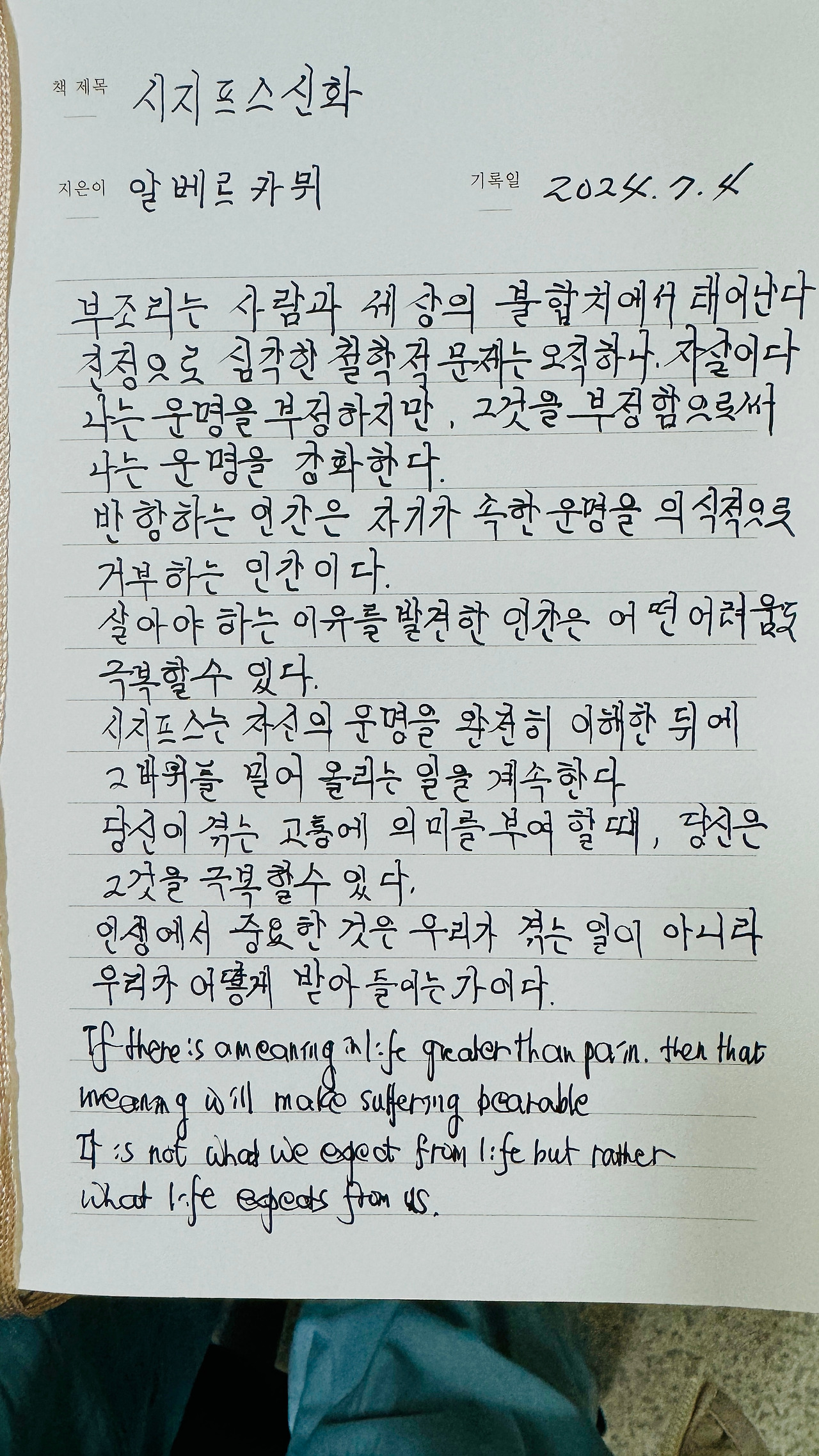 생성형 인공지능 시대를 살아가는 현대인들에게 시지프스의 신화는 우리의 삶도 때로는 끝없는 반복처럼 느껴질 수 있으며, 기술의 발전은 우리에게 새로운 도전과 부조리를 가져올 수 있습니다. 하지만 중요한 것은 우리가 어떻게 그 도전에 맞서고, 의미를 찾아가는지입니다. 우리는 이 새로운 시대 속에서 우리가 할 수 있는 일과 해야 할 일을 명확히 구분하고, 그 안에서 우리의 가치를 찾아야 합니다.