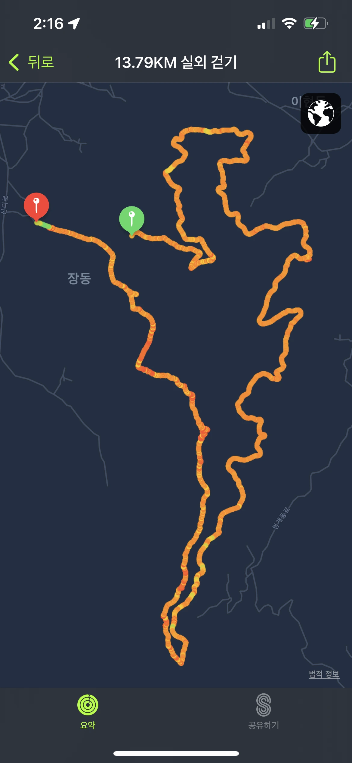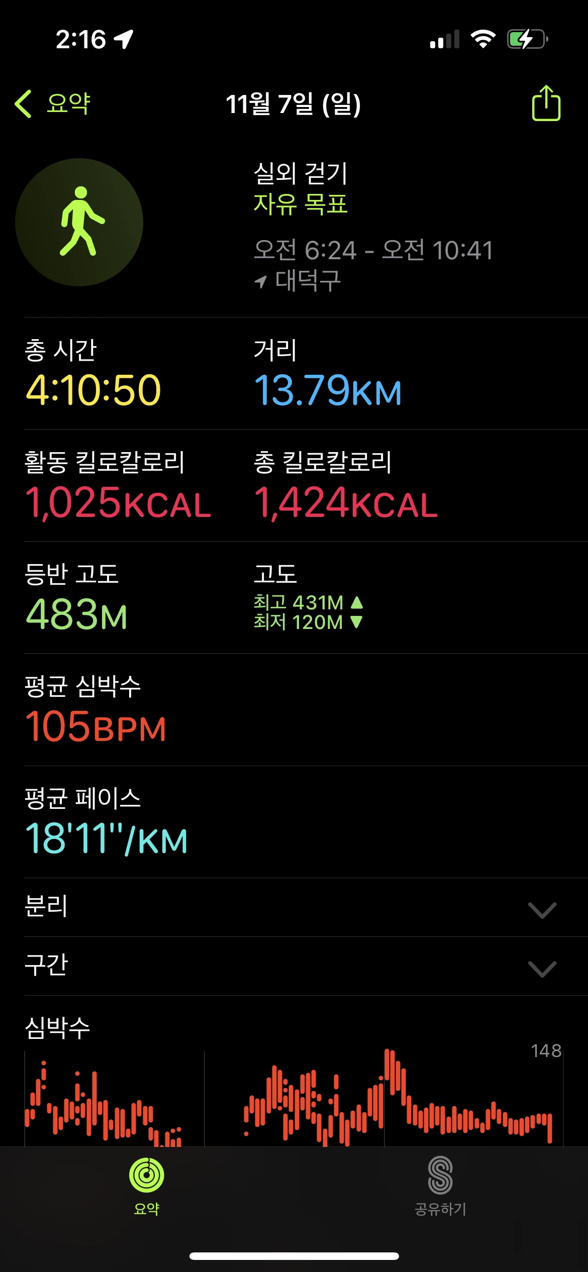 총4시간 10분을 걸었고 거리는 둘레길 대신 산정상인 산성을 가로질러 13.79이다. 중간에 심박수가 최고로 오른 이유가 산정상을 오르는 경사가 급해서 숨가쁜 길이었다.