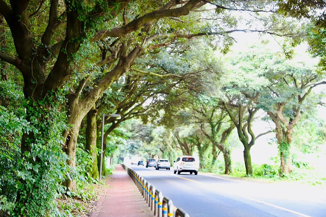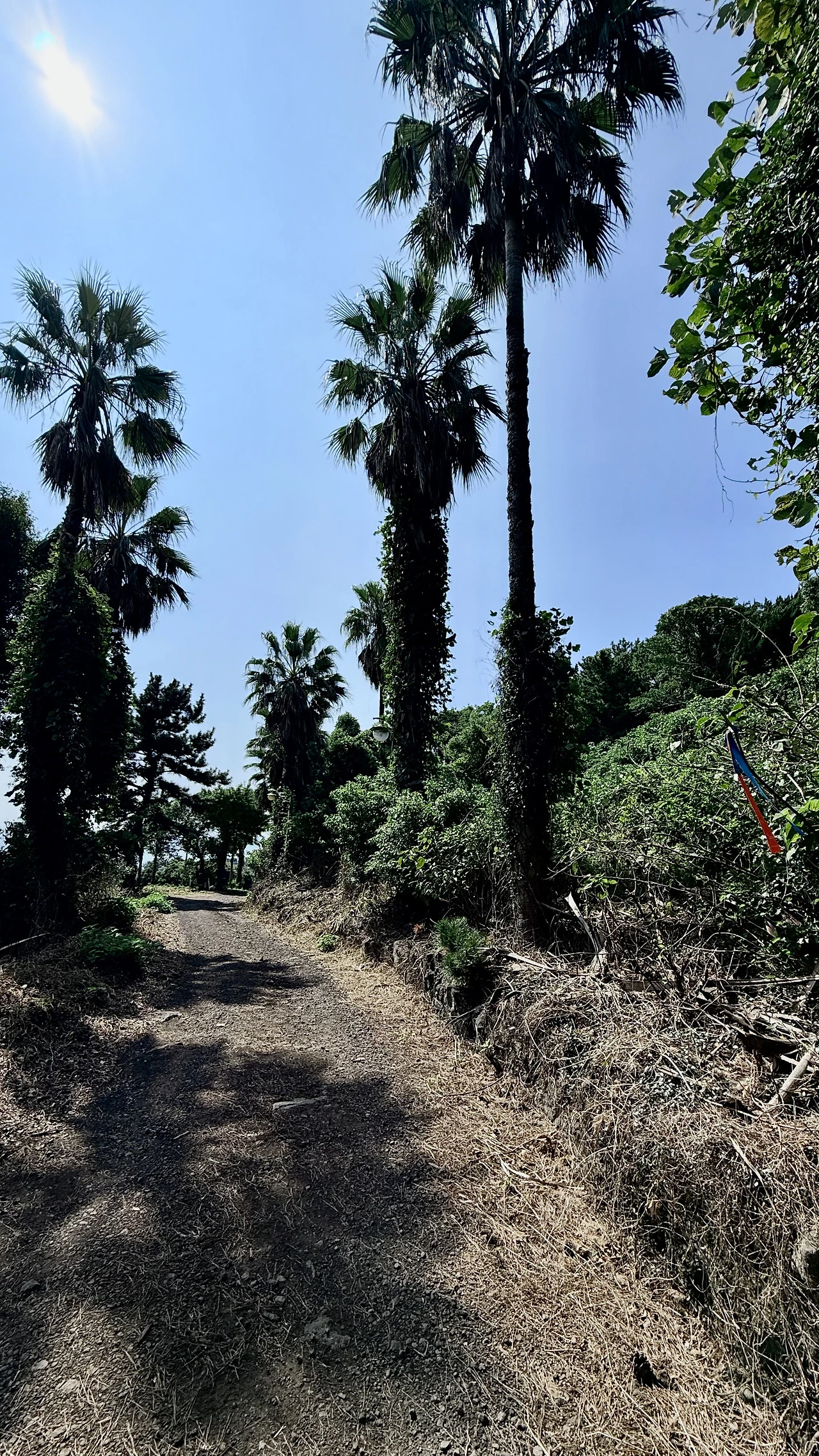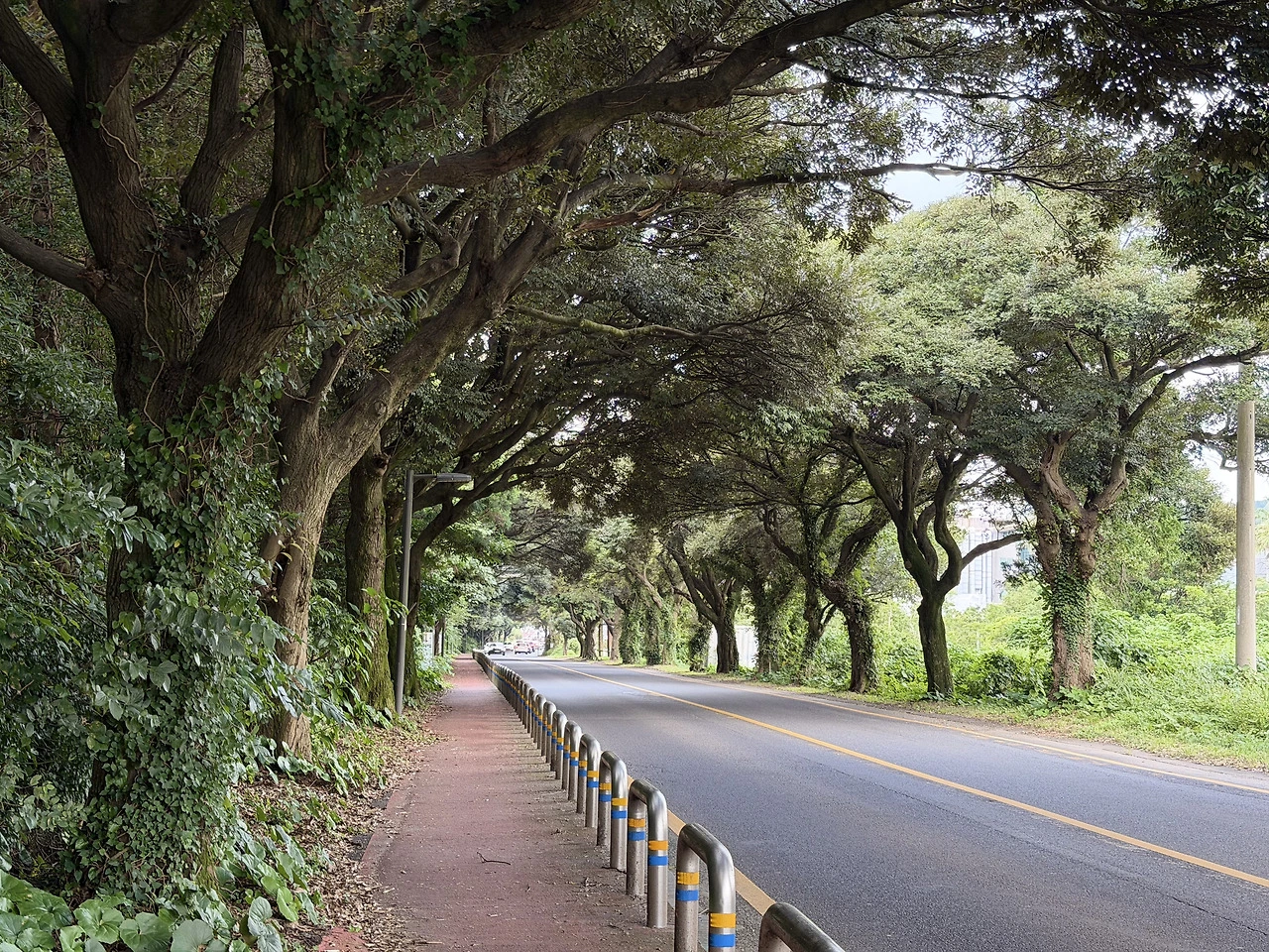 중문골프장 옆 천제연로를 따라 걸어가는 길이다. 중문단지 조선호텔길을 위로 올라 오다보면 이 길을 걷게 된다. 길 양가에 오랜 터주 대감같은 나무가 그 자리를 지켜주고 있어서 30대에도 40대에도 50대에도 작년에도 이 나무의 터널을 구경하게 되어 친숙하다. 여미지 식물원을 오른쪽으로 하고 맥도날드 식당에서 잠시 화장실을 청하고 나서 천제연로로 걷다 보면 이 길이 나온다.