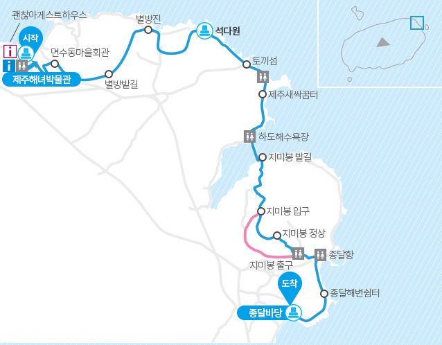 제주의 북쪽은 유난히도 아름답고 고운 해수욕장이 많다. 세화 해수욕장을 마지막으로 걸었는데 다시 그 세화 해수욕장의 끝을 시작으로 걷기 시작한다. 구좌읍의 바다를 바라보며 시작하여 마을과 밭길로 1/3, 바닷길로 1/3, 그리고 오름으로 1/3 등 제주 동부의 자연을 고르게 체험하는 길이다. 제주의 동쪽 땅끝이라는 뜻을 지닌 지미봉 위에서 360도 어디 한 곳 가릴 데 없이 제주가 펼쳐진다. 시흥초등학교, 말미오름, 당근밭, 감자밭이 한눈에 들어오고 한 켠에 성산일출봉이 떠있는 푸른 제주의 동쪽 바다와 용눈이오름 다랑쉬오름이 있는 제주의 동부 오름 군락이 밀려든다.