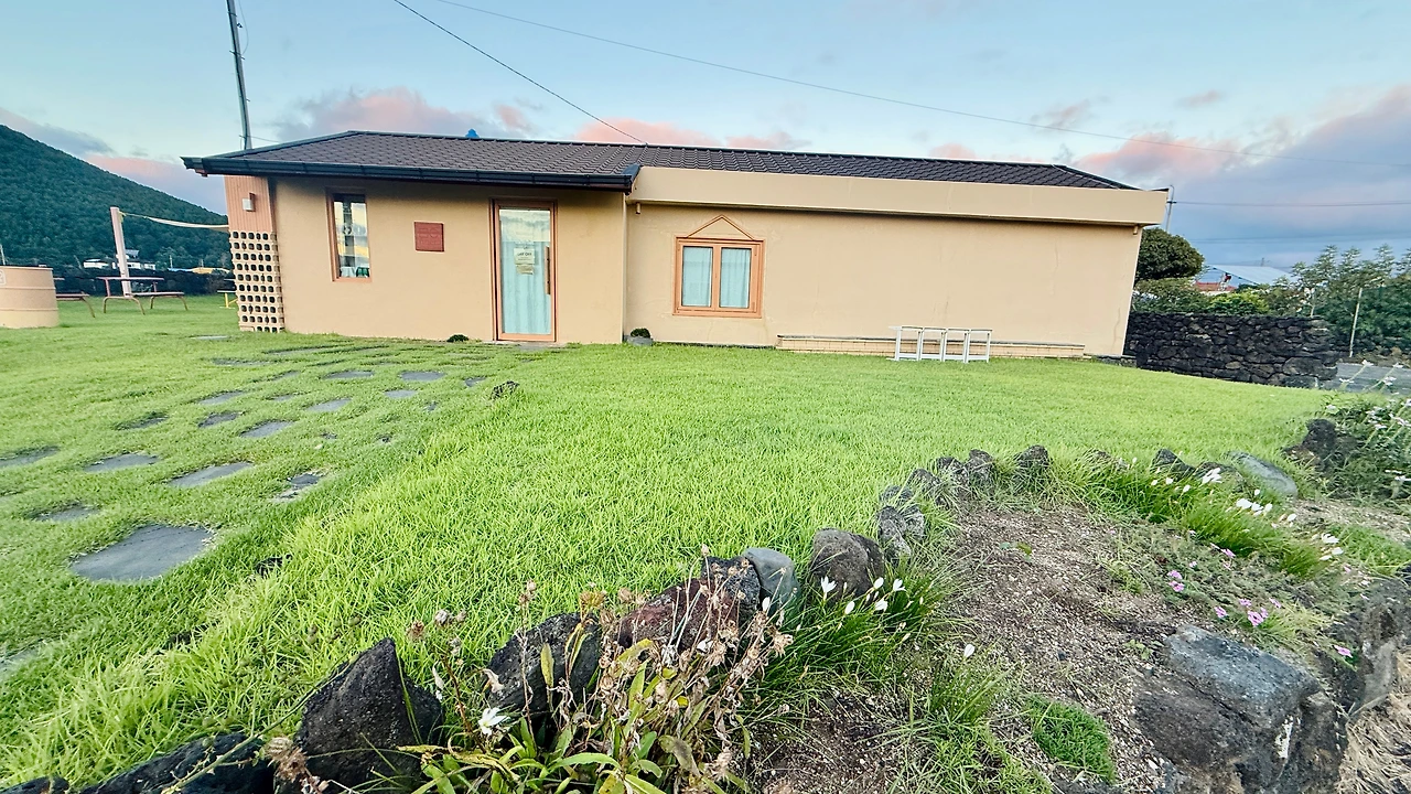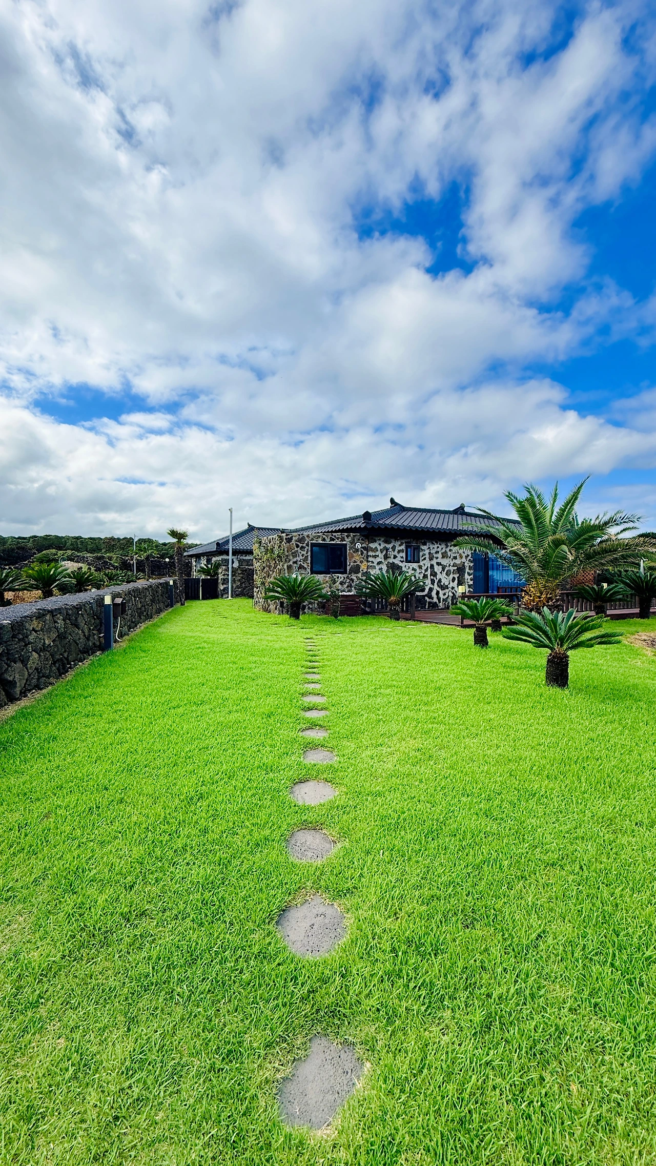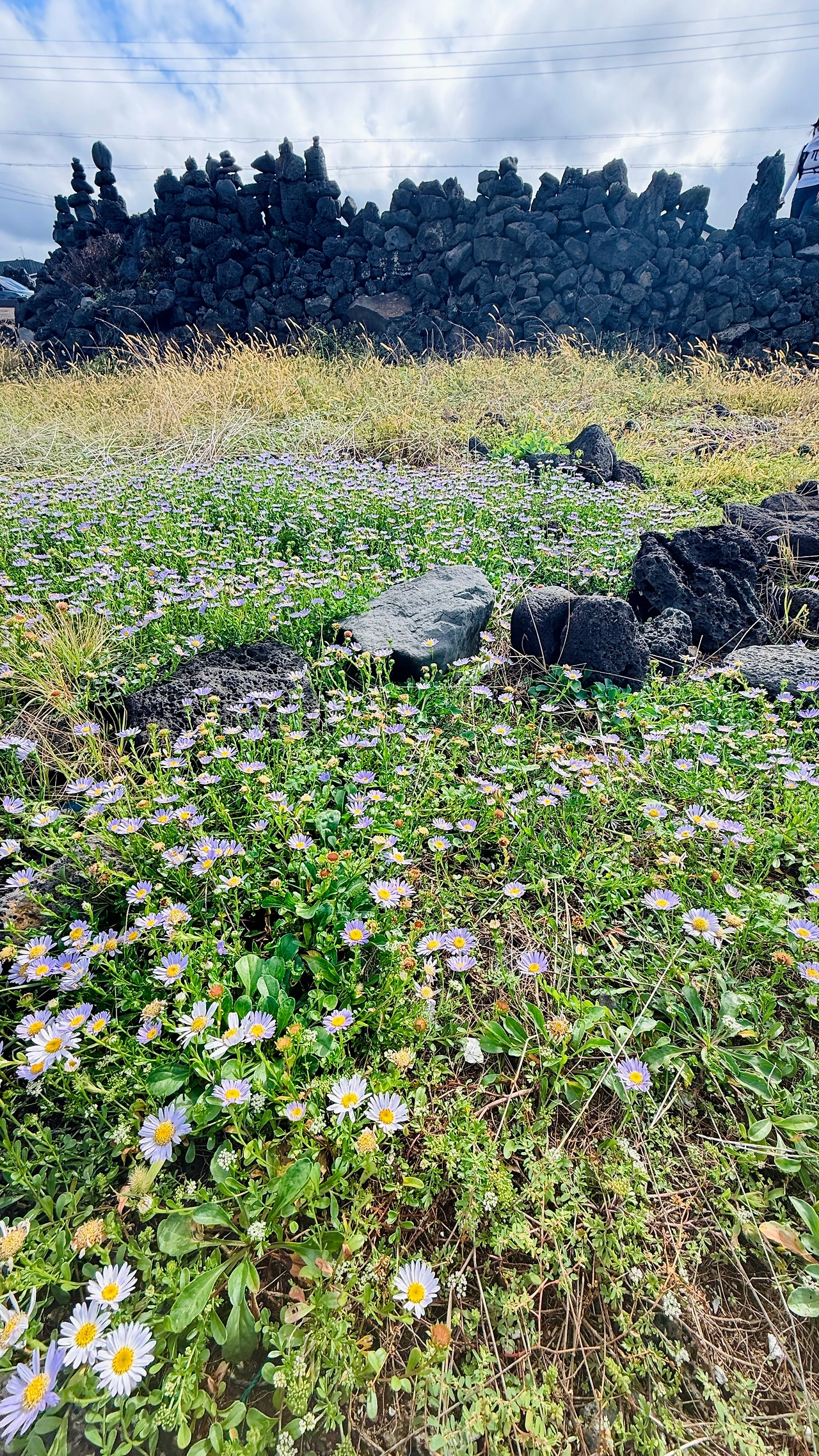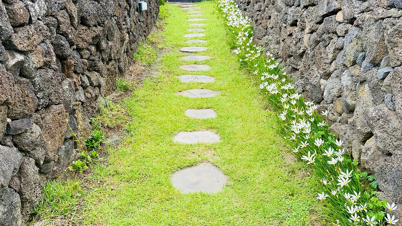 제주 담벼락 상에 잔뒤를 깔고 납딱한 바위로 발 디딤돌로 사용하면 입구가 누군가를 소중하게 맞이할 것 같은 느낌이 든다.