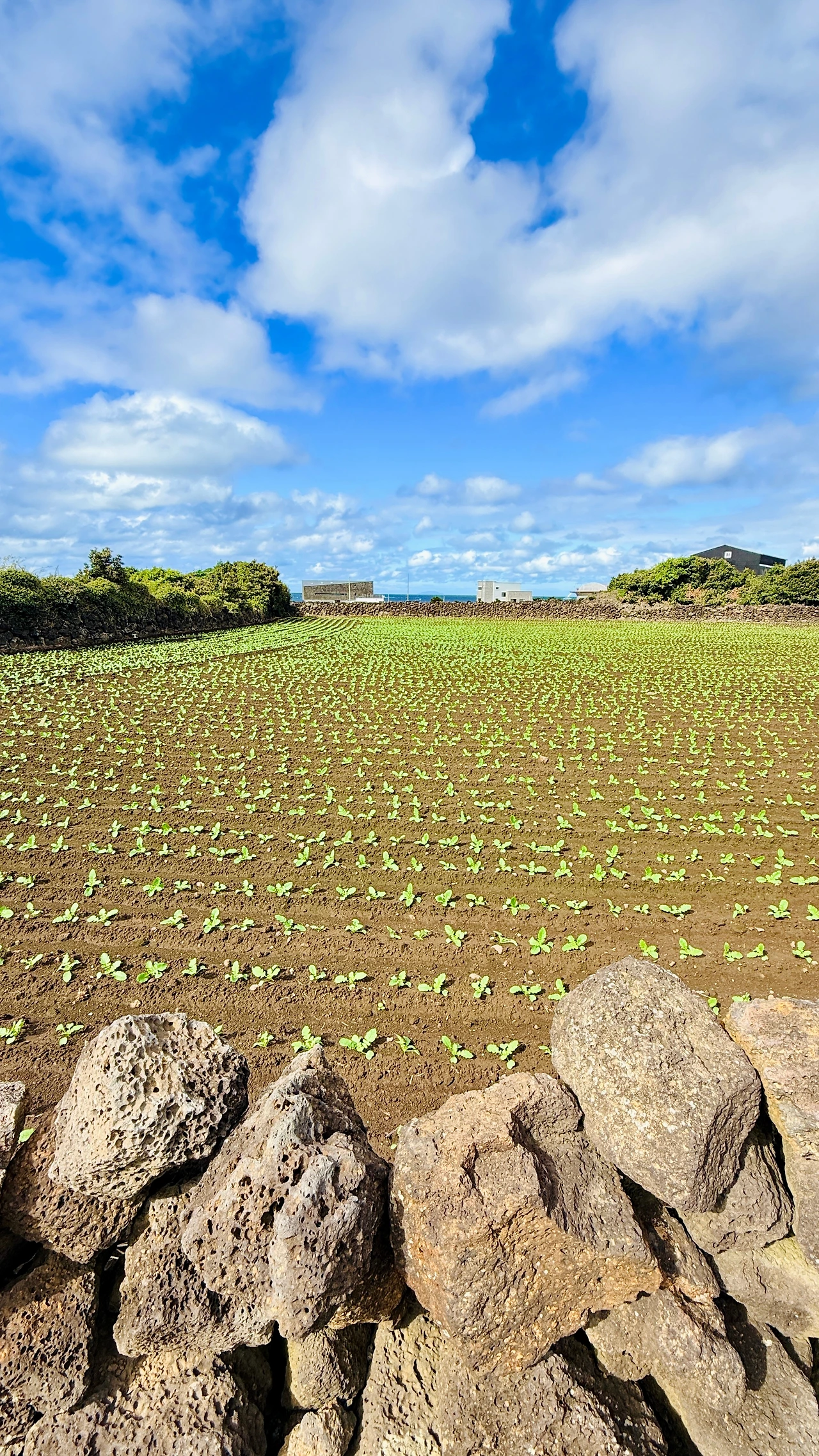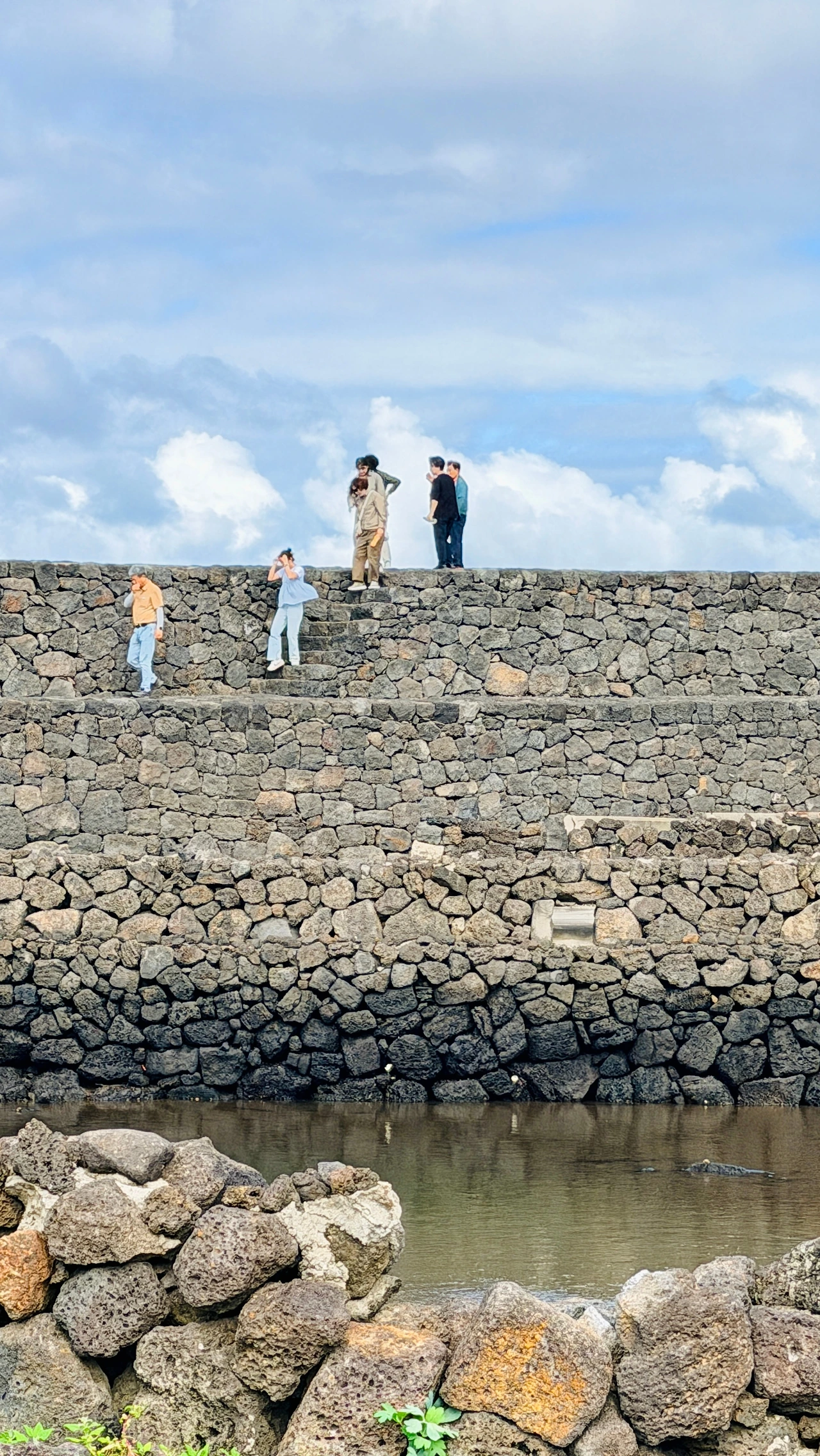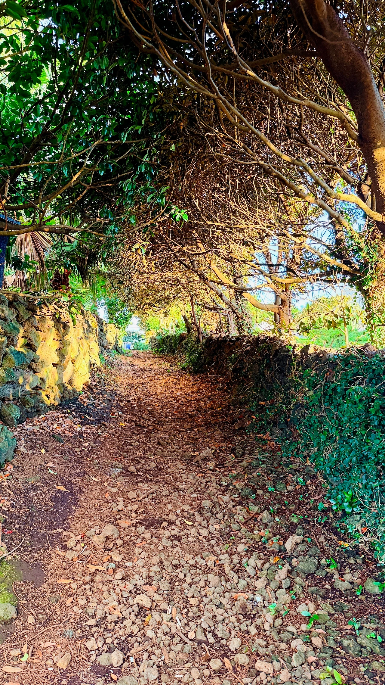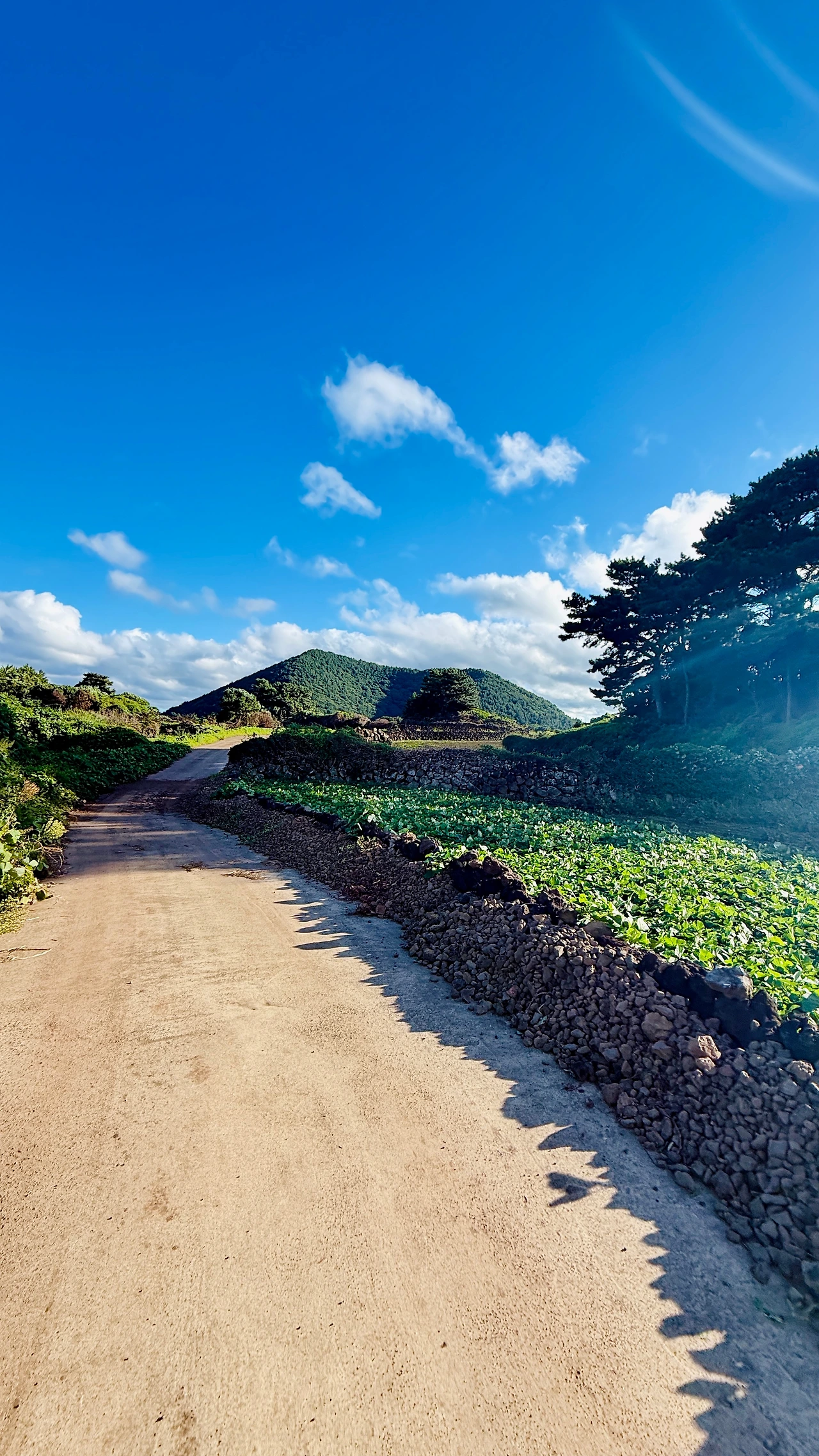 제주 담벼락 상에 잔뒤를 깔고 납딱한 바위로 발 디딤돌로 사용하면 입구가 누군가를 소중하게 맞이할 것 같은 느낌이 든다.