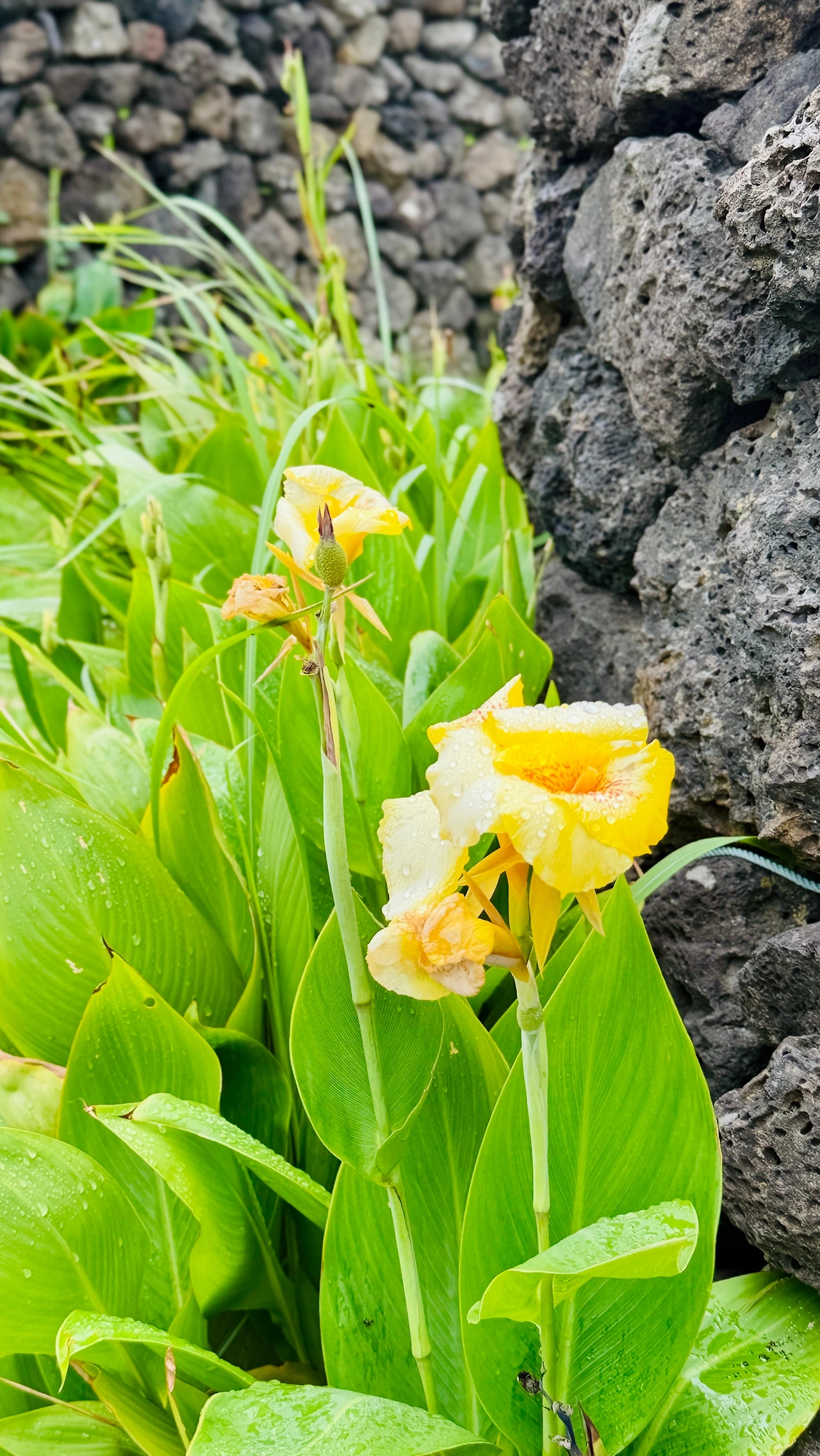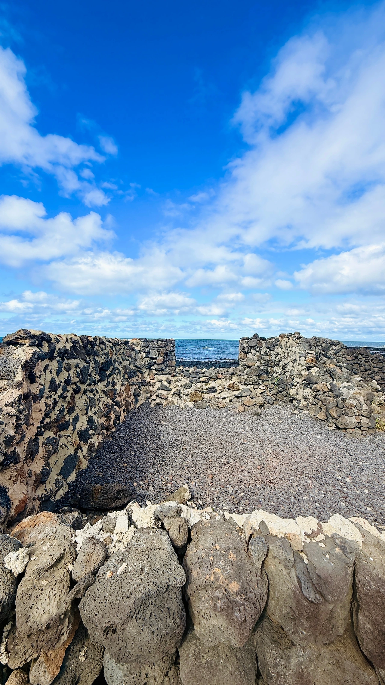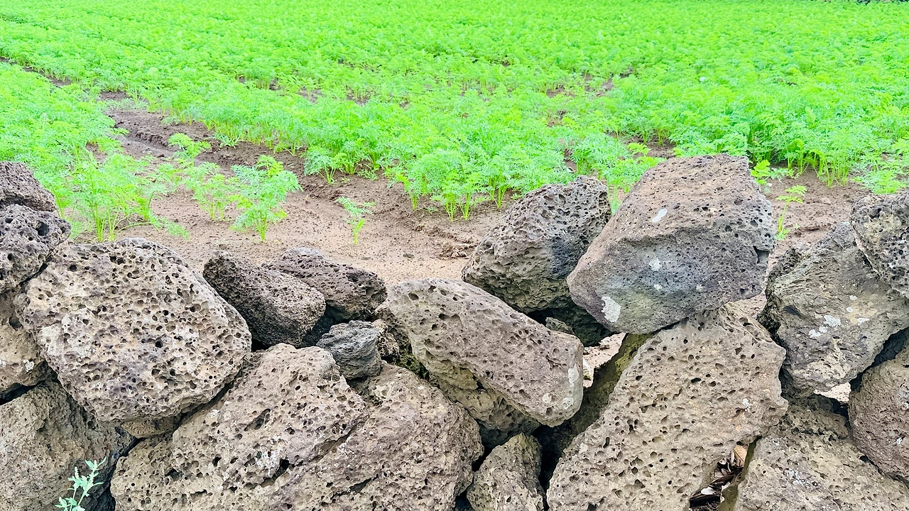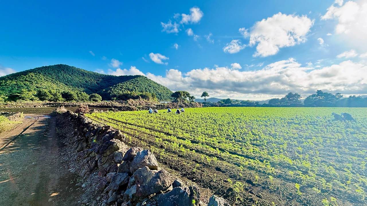 제주 담벼락 상에 잔뒤를 깔고 납딱한 바위로 발 디딤돌로 사용하면 입구가 누군가를 소중하게 맞이할 것 같은 느낌이 든다.