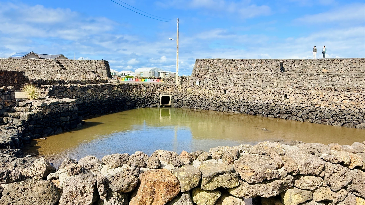 이 시설을 원담(垣潭) 또는 갯담이라고부른다. 밀물 때 바닷물이 돌담 안쪽으로 들어 왔다가 다시 썰물이 되어 빠져나가면 돌담 안에 갇혀 빠져 나가지 못한 물고기(주로 자리돔, 멸치 등)를 잡는 전통적인 어로 방식이다. 밀물과 썰물의 시간을 잘 맞추어 방문하면 갯담 안에 있는 물고기의 모습을 운 좋게 볼 수 있다. 저 멀리 뒷편에 토끼섬이 보인다.