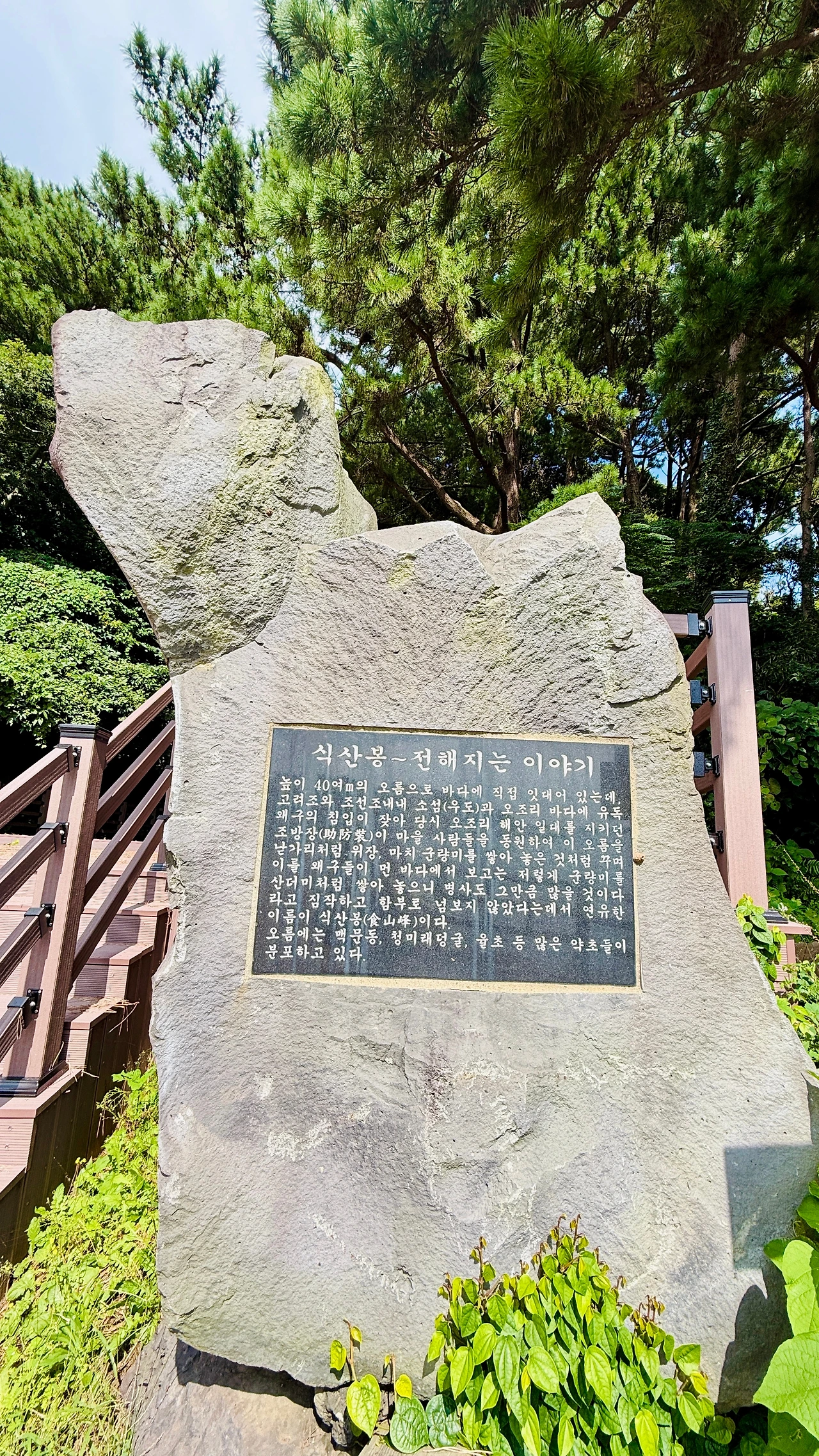 높이 40여 m의 오름으로 바다에 직접 잇대어 있는데, 고려조와 조선조 내내 소섬(우도)과 오조리 바다에 유독 왜구의 침입이 잦아 당시 오조리 해안 일대를 지키던 조방장(助防裝)이 마을 사람들을 동원하여 이 오름을 난 가리처럼 위장, 마치 군량미를 쌓아 놓은 것처럼 꾸며 이를 왜구들이 먼바다에서 보고는 저렇게 군량미를 산더미처럼 쌓아 놓으니 병사도 그만큼 많을 것이다라고 짐작하고 함부로 넘보지 않았다는데서 연유한 이름이 식산봉(食山峰)이다. 제주 동쪽에 끄터머리에 있는 산봉우리인 만큼 왜적들에게 노출이 쉽게 되었으리라. 오름에는 맥문동, 청미래덩굴, 율초 등 많은 약초들이 분포하고 있다.