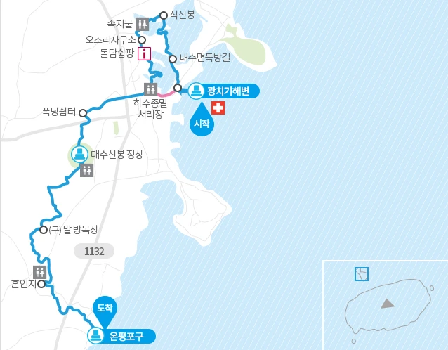 총 길이15.8Km소요시간4-5시간난이도★★☆: 쉽다고 하지만 몸이 성하지 않은 내겐 쉽지 않았다. 그나마 평소에 걷기 연습을 해왔기에 부대끼지 않았지만 길 하나하나에 스토리를 품고 있는 제주는 어느 둘레길보다 아름답다. 갔던 길을 걸어도 계절과 시간에 따라 날씨에 따라 누구와 함께 걷는가에 따라 그 느낌이 사뭇 다르다.