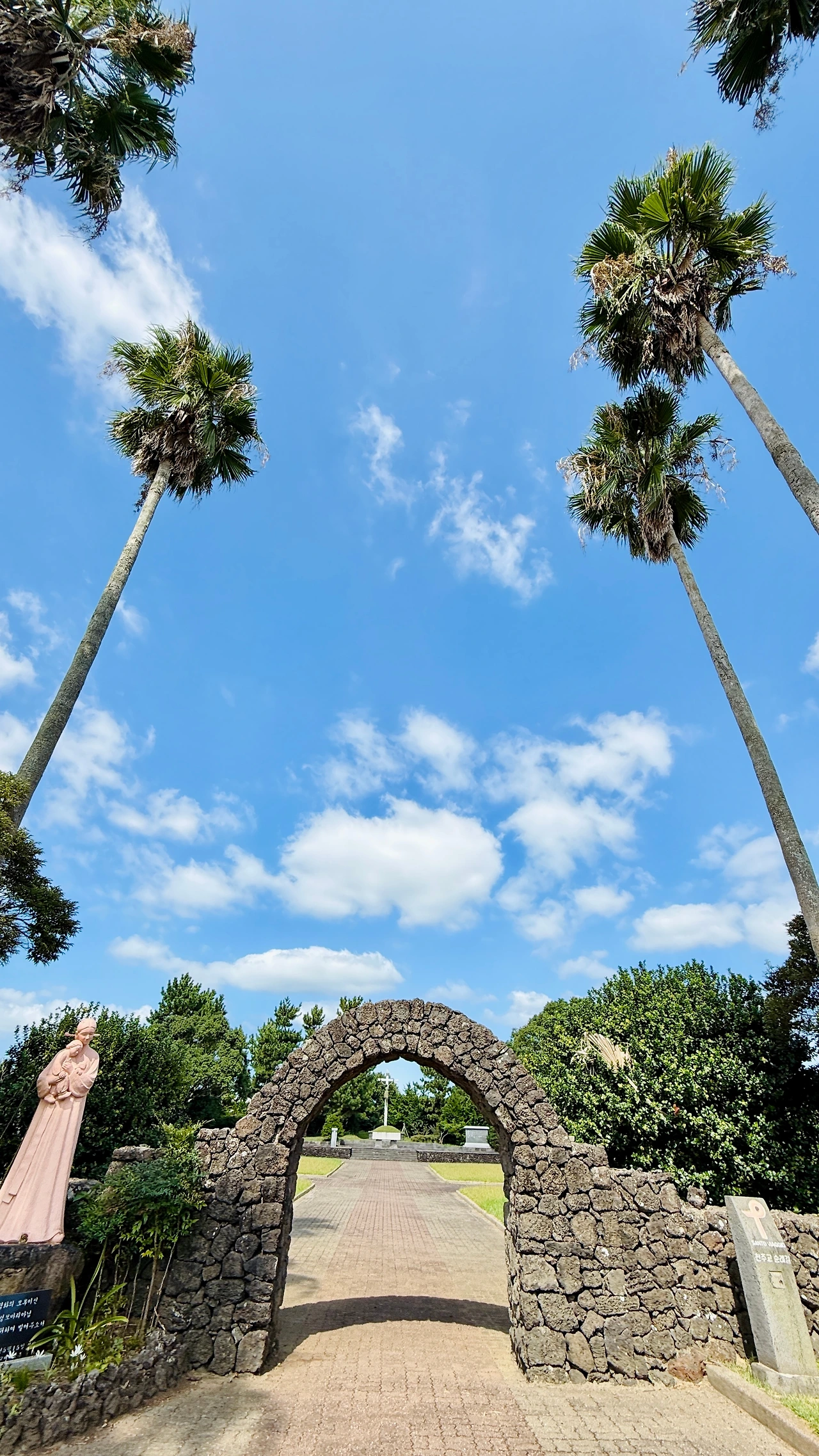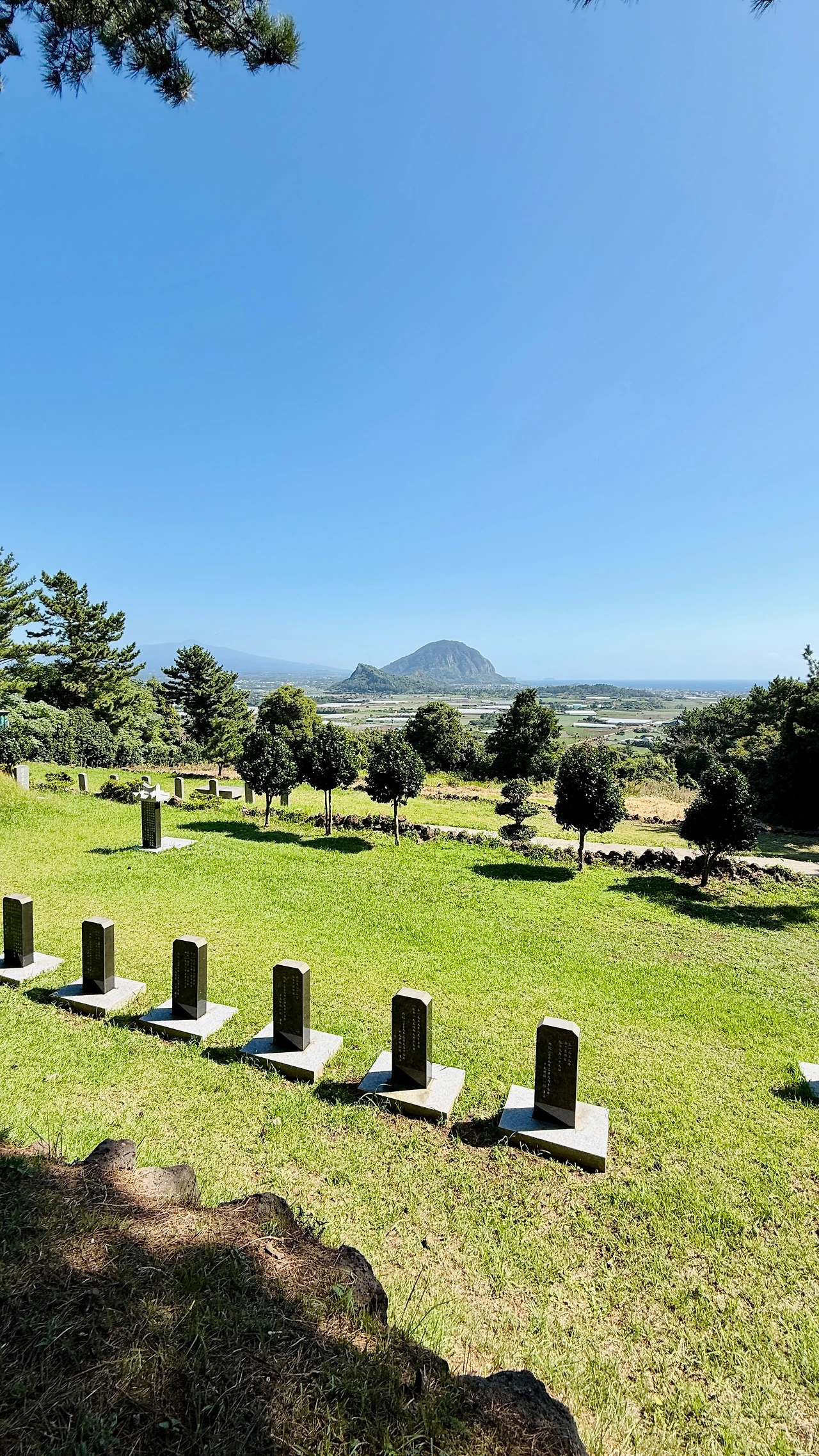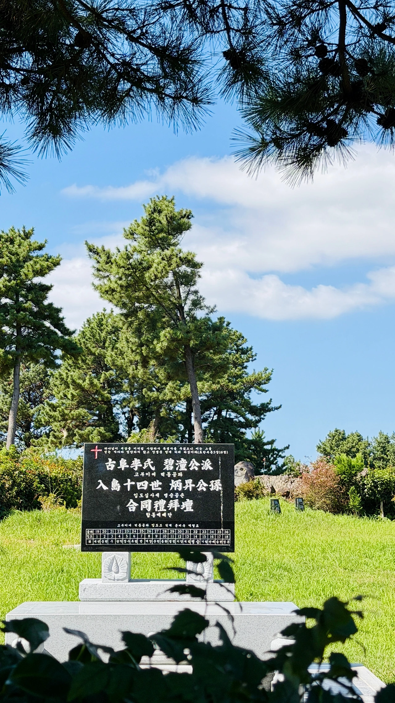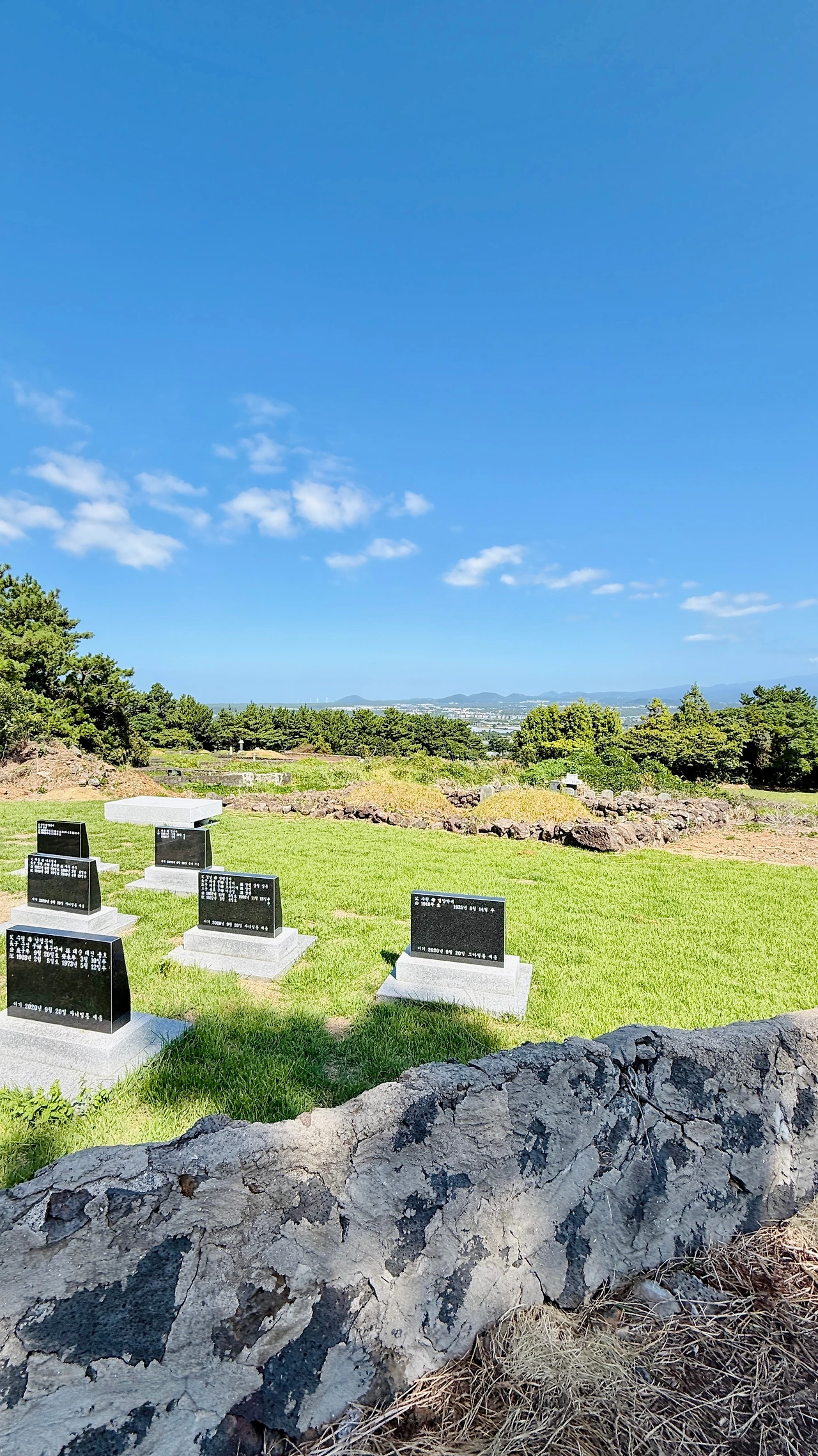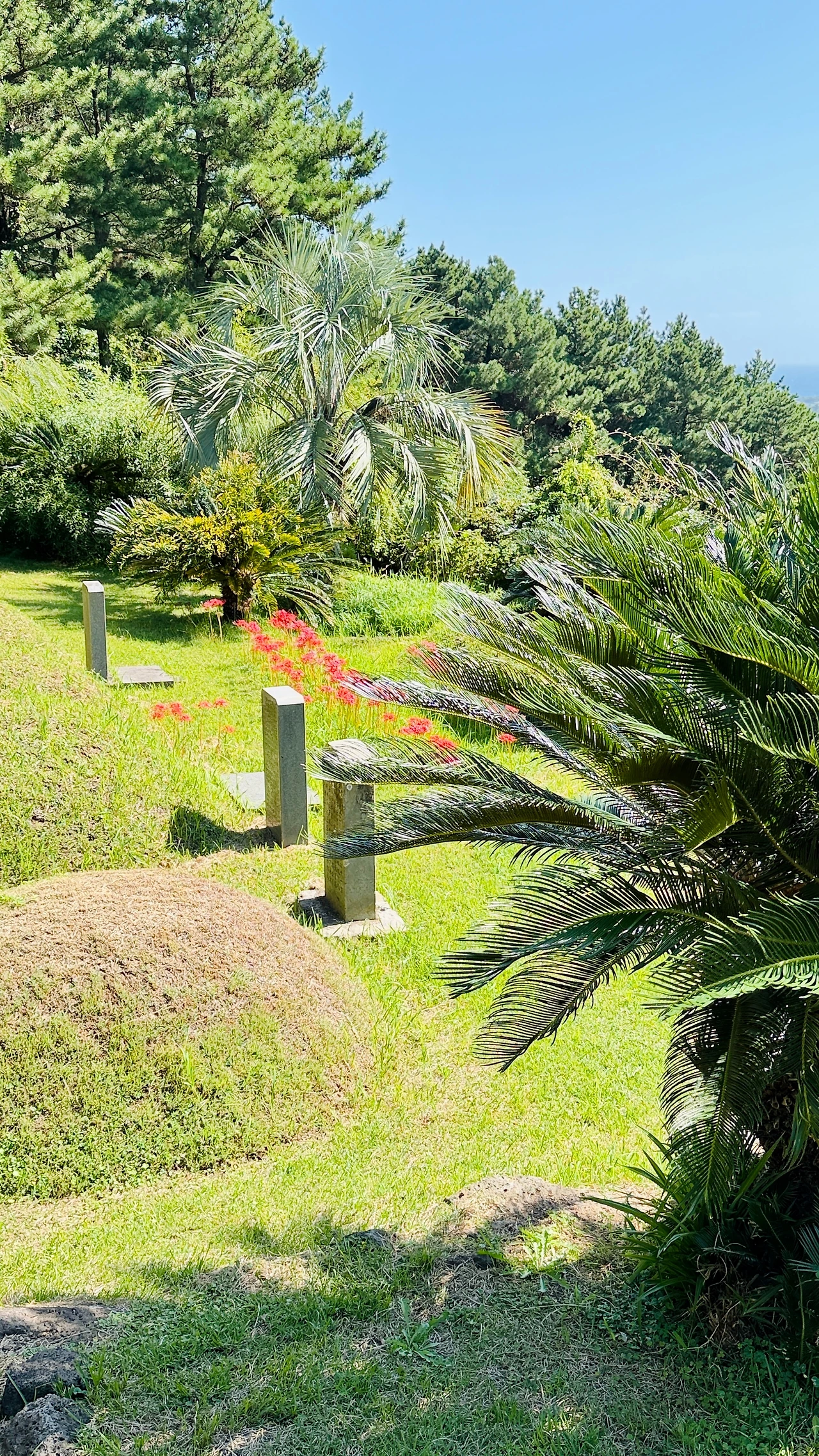육지의 묘지와 다른 것이 보입니까? 야자수가 심어져 있습니다. 동백이나 백일홍나무들은 비슷하게 심어져 있습니다. 봉분이 육지처럼 그렇게 만들어져 있네요. 최근처럼 보입니다. 옛날 제주 묘지는 화산돌을 둘레로 사각으로 해서 무덤이 만들어져 있는데 이 무덤이 좀 다르네요.