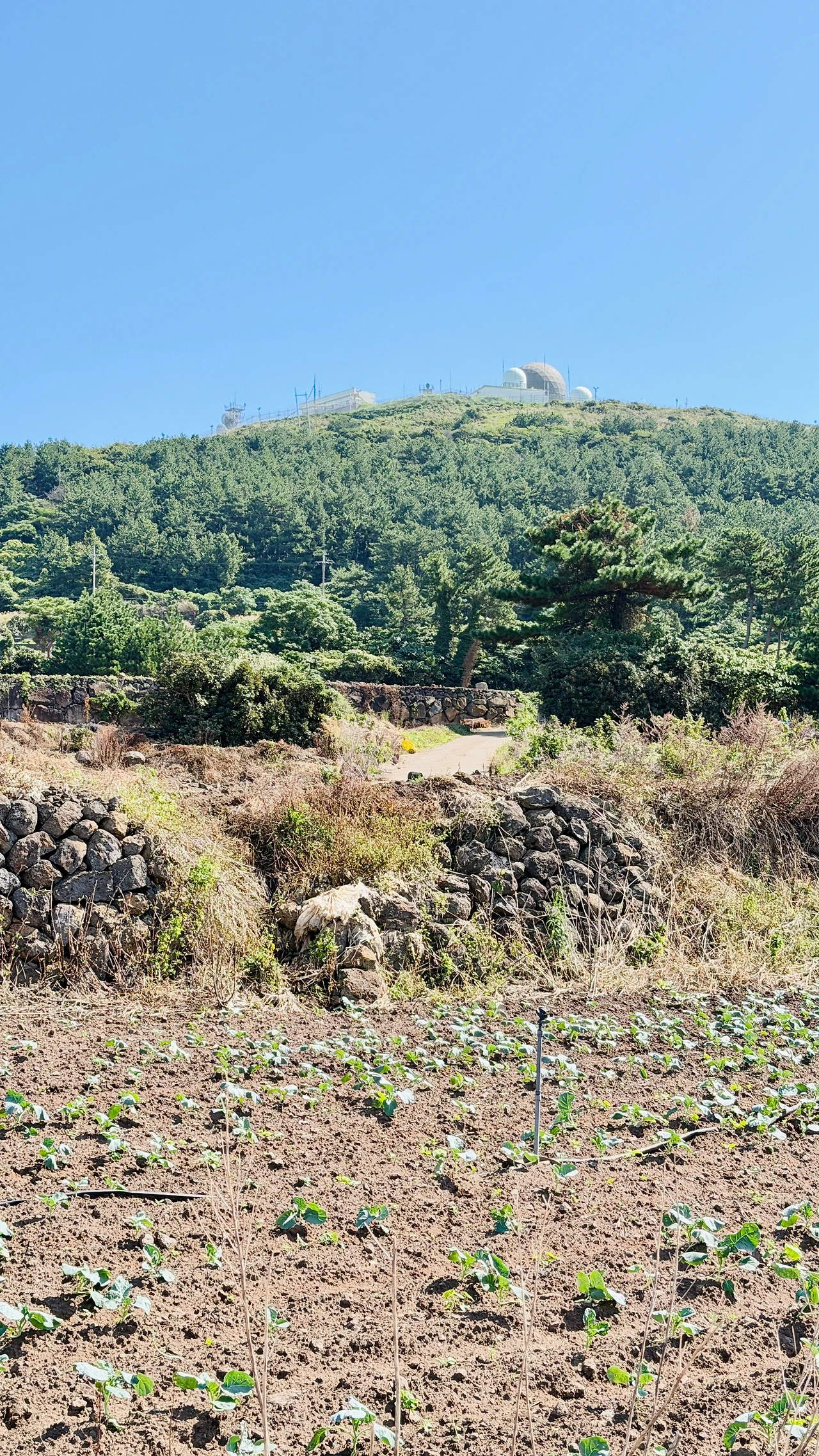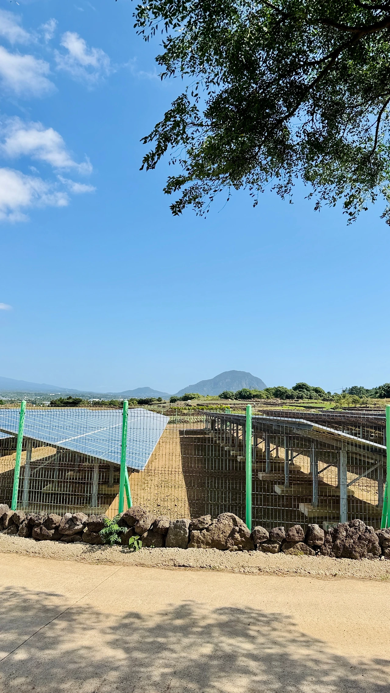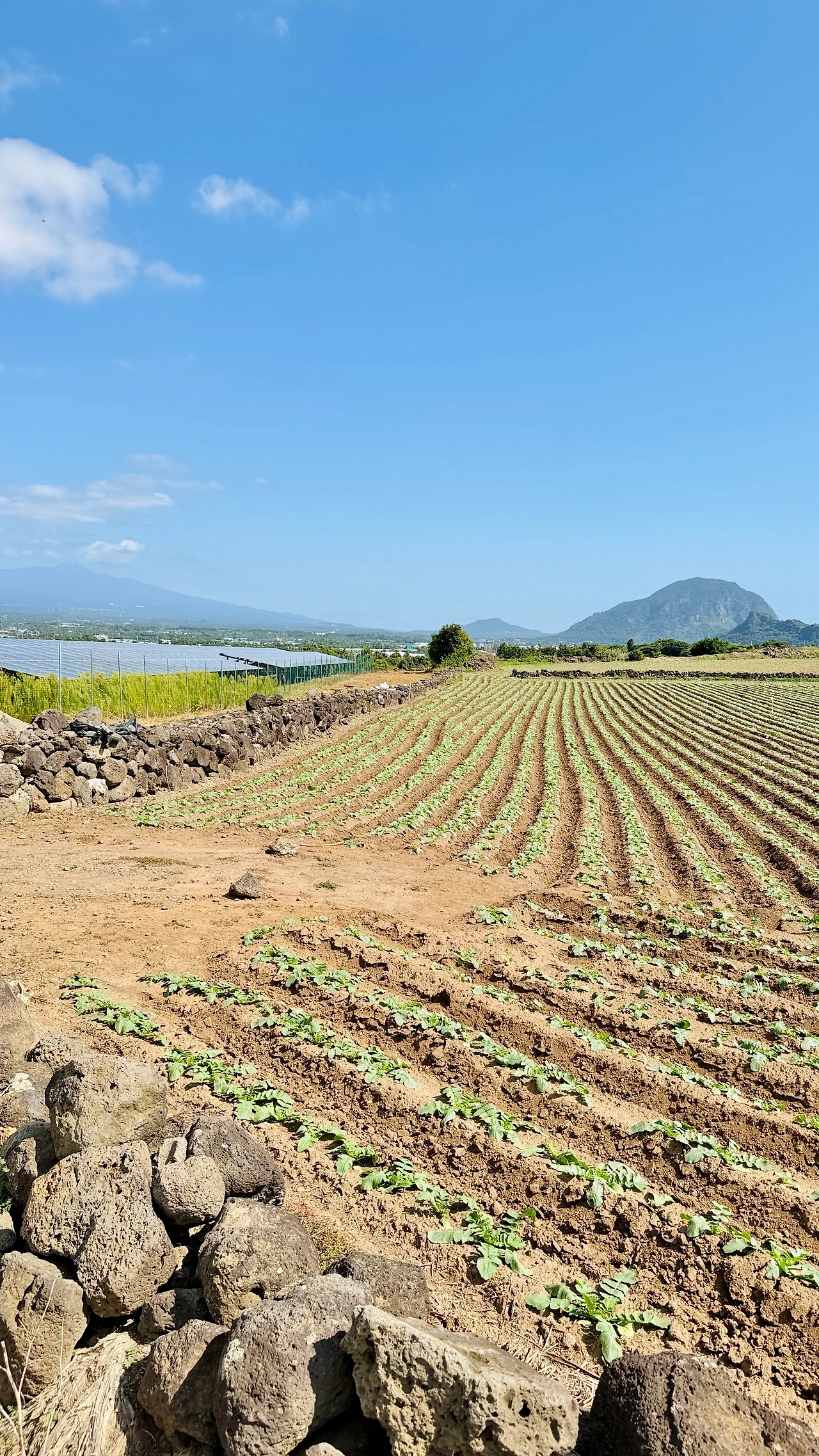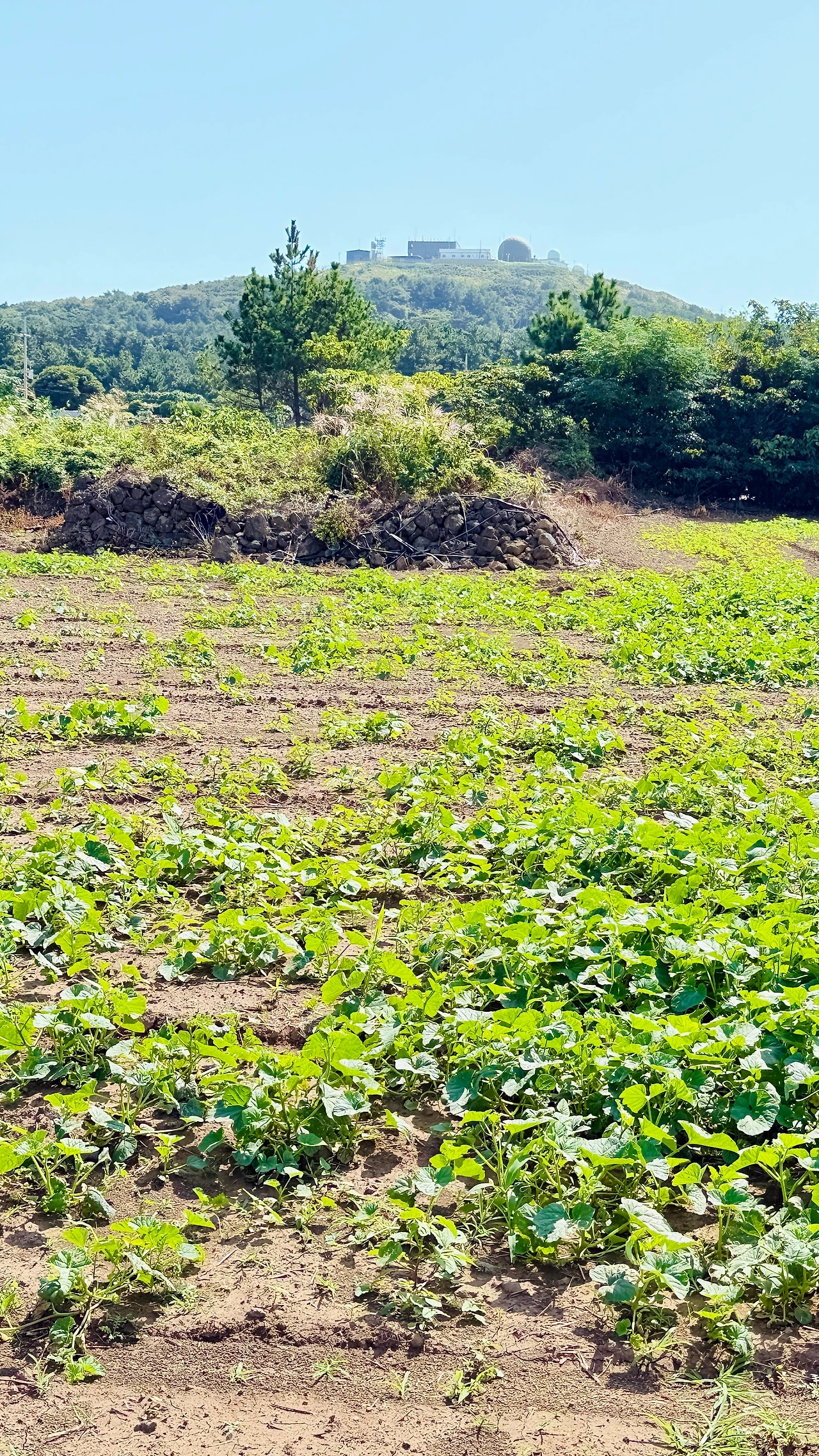 왼쪽에 보이는 덩굴은 참외 덩굴인데 지금부터 시작할리는 없고 왜 심어져 있는지 모르겠네요. 중간에 있는 태양열전기패널도 여기 제주를 비켜나가지 못하네요. 제주에도 밭농사 대신에 전기농사가 서서히 시작되려는 모양입니다. 오른쪽 채소는 무입니다. 다른 코스에서는 이제 씨를 뿌려서 스프링클러로 싹을 틔워서 키우는 수준이었는데 여기는 생장속도가 김장 시즈보다 빨리 출하할 수 있는 정도로 다마가 굵네요.